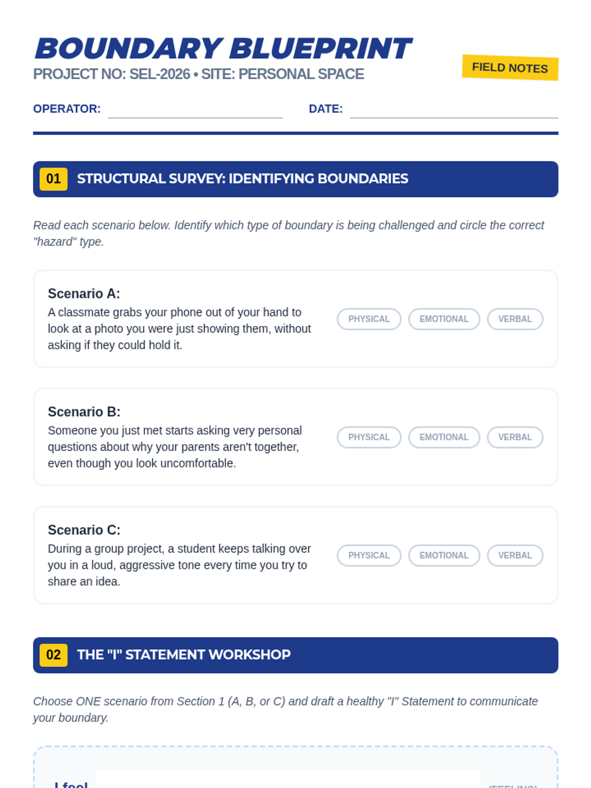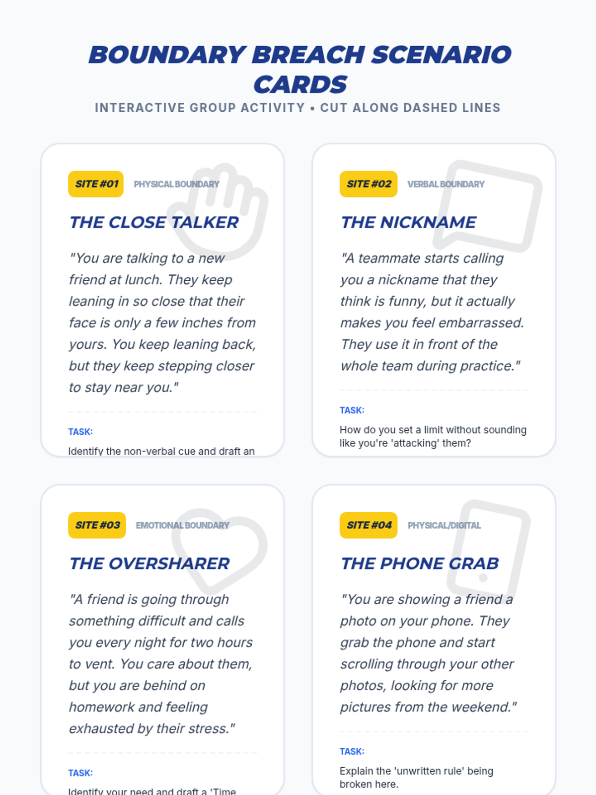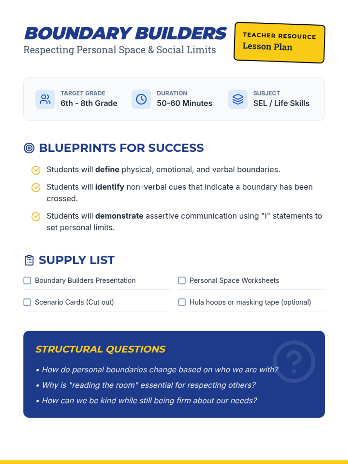 A comprehensive social-emotional learning lesson for middle schoolers focusing on defining, identifying, and communicating personal boundaries across physical, emotional, and verbal contexts. Students use a 'construction' metaphor to build healthy interpersonal habits.