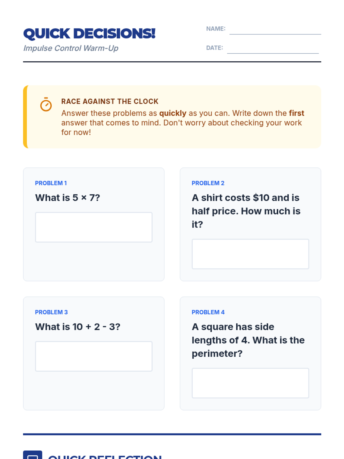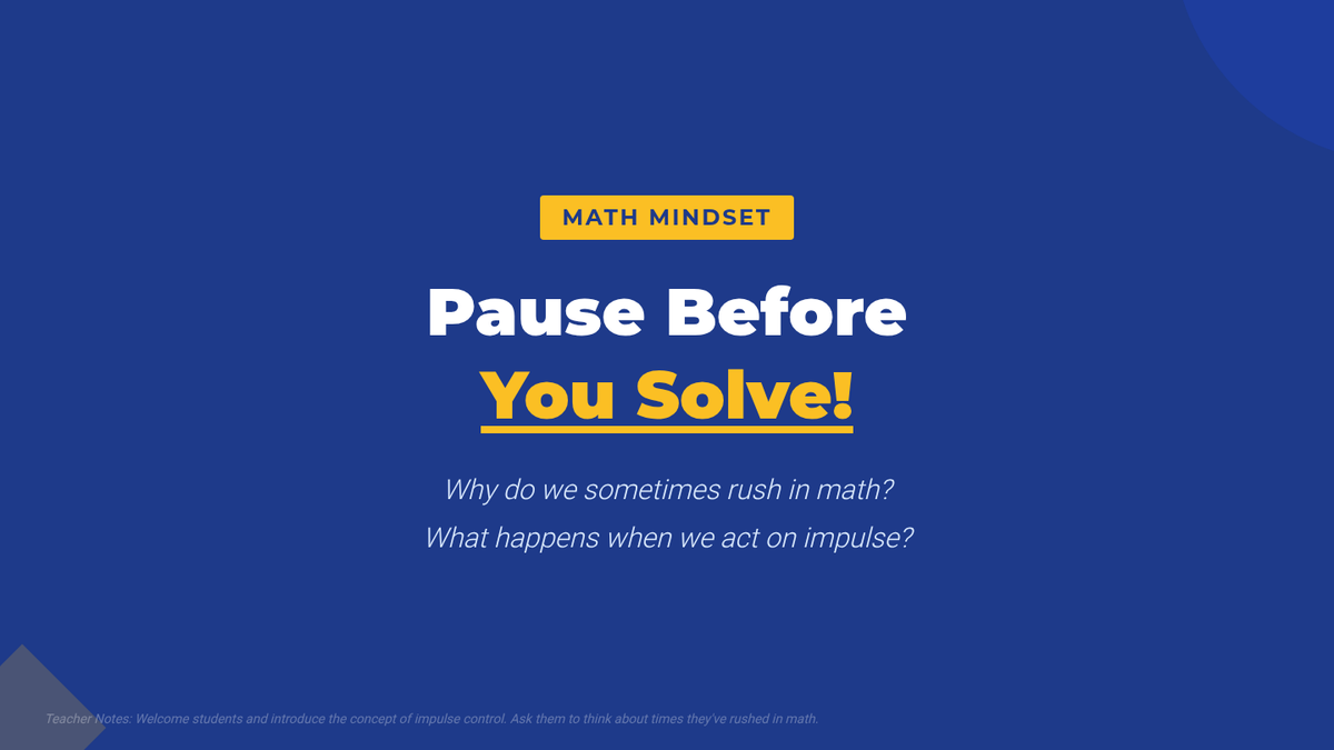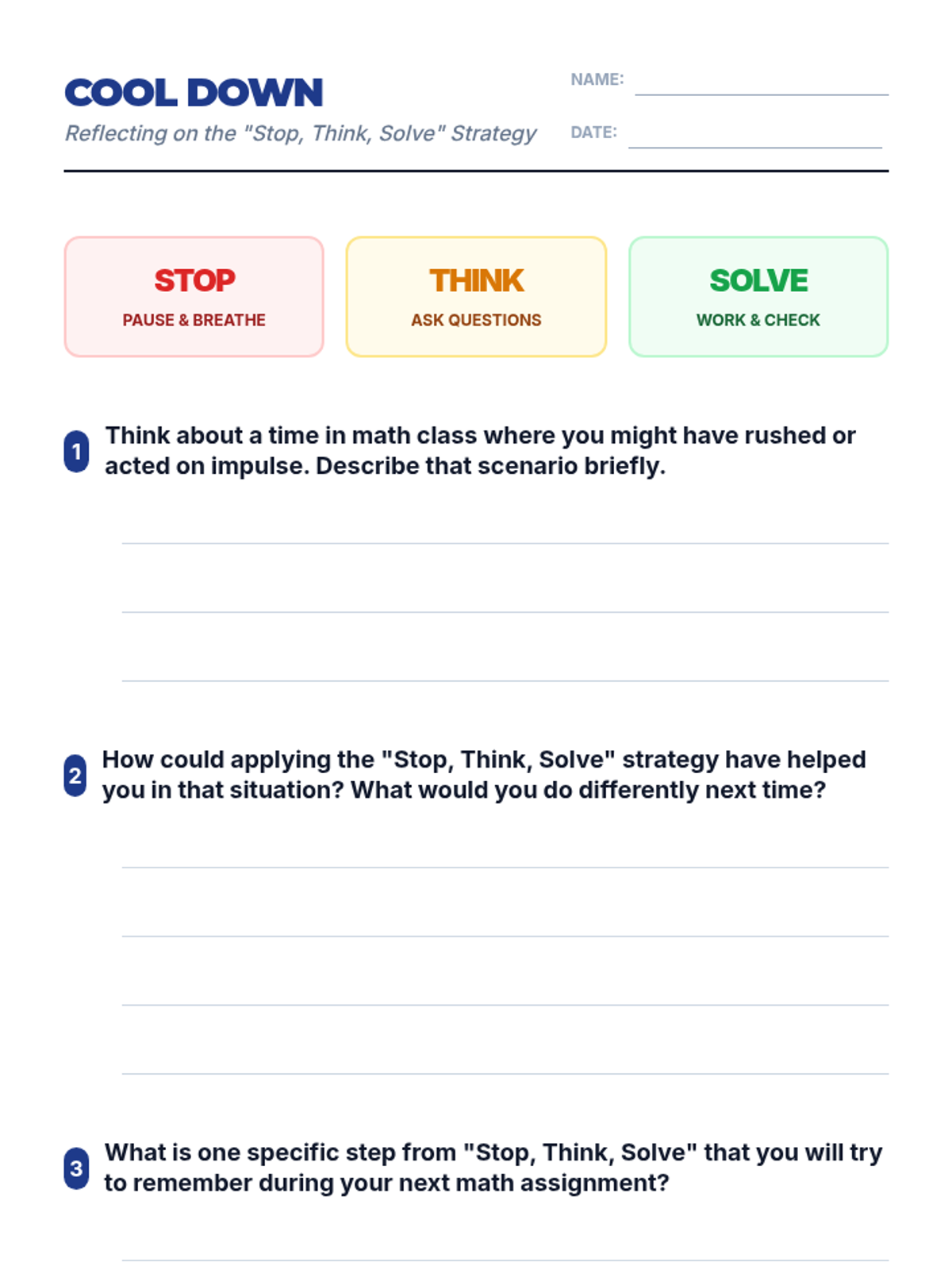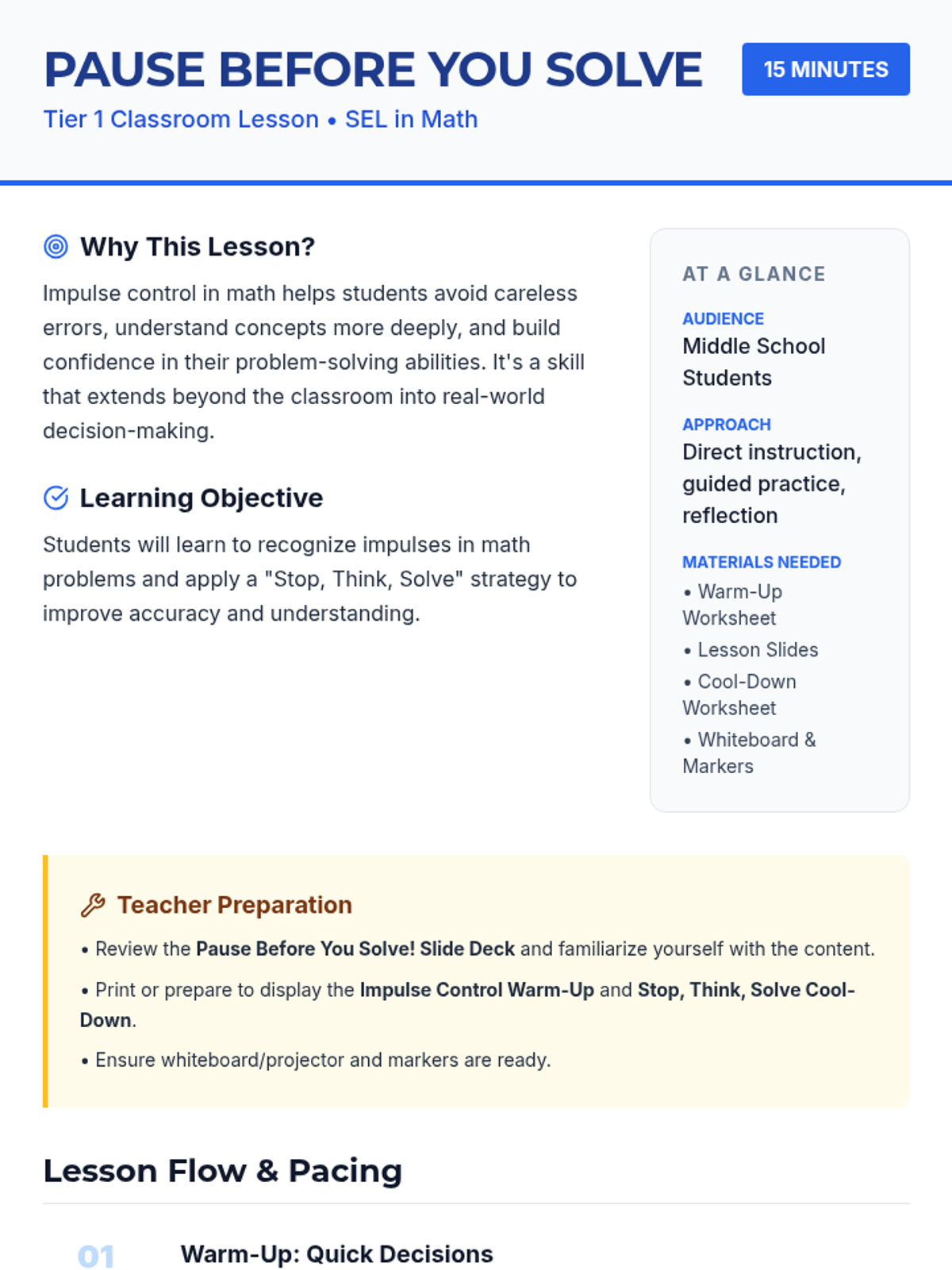 A 15-minute Tier 1 SEL lesson for middle schoolers focusing on impulse control during math. Students learn the 'Stop, Think, Solve' strategy to reduce careless errors and improve accuracy.