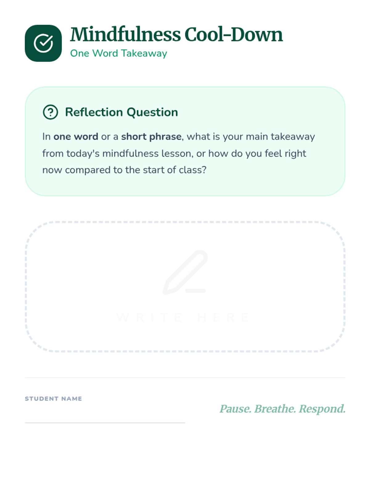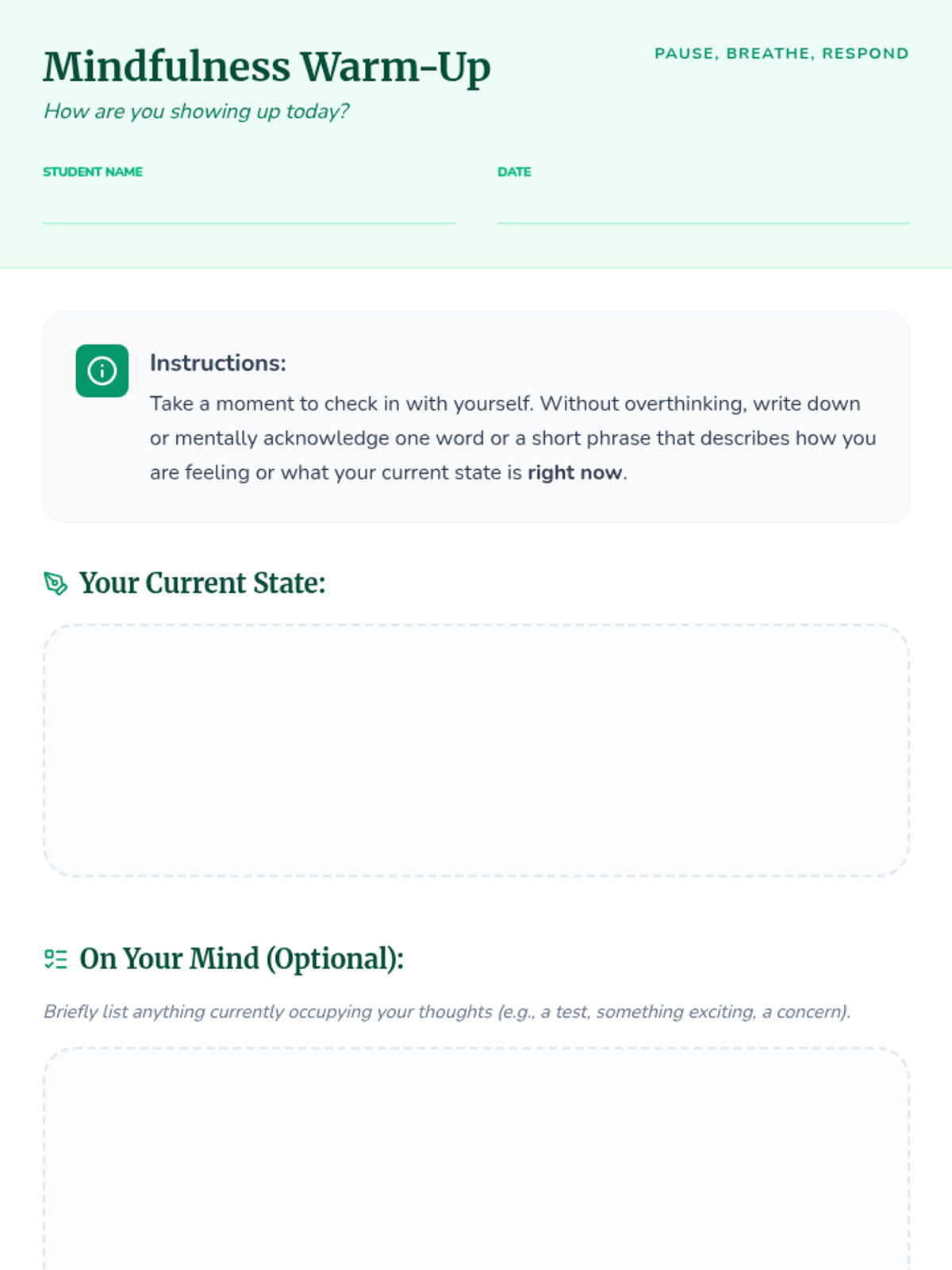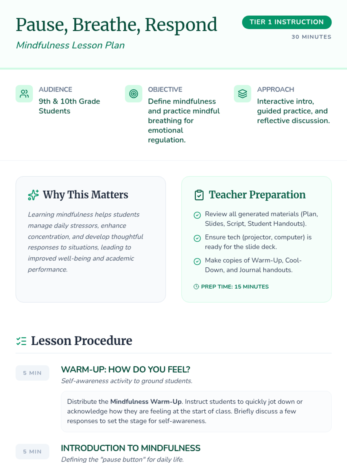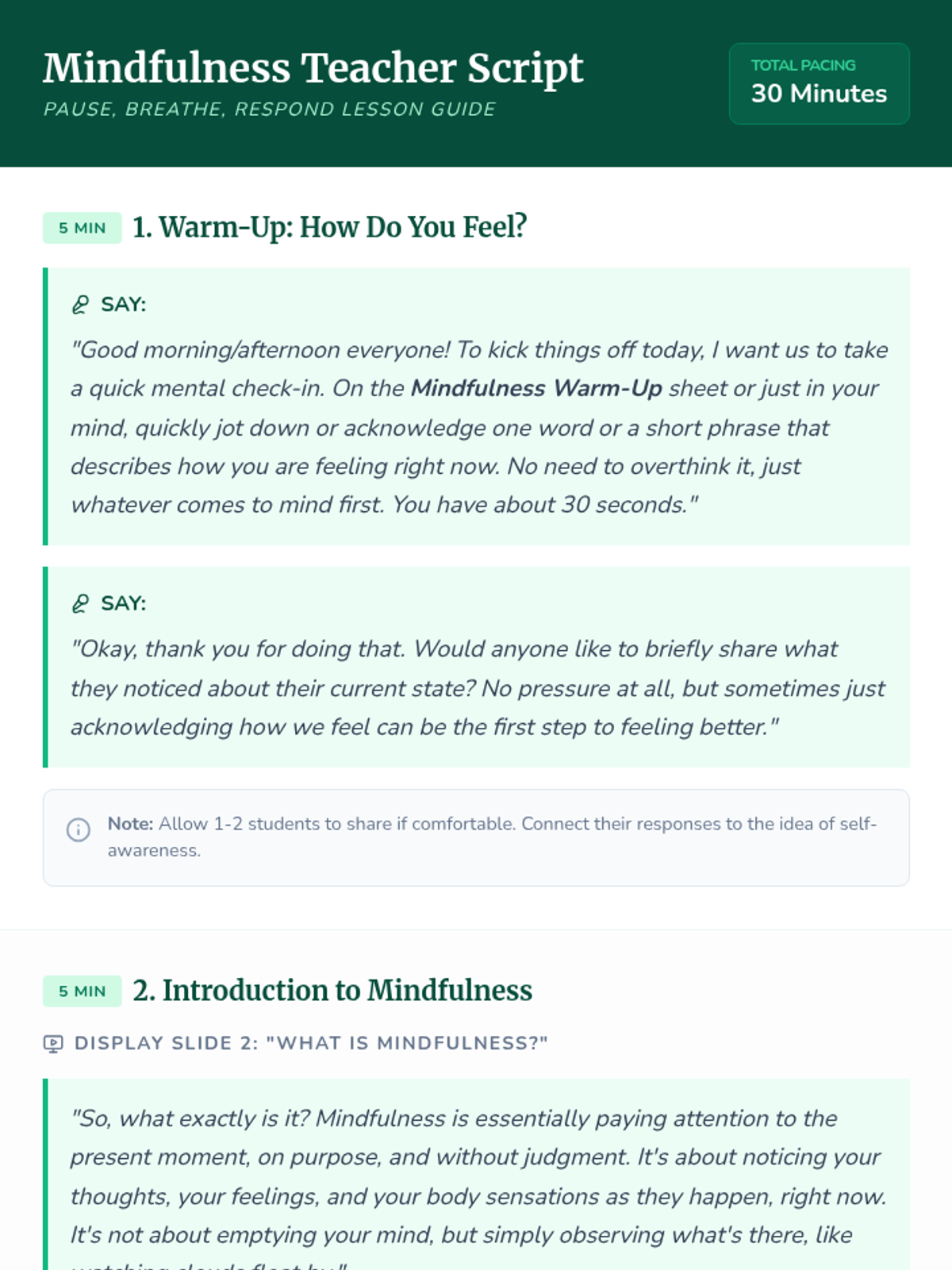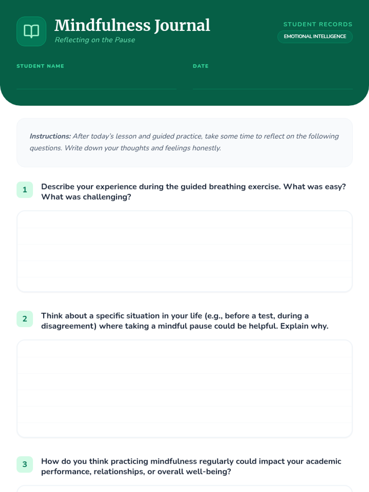 A 30-minute mindfulness lesson for 9th and 10th-grade students, focusing on practical techniques for stress management and focus through breathing exercises and reflection.