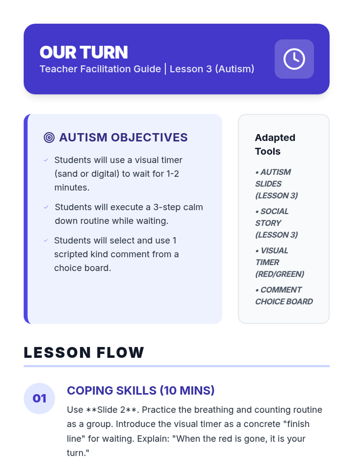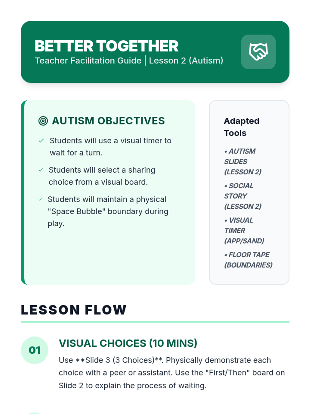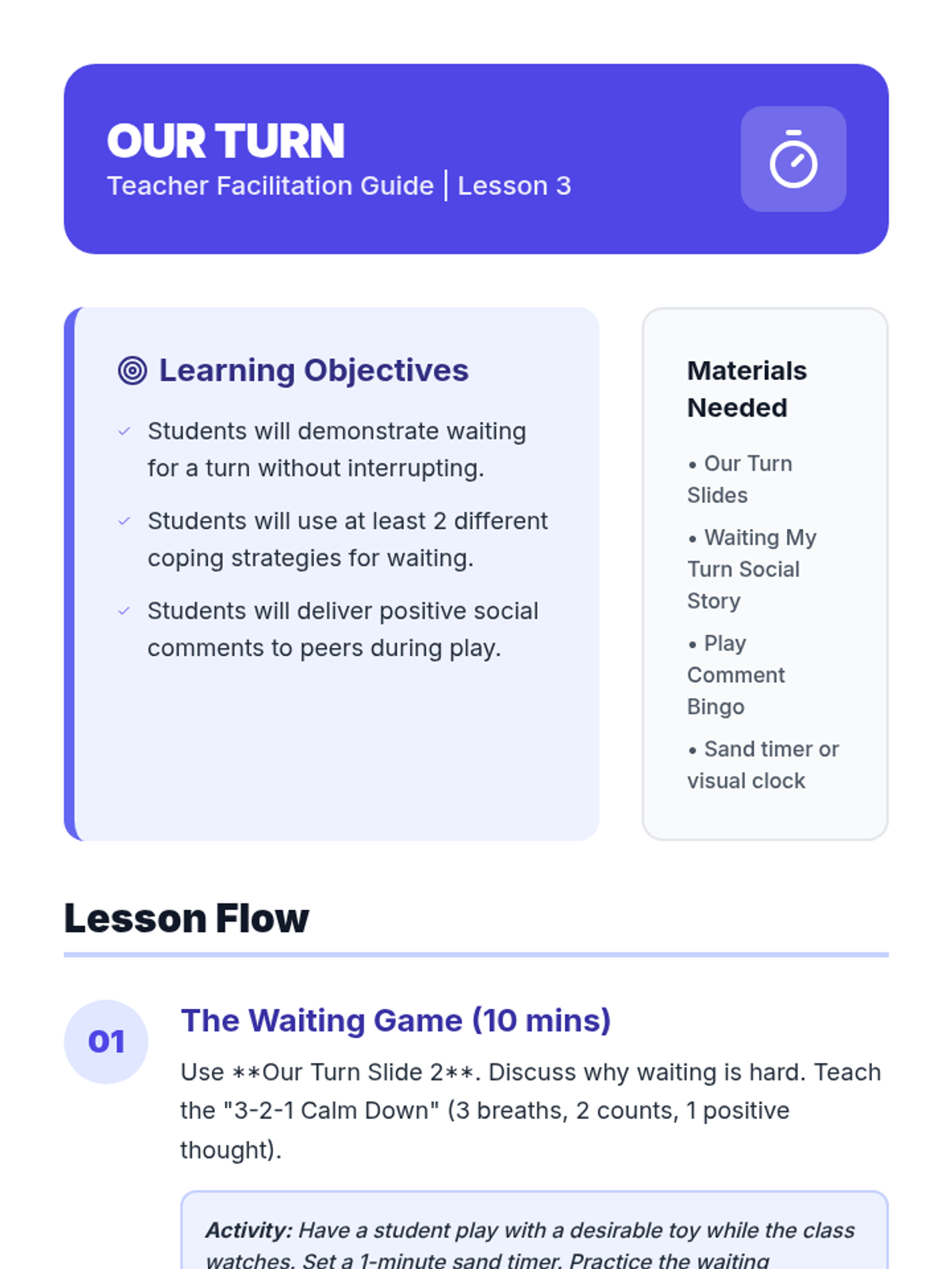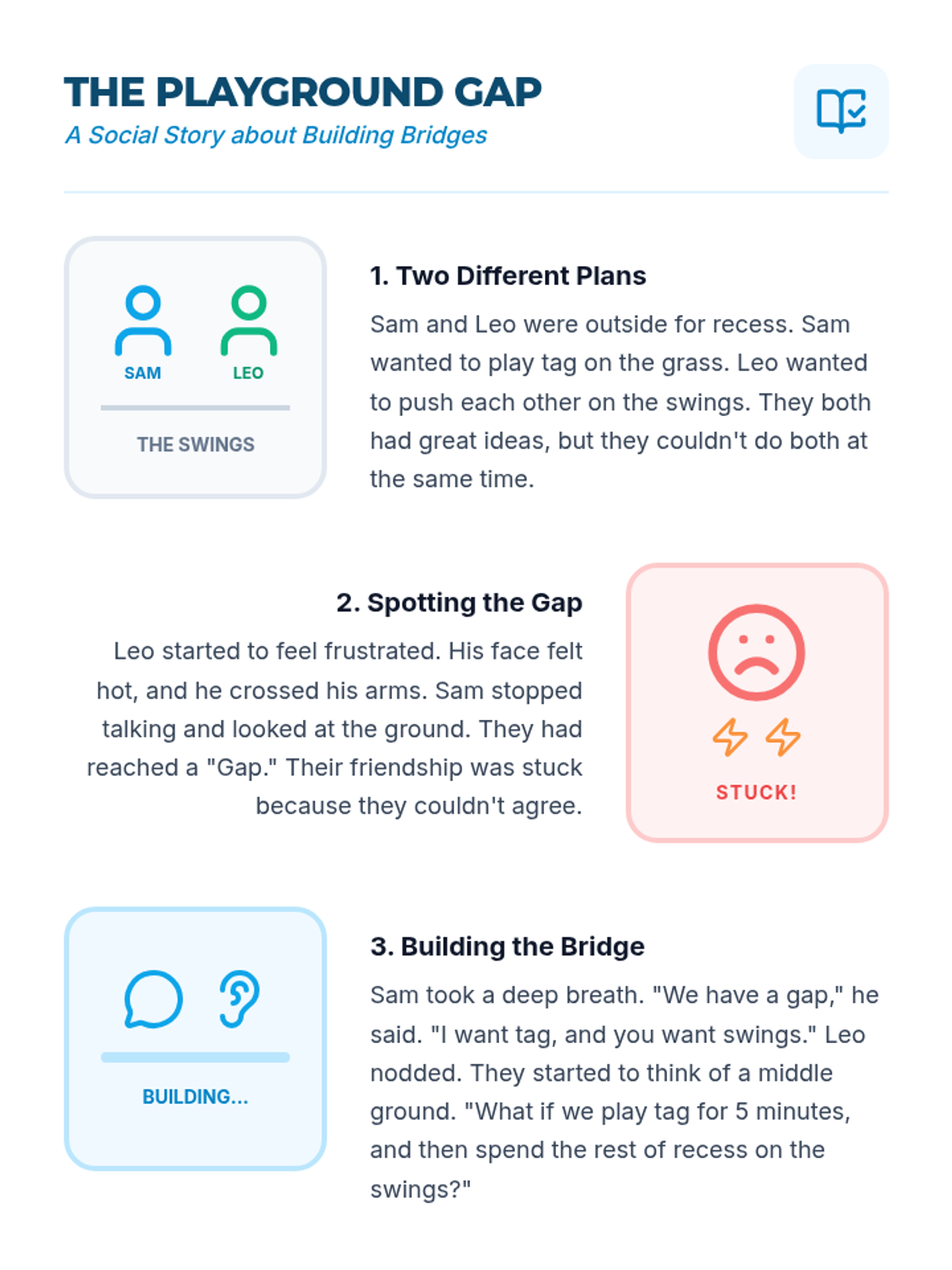 This lesson focuses on how to initiate play and make clear requests to join others. Students will learn the three-step 'Watch, Wait, and Ask' method.