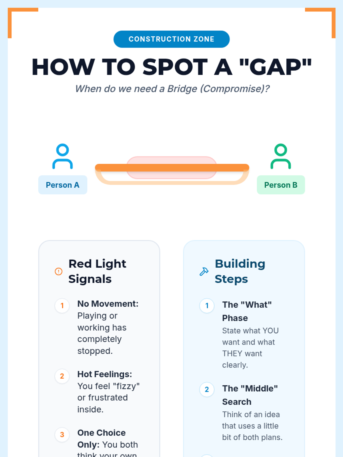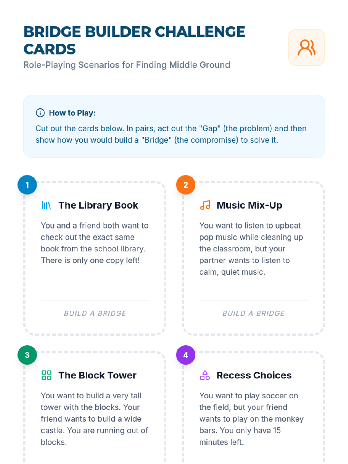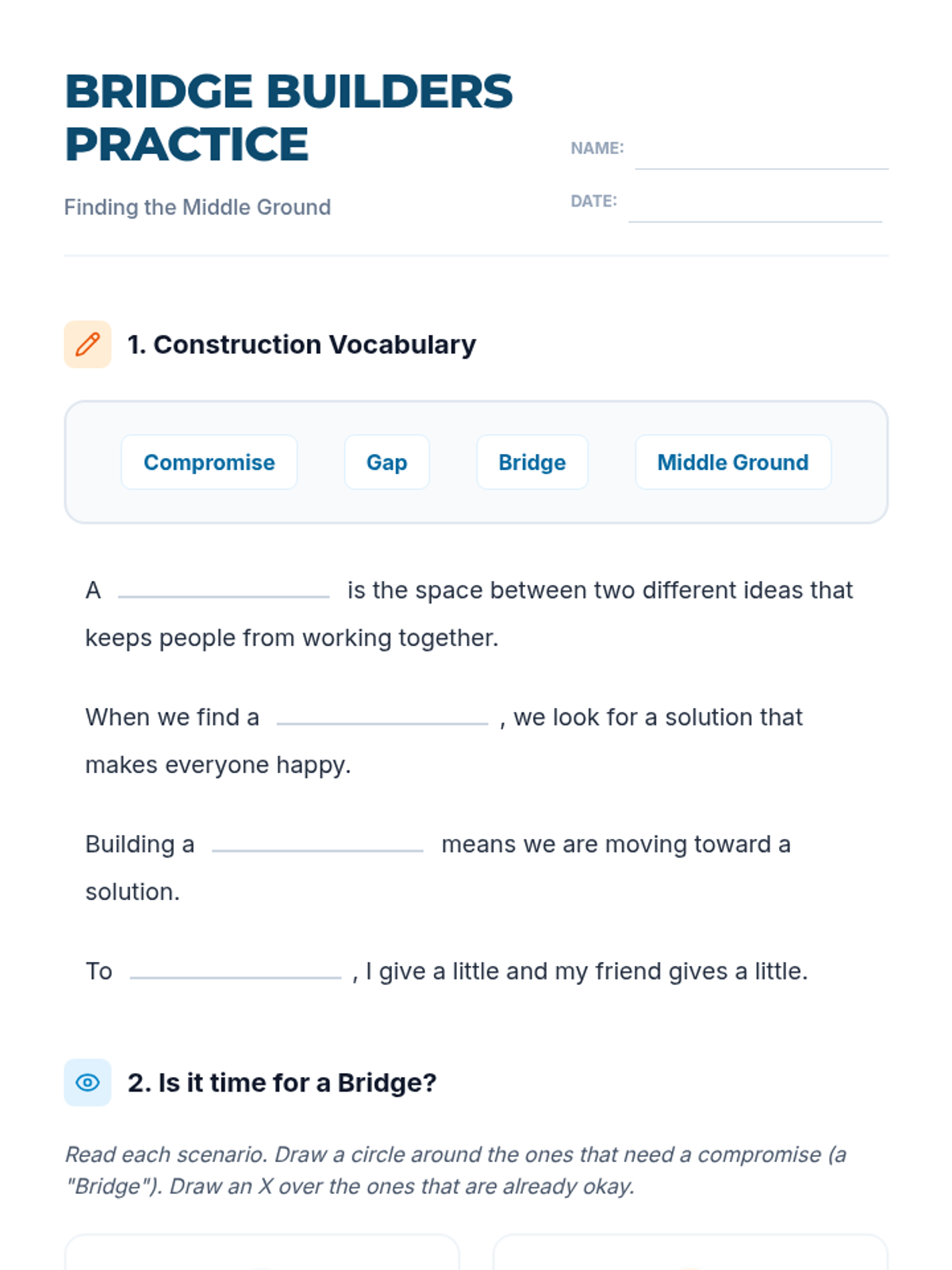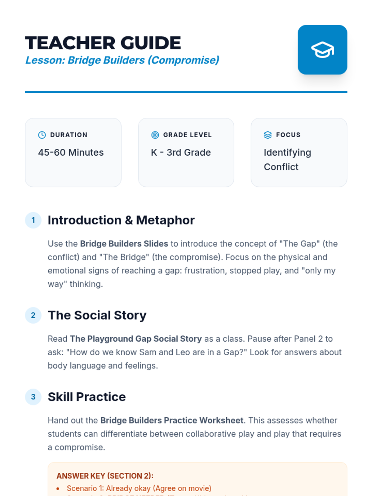 A comprehensive lesson on identifying when a compromise is needed using the 'Bridge Builders' metaphor to help students find middle ground in conflicts.