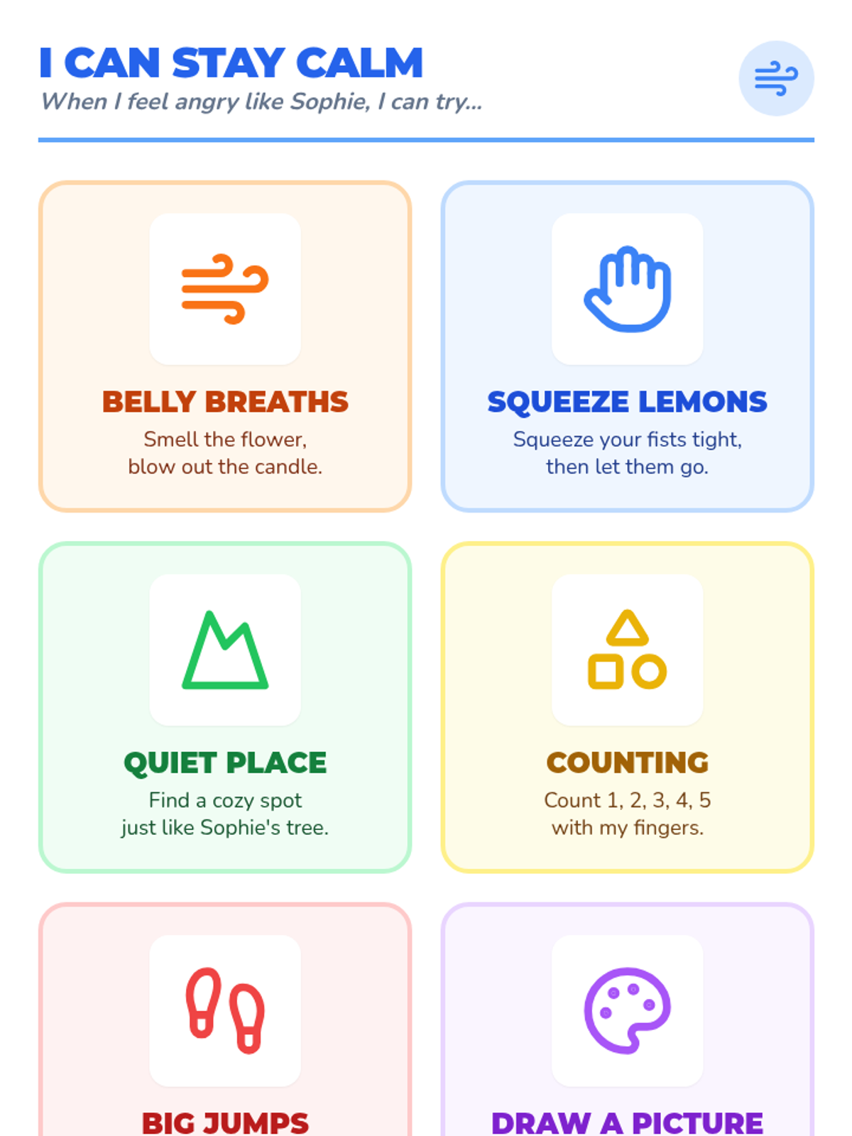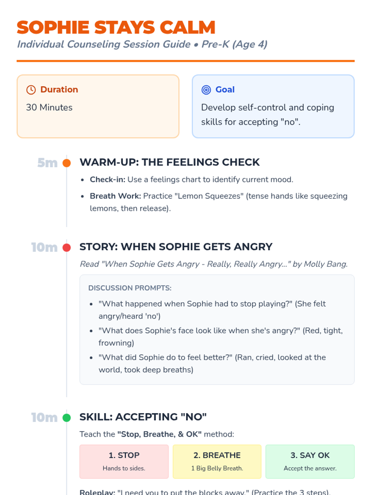 A 30-minute individual counseling session focused on self-control, accepting "no", and coping strategies using the book 'When Sophie Gets Angry - Really, Really Angry...' by Molly Bang.