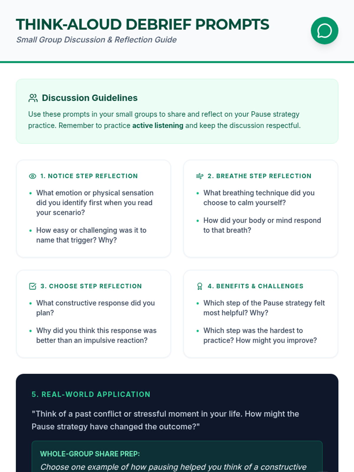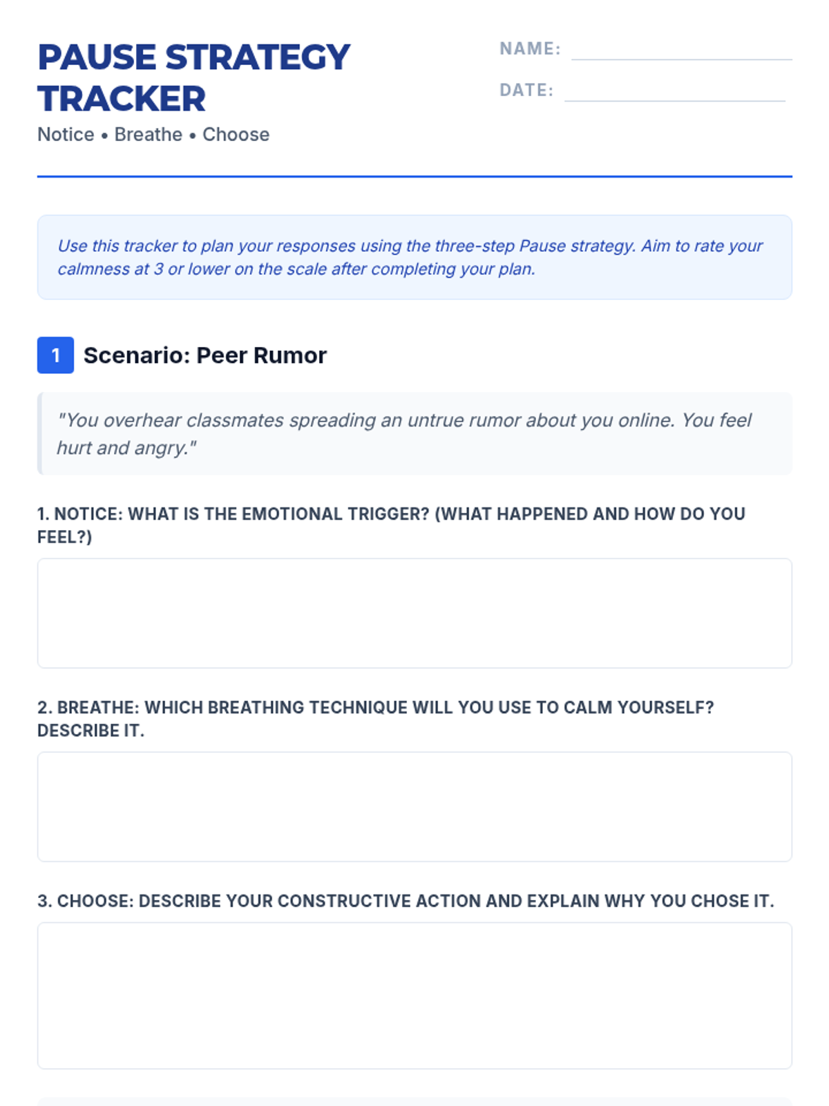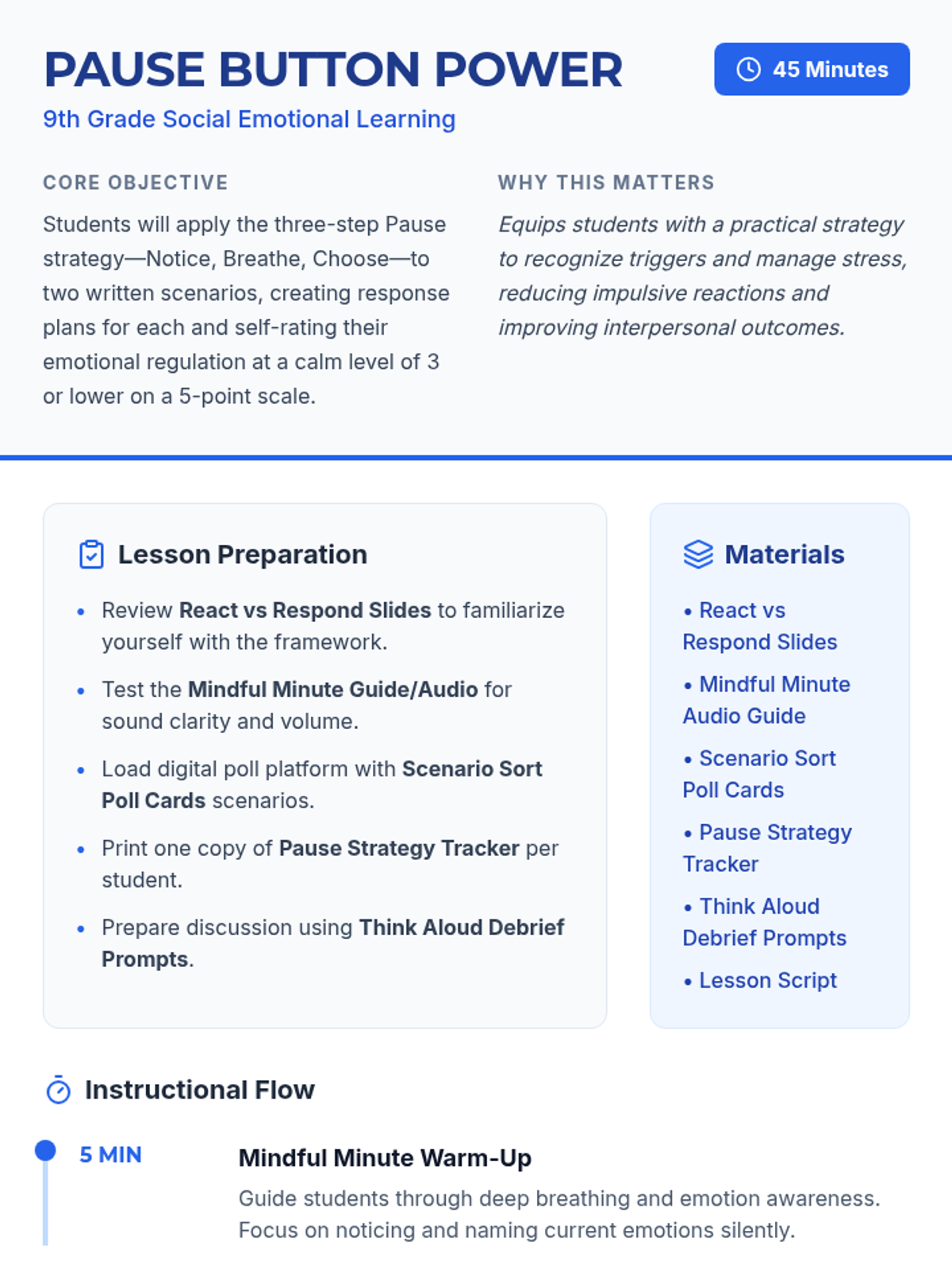 In this 45-minute ninth grade SEL lesson, students learn and apply a three-step Pause (Notice–Breathe–Choose) strategy through guided modeling, scenario practice, and reflective discussion. This lesson builds emotional regulation skills, helping students recognize triggers, manage stress, and make thoughtful choices in real-life situations.