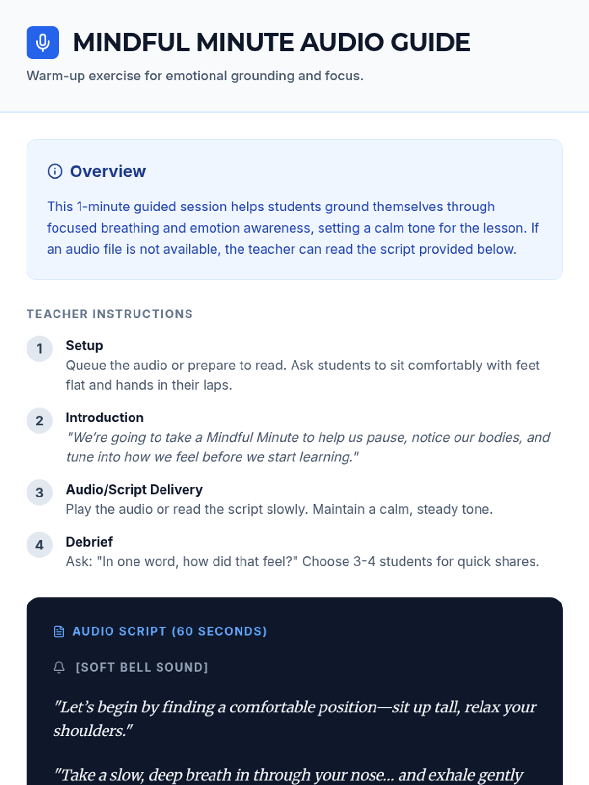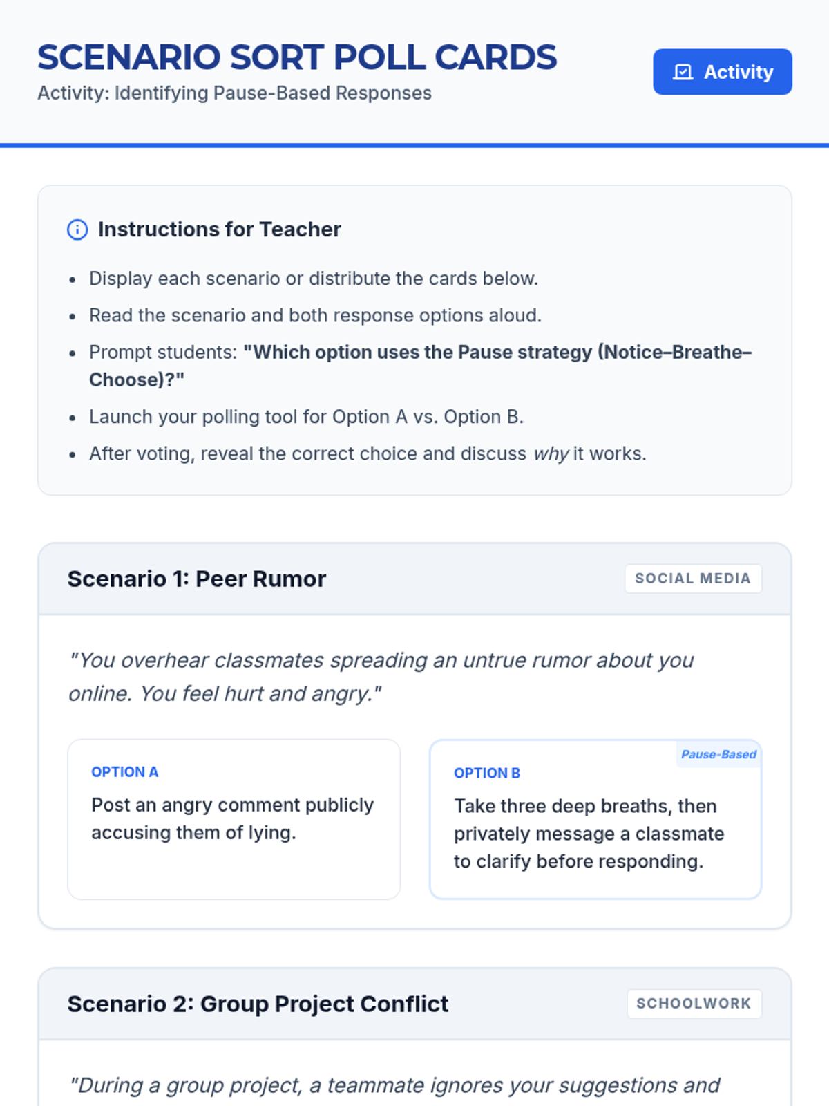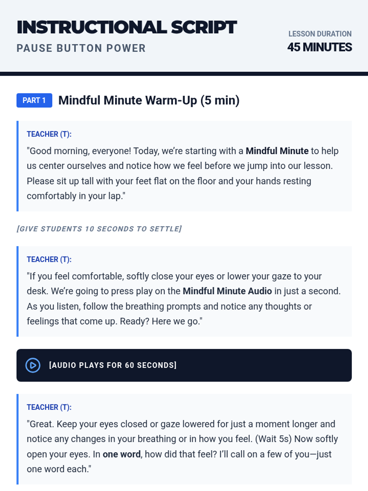 In this 45-minute ninth grade SEL lesson, students learn and apply a three-step Pause (Notice–Breathe–Choose) strategy through guided modeling, scenario practice, and reflective discussion. This lesson builds emotional regulation skills, helping students recognize triggers, manage stress, and make thoughtful choices in real-life situations.