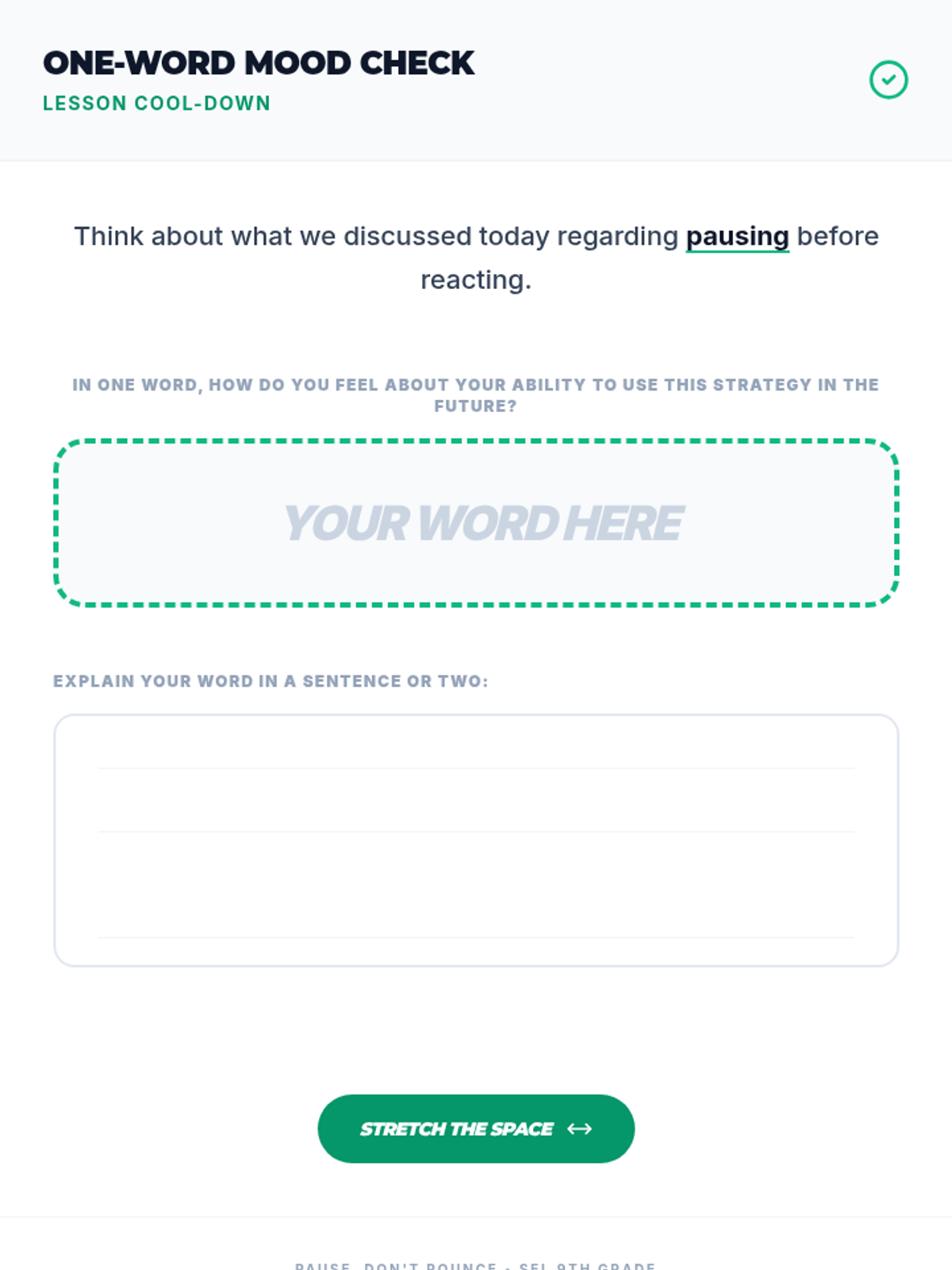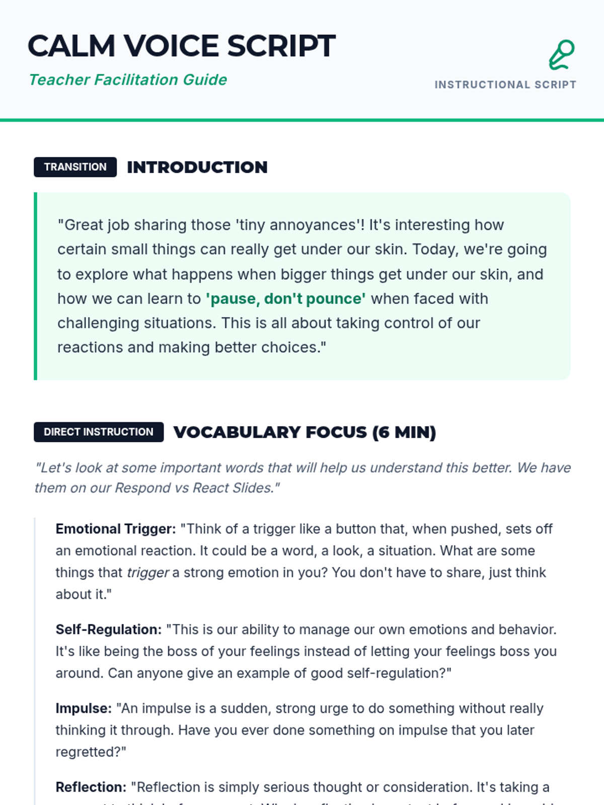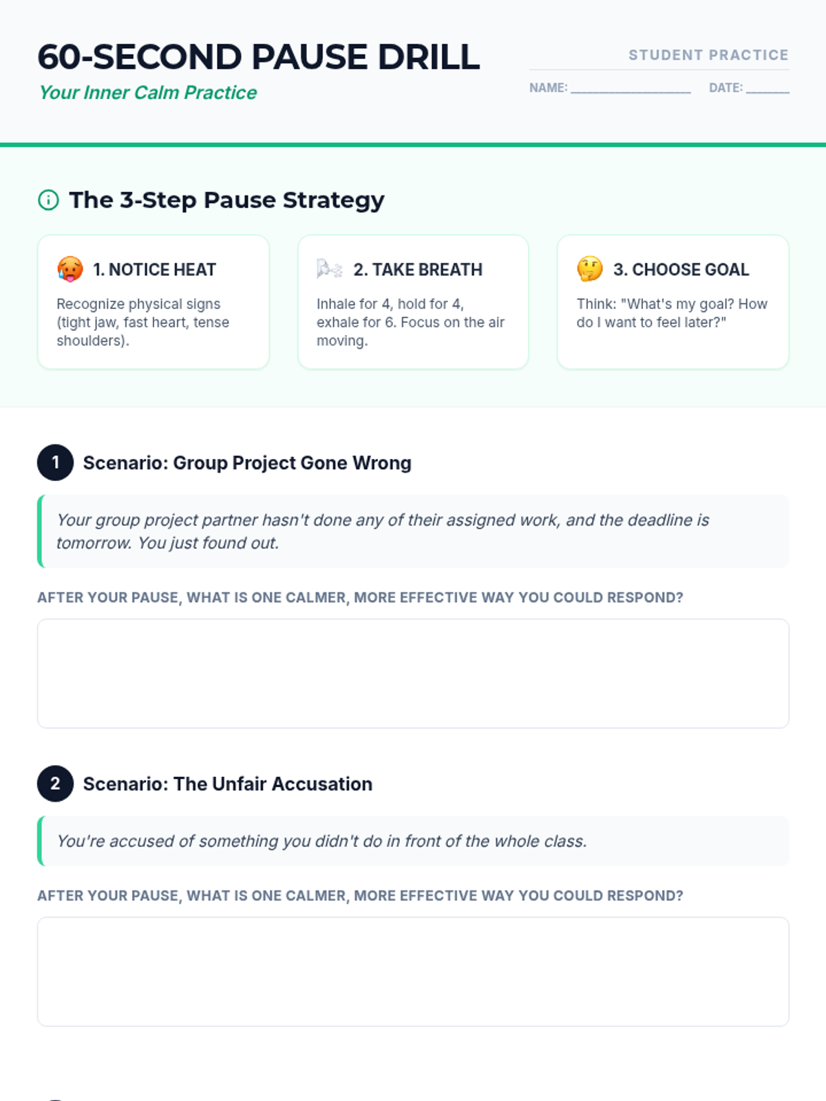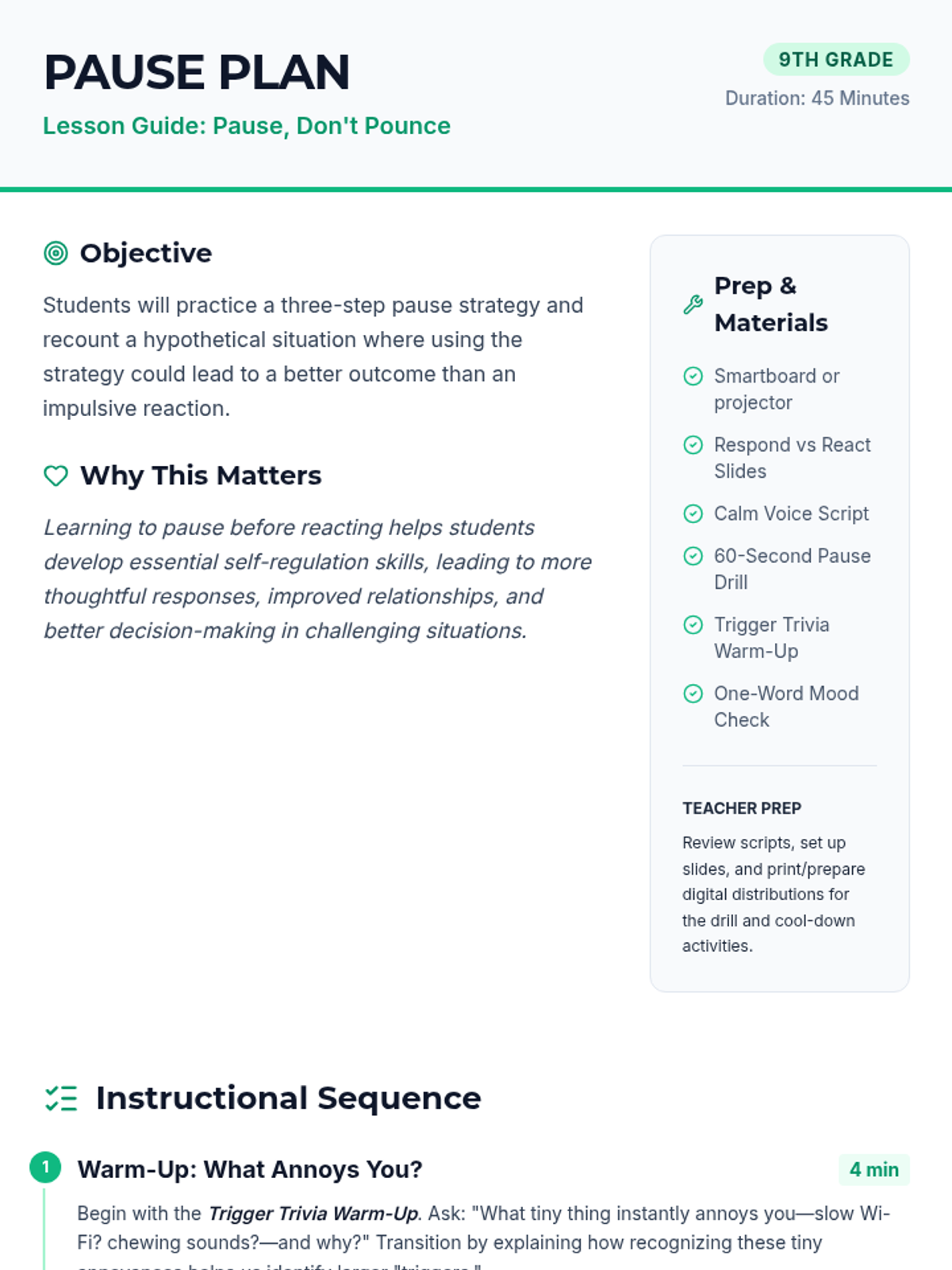 A 45-minute Social Emotional Learning lesson for 9th graders focused on developing self-regulation skills through a three-step pause strategy to manage impulsive reactions.