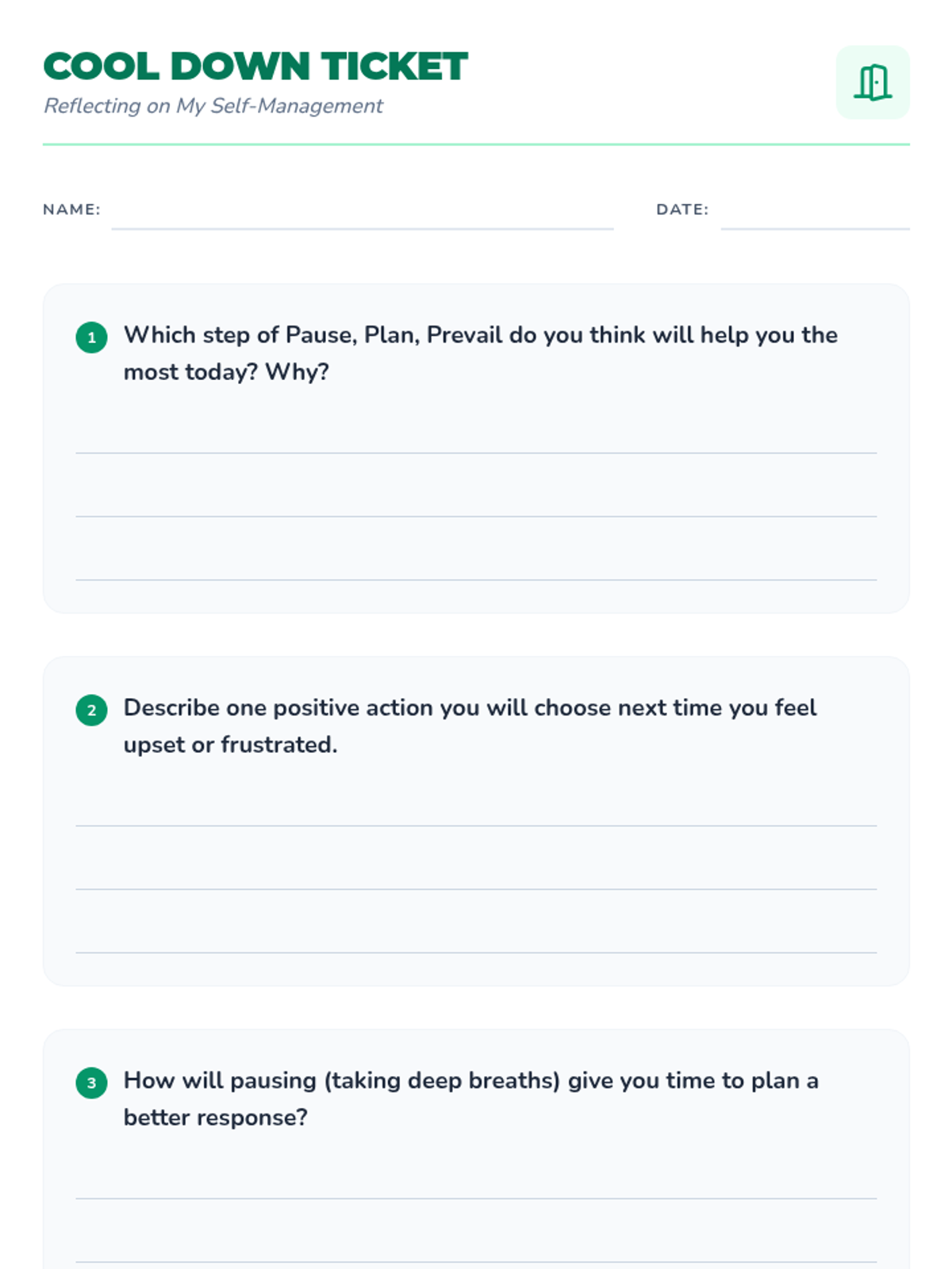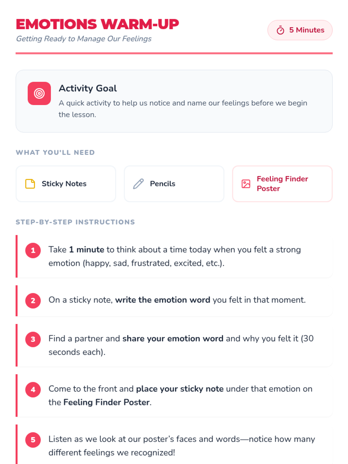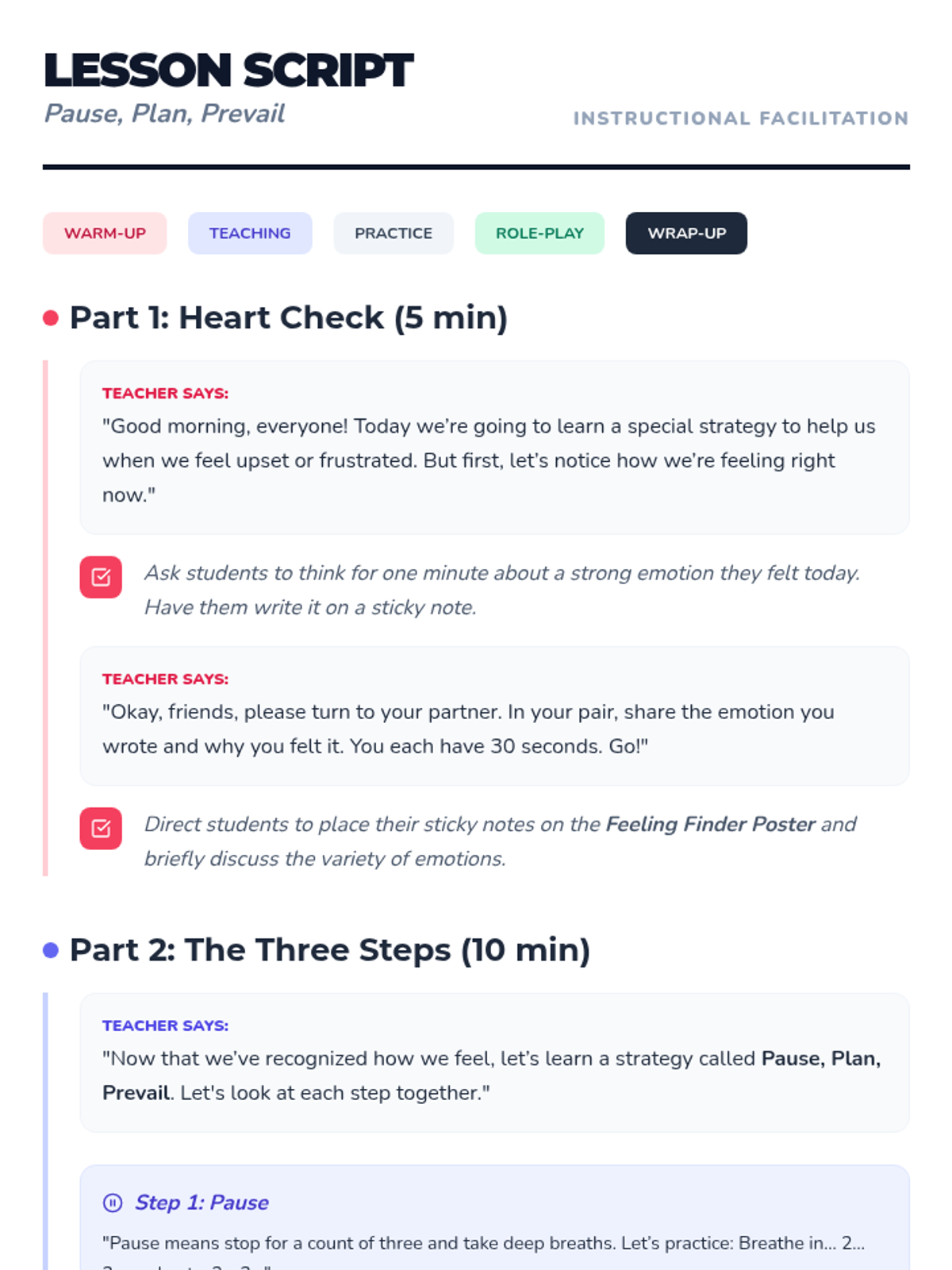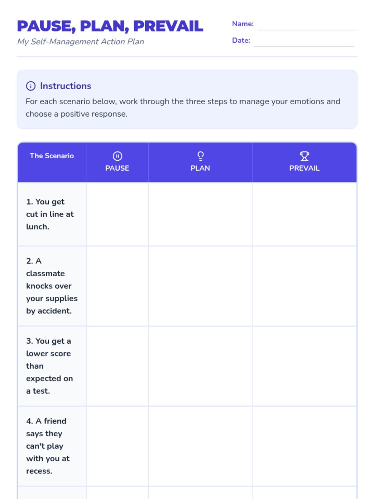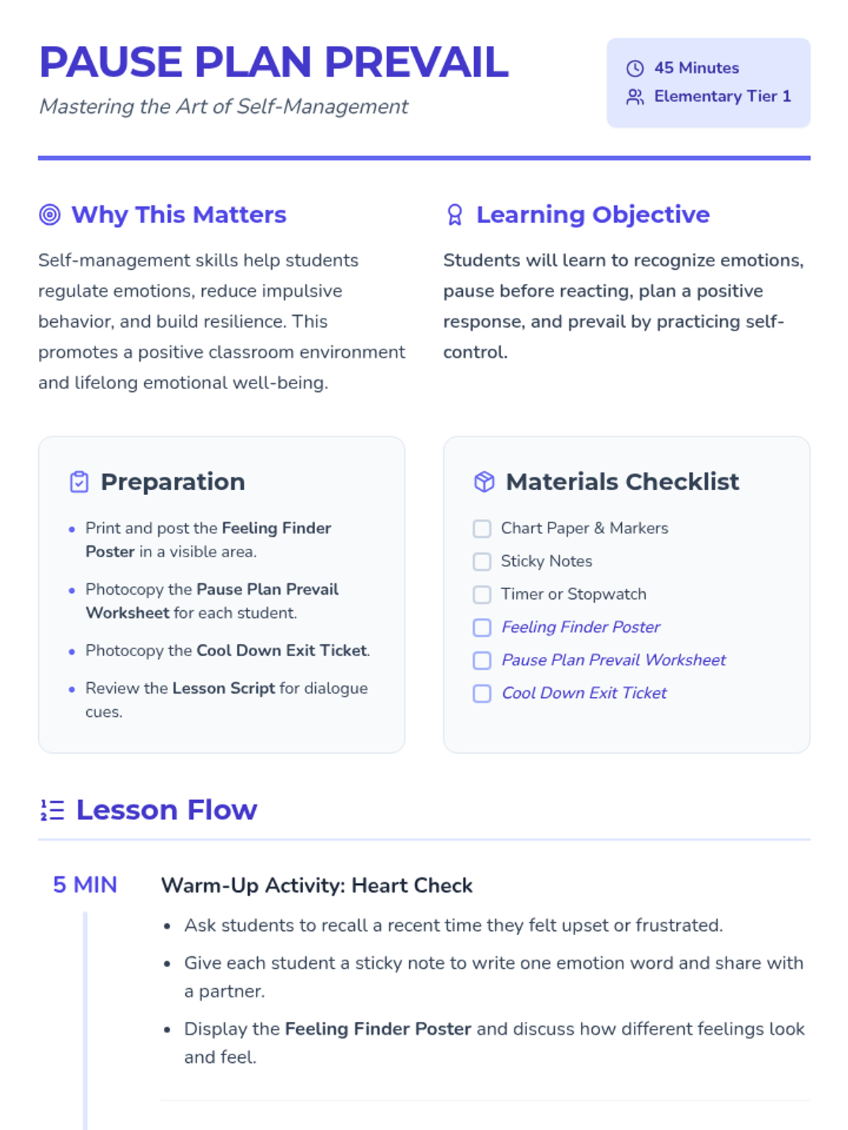A 45-minute elementary lesson teaching self-management through a three-step process: Pausing to regulate, Planning a response, and Prevailing through self-control. Students practice these skills through modeling, worksheets, and role-play.