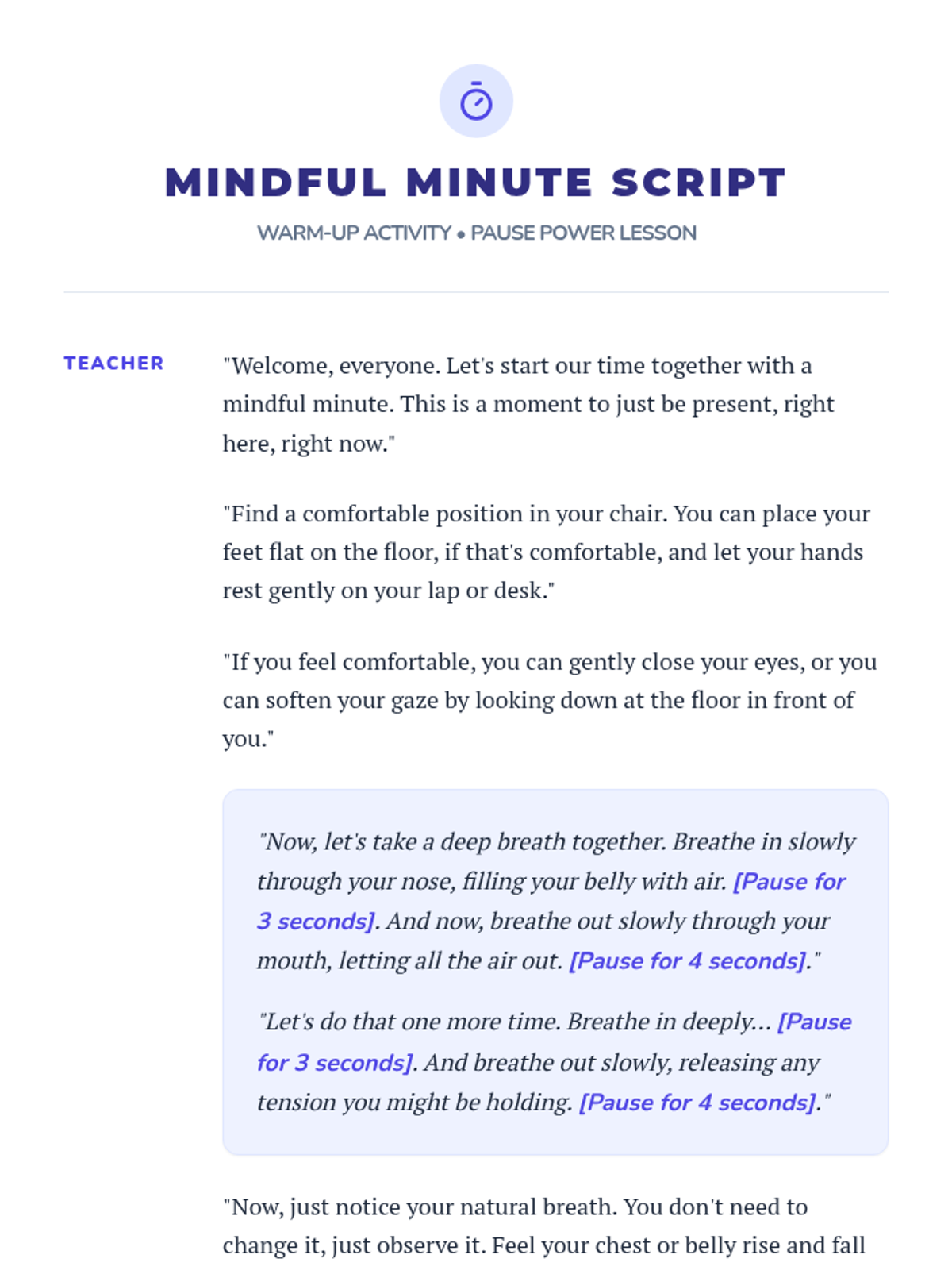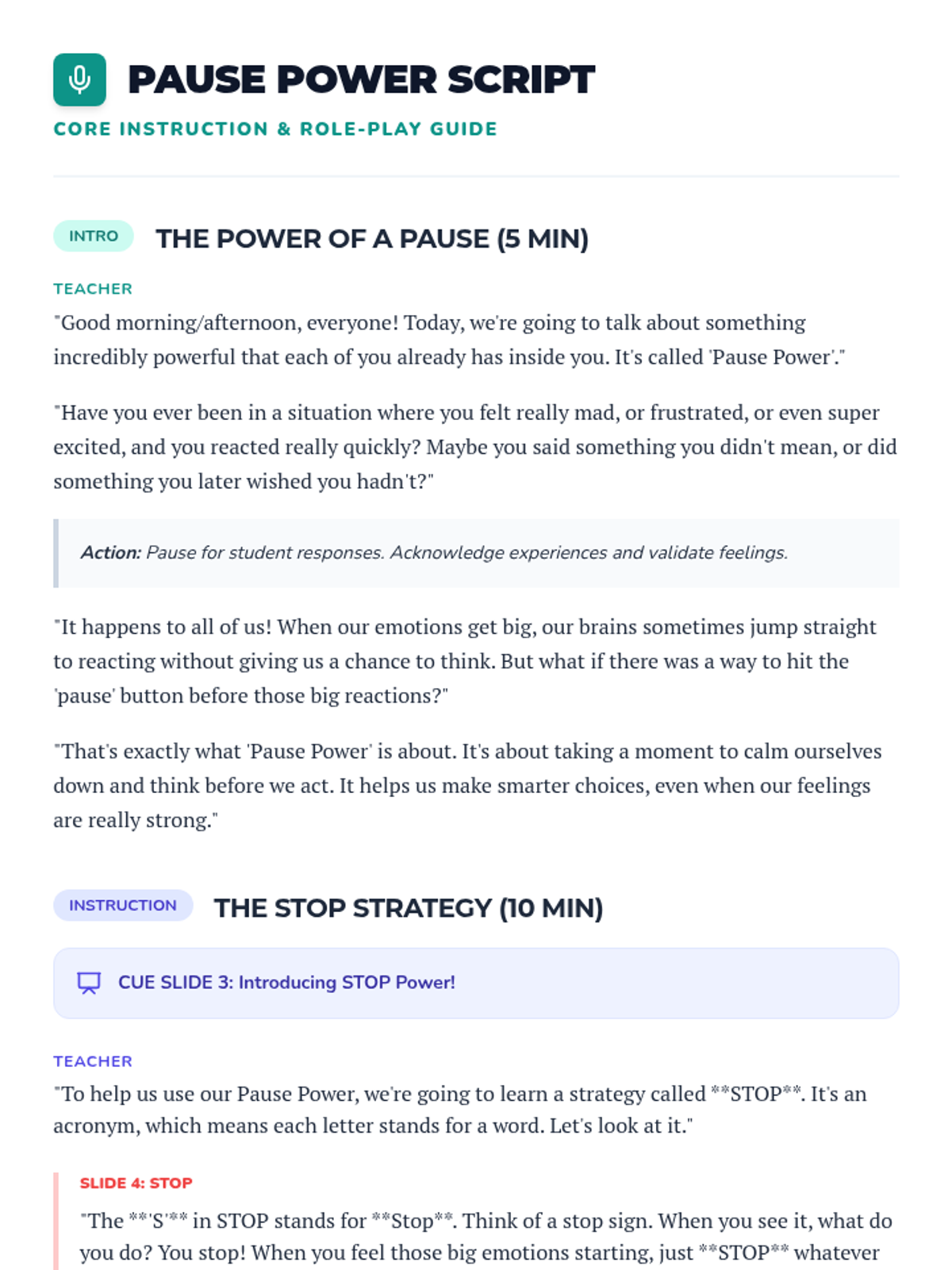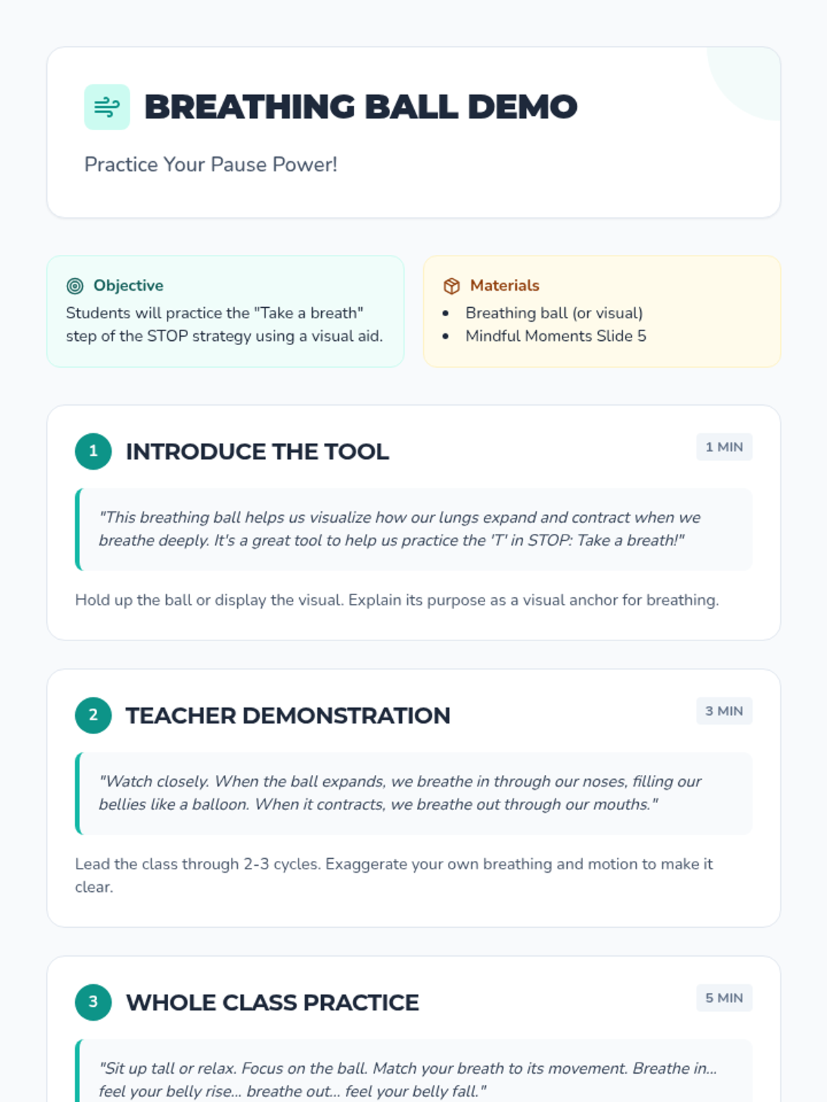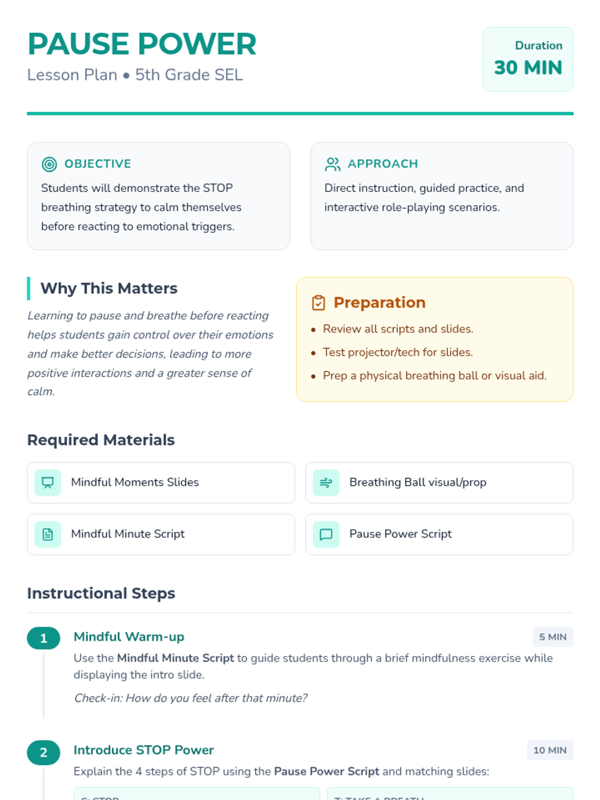 This 30-minute lesson teaches 5th-grade students the STOP breathing strategy (Stop, Take a breath, Observe, Proceed) to manage impulsivity and make thoughtful choices.