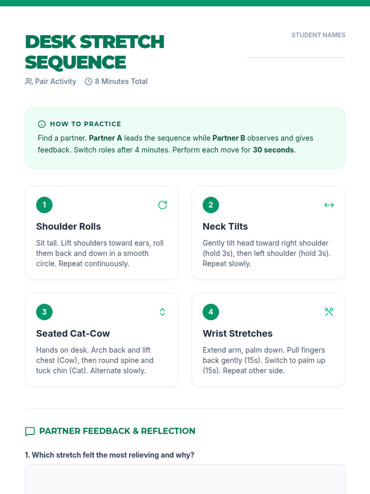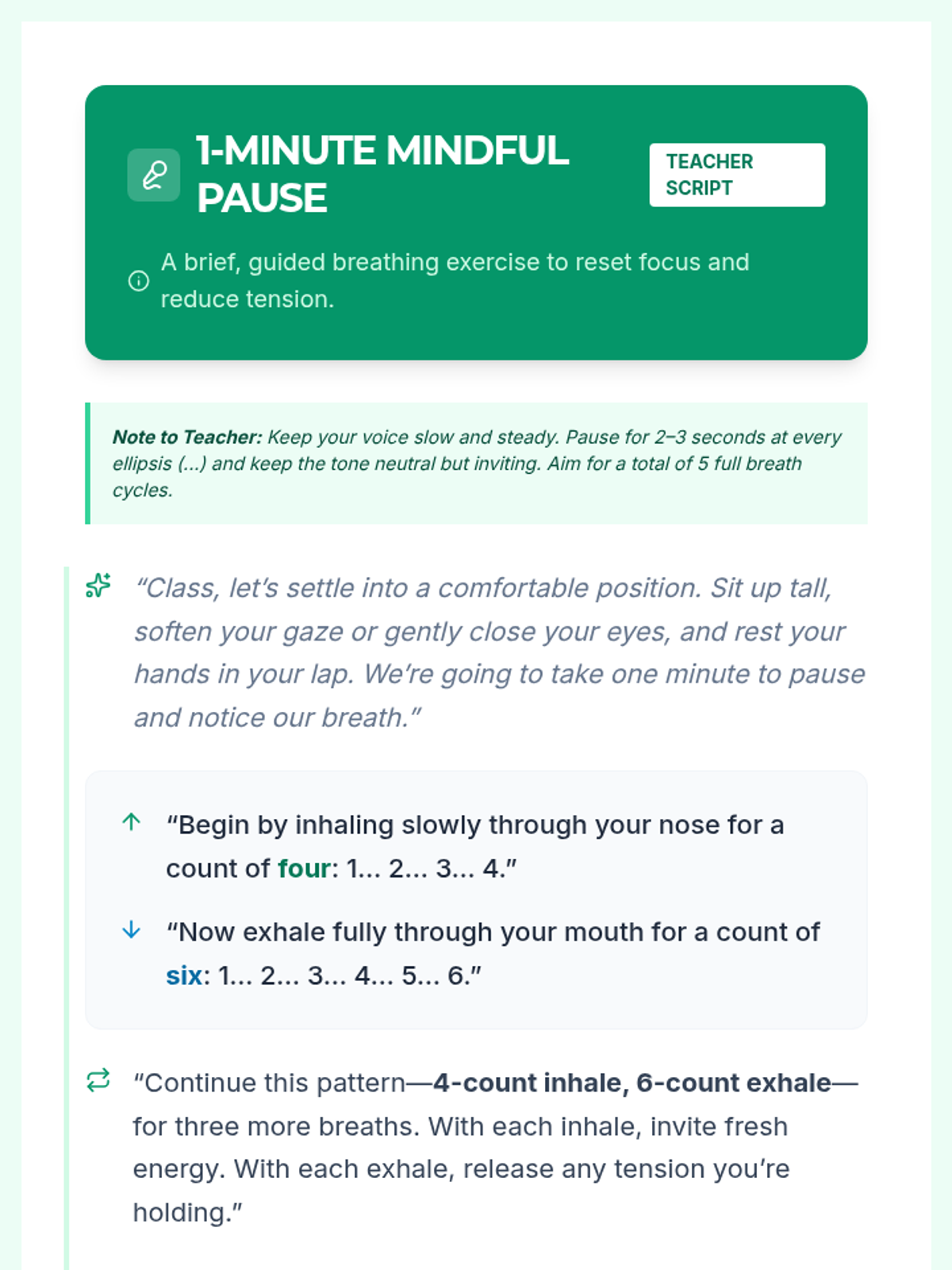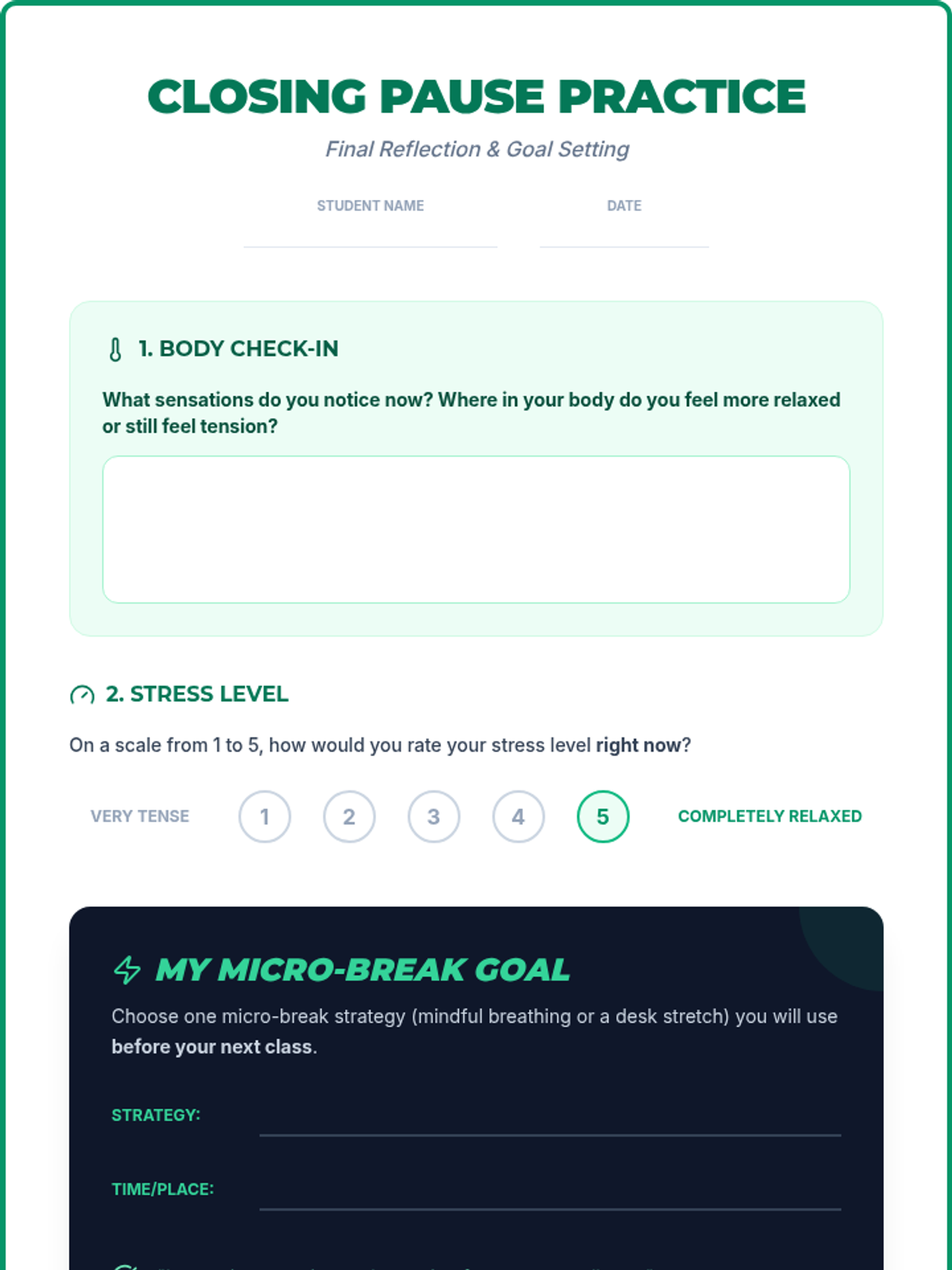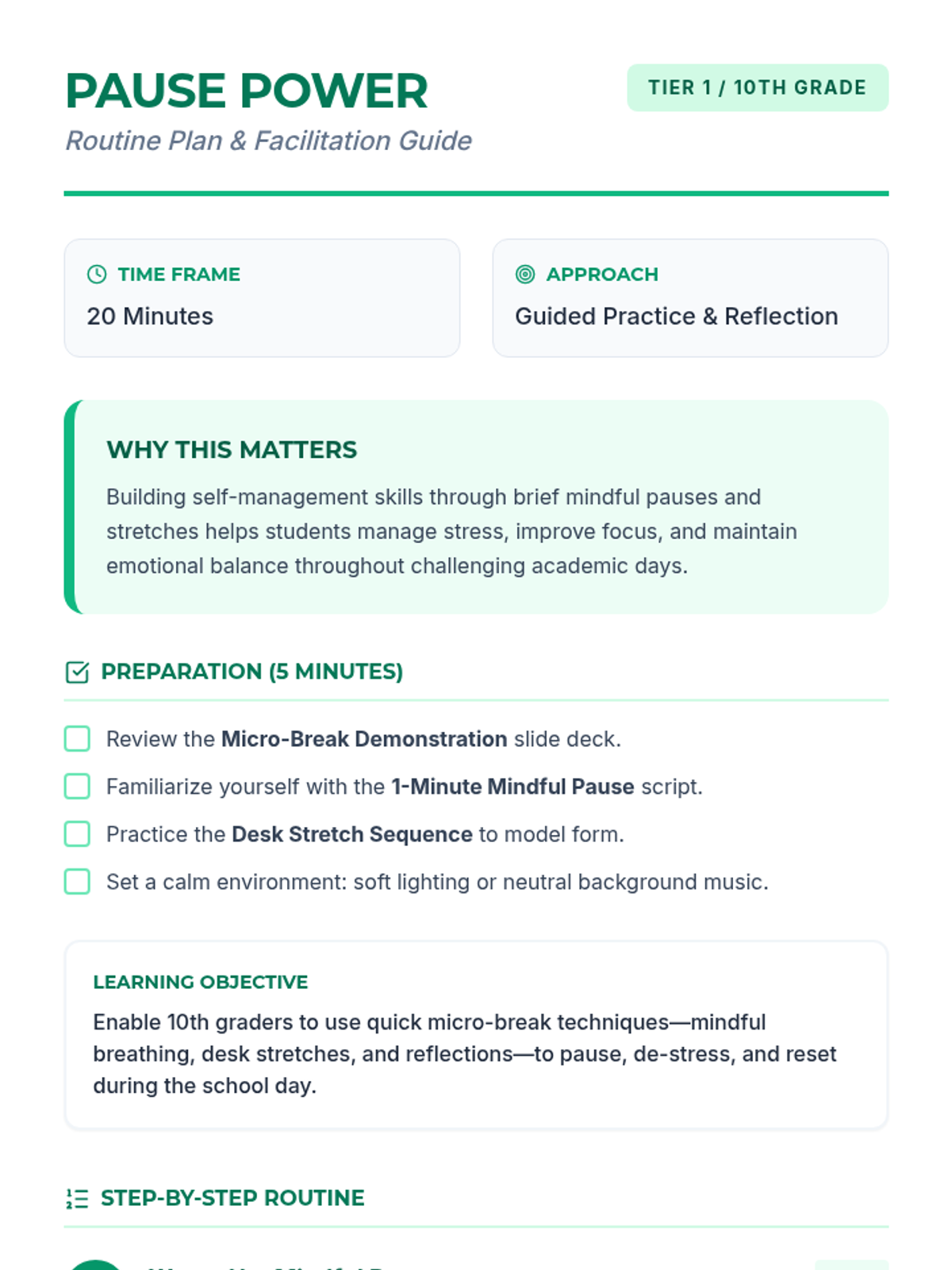 A 20-minute Tier 1 lesson for 10th graders that teaches micro-break techniques including mindful breathing, desk stretches, and reflection to manage daily stress.