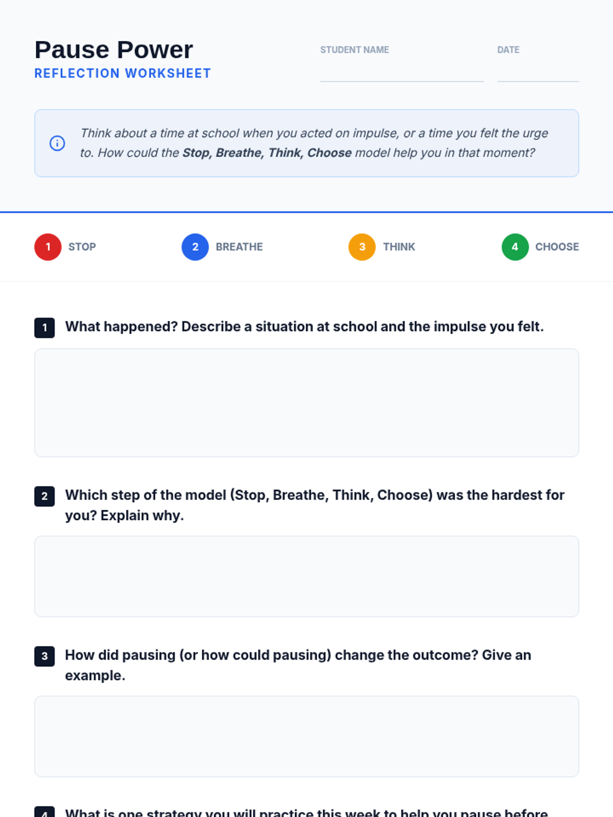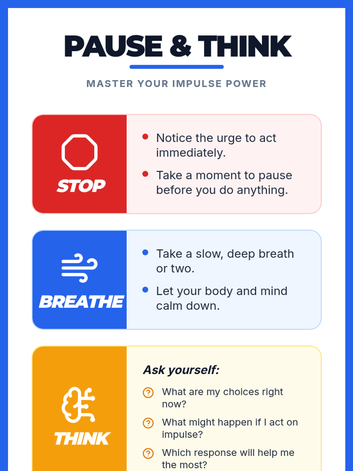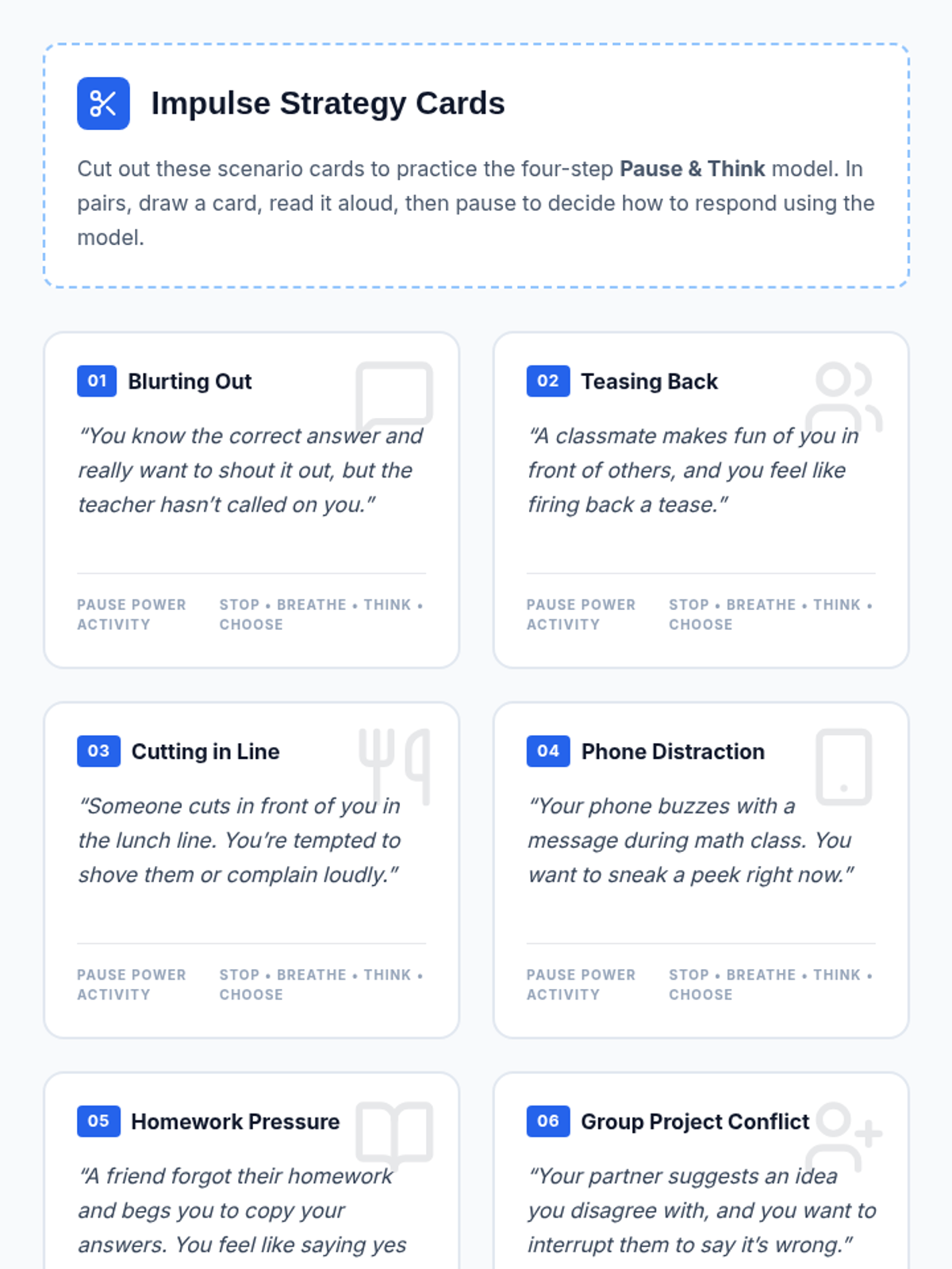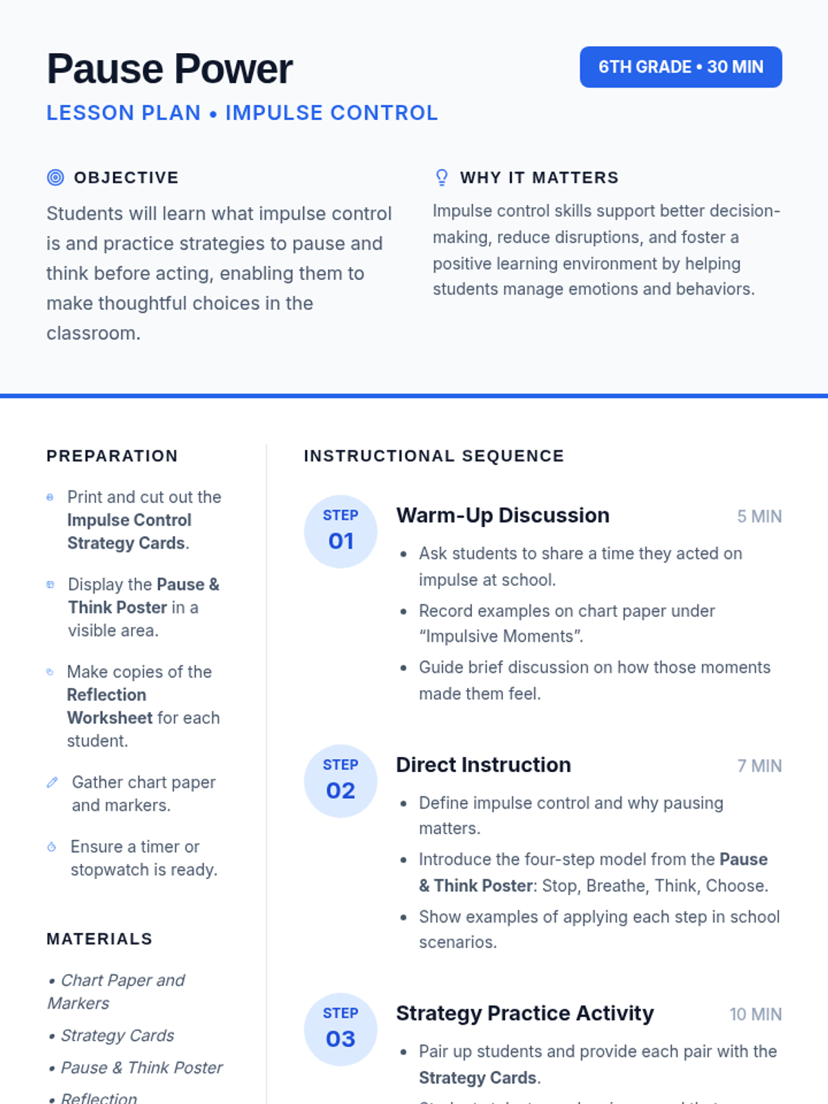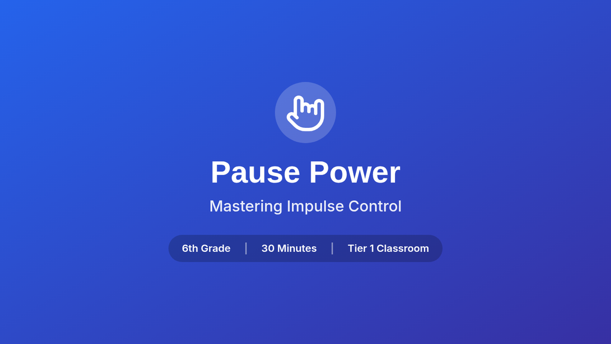 In this 30-minute lesson, 6th graders explore impulse control, learning why thinking before acting helps them succeed and feel more in control at school. Through engaging activities and discussions, students will practice strategies to pause and make thoughtful choices.