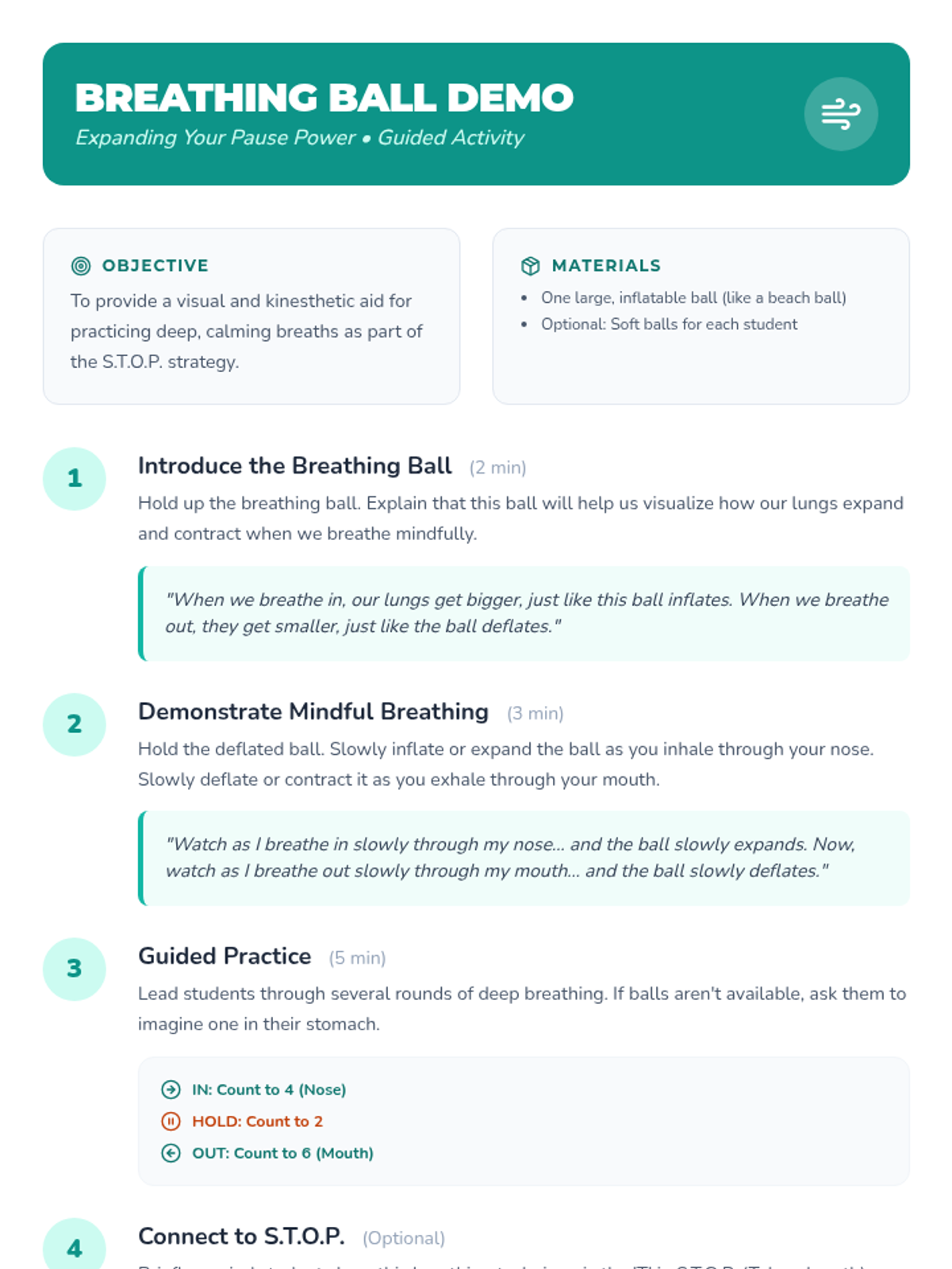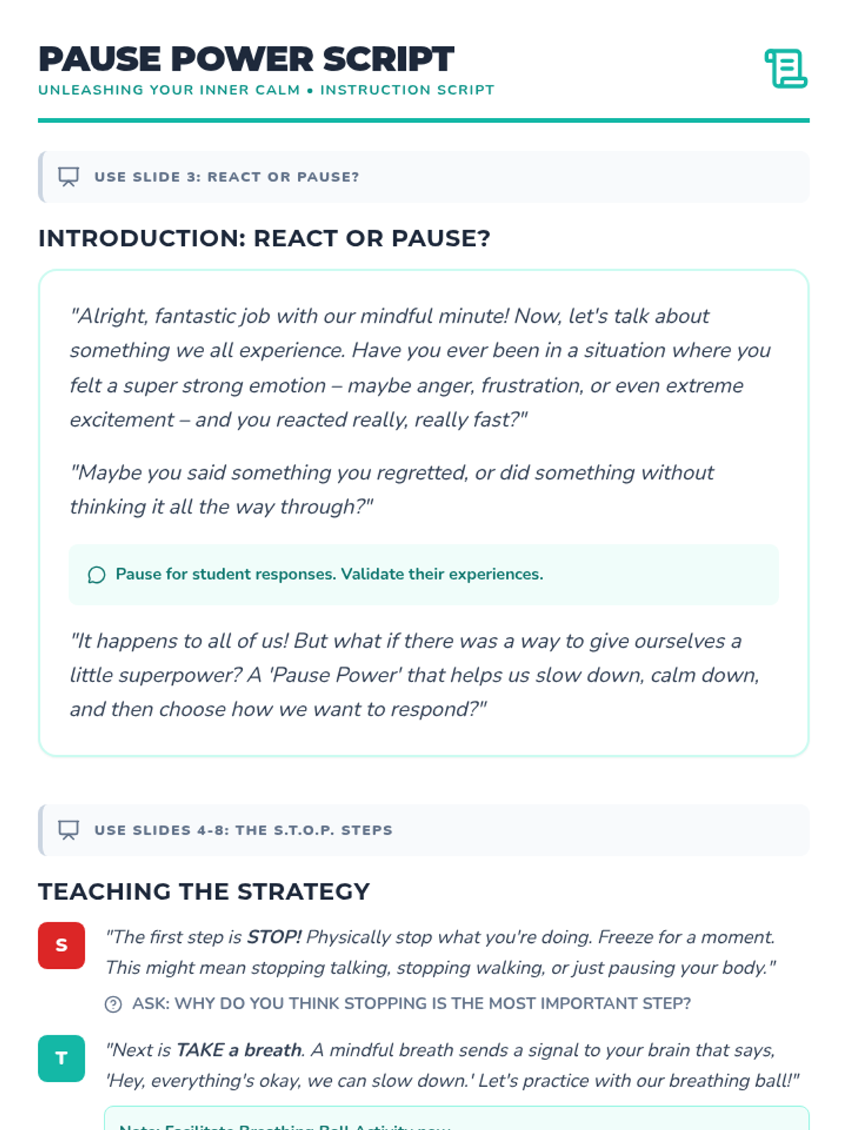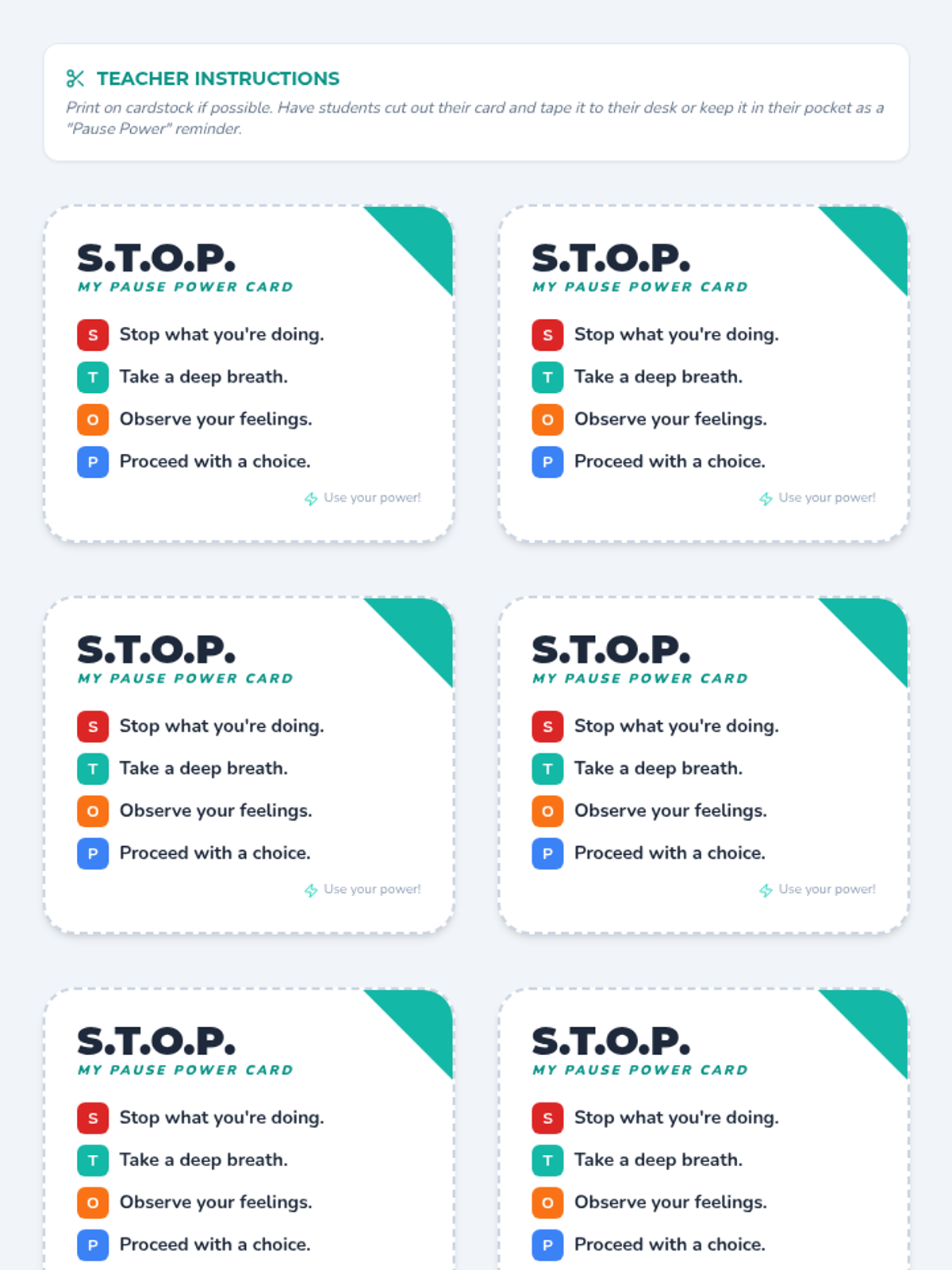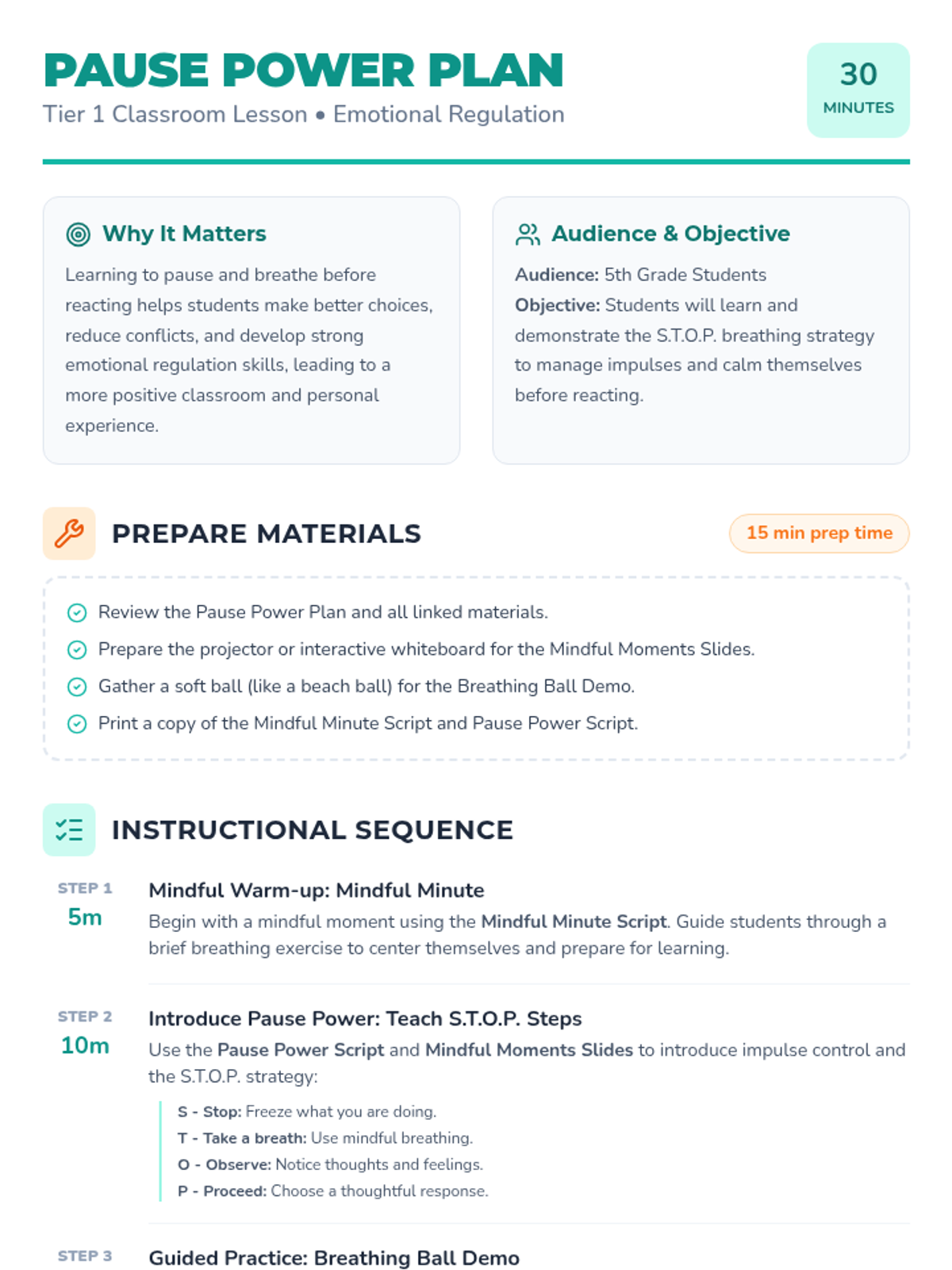 A 30-minute lesson for 5th graders teaching the S.T.O.P. strategy to manage impulses and develop emotional regulation through mindful breathing and thoughtful responding.
