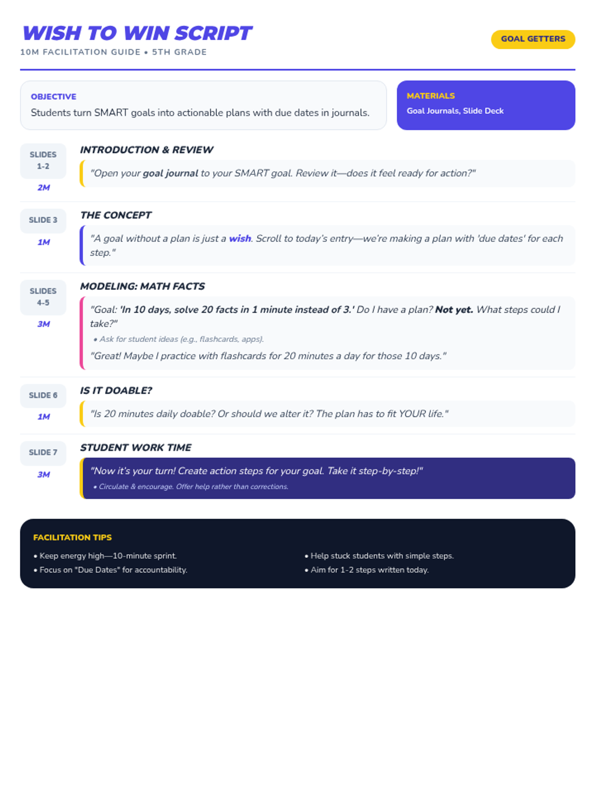 A 10-minute workshop for 5th graders on transforming SMART goals into actionable plans using step-by-step due dates and realistic tasks.