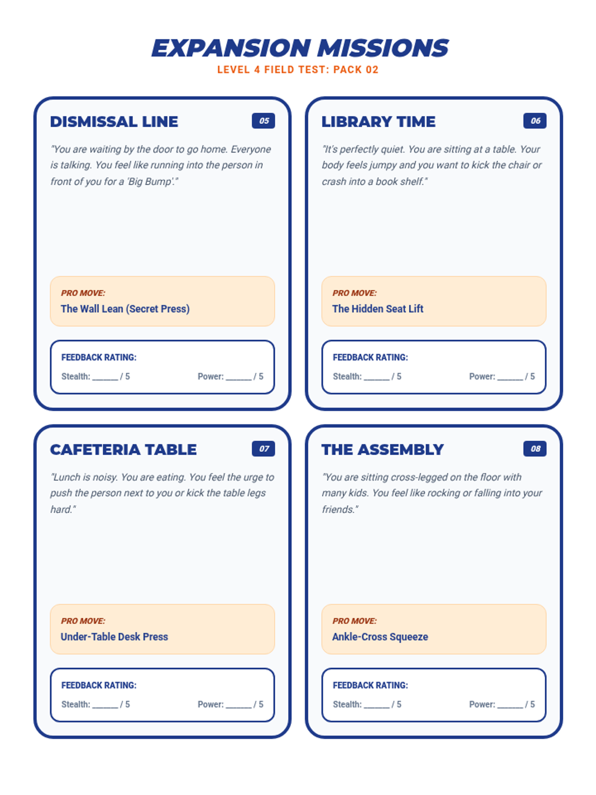 Focused practice on the replacement behaviors: isometric muscle squeezes and appropriate fidget use. Sessions 5 and 6 provide structured modeling and initial role-playing.