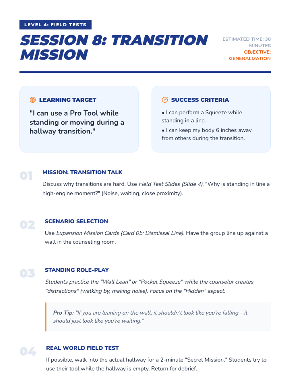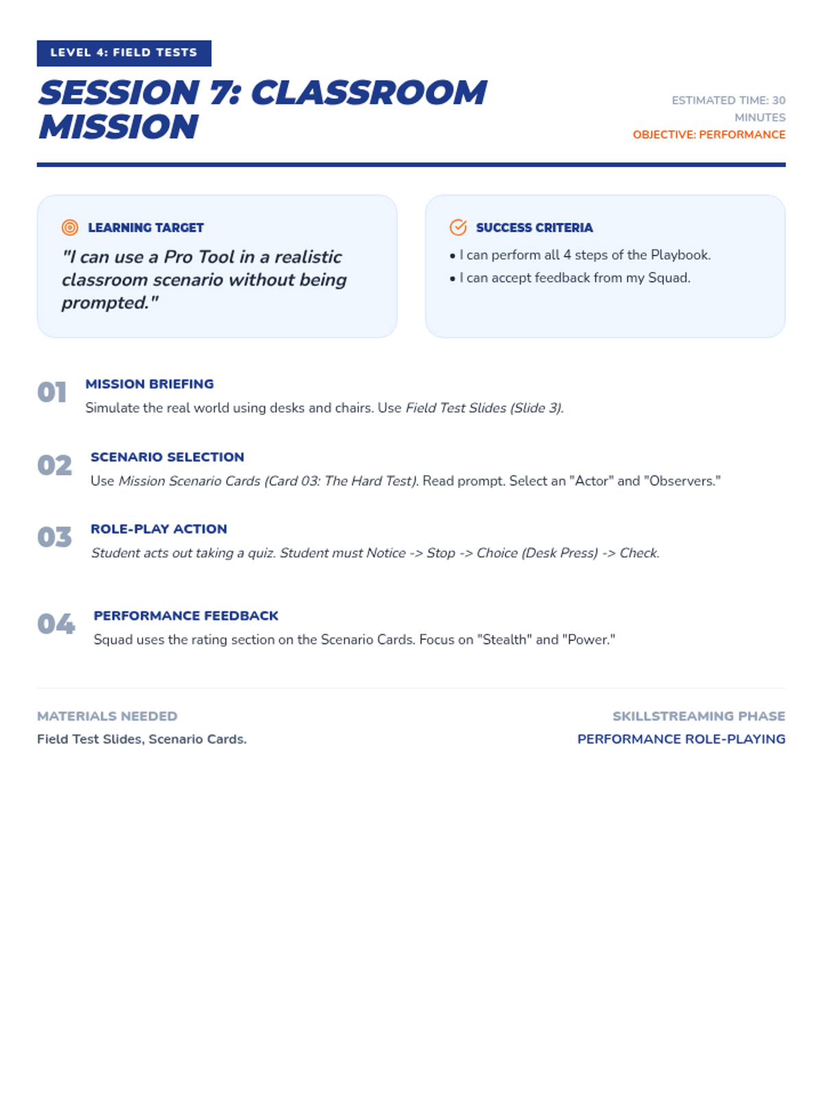 Applying the skills to real-world scenarios through intensive role-playing and performance feedback. Sessions 7 and 8 focus on classroom and transition environments.