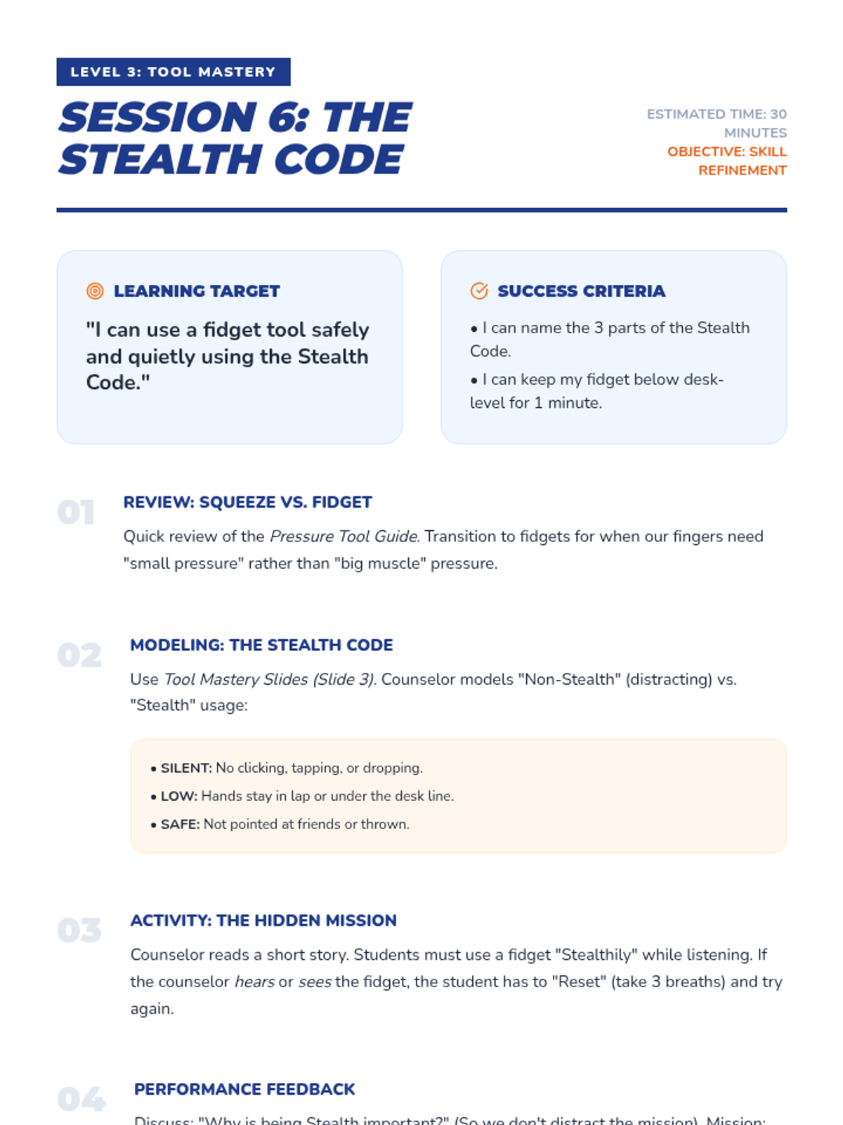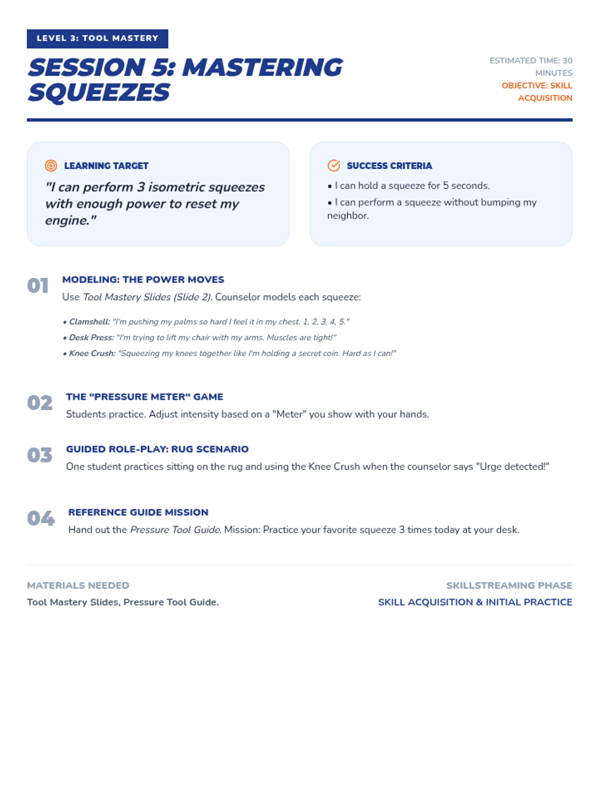 Focused practice on the replacement behaviors: isometric muscle squeezes and appropriate fidget use. Sessions 5 and 6 provide structured modeling and initial role-playing.