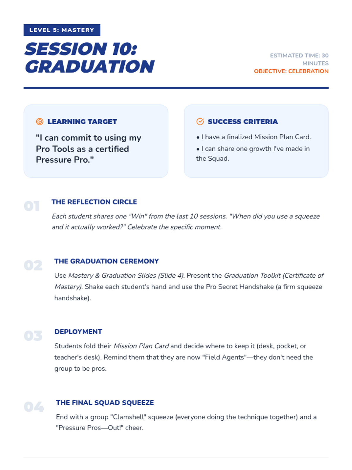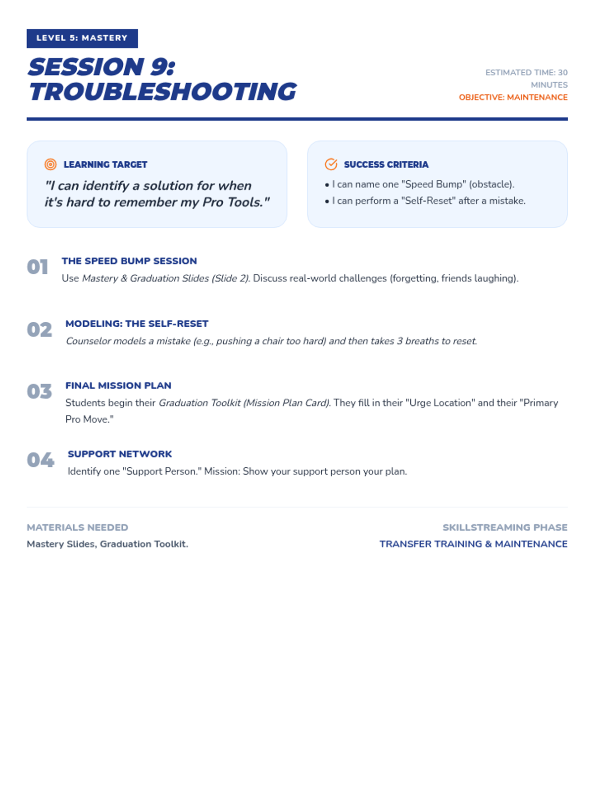 Troubleshooting challenges and finalizing individual regulation plans. Sessions 9 and 10 focus on maintenance, generalization, and graduation.