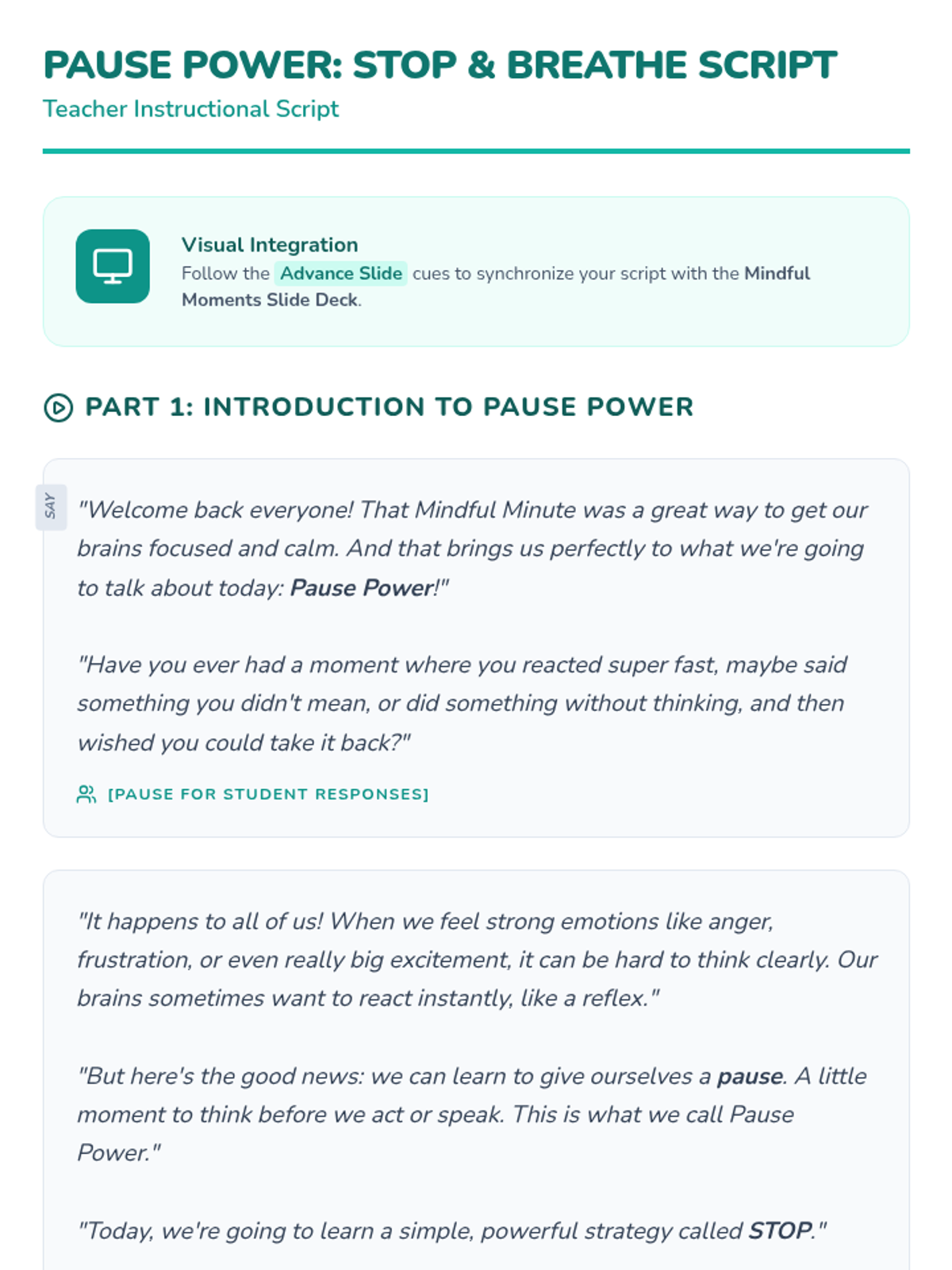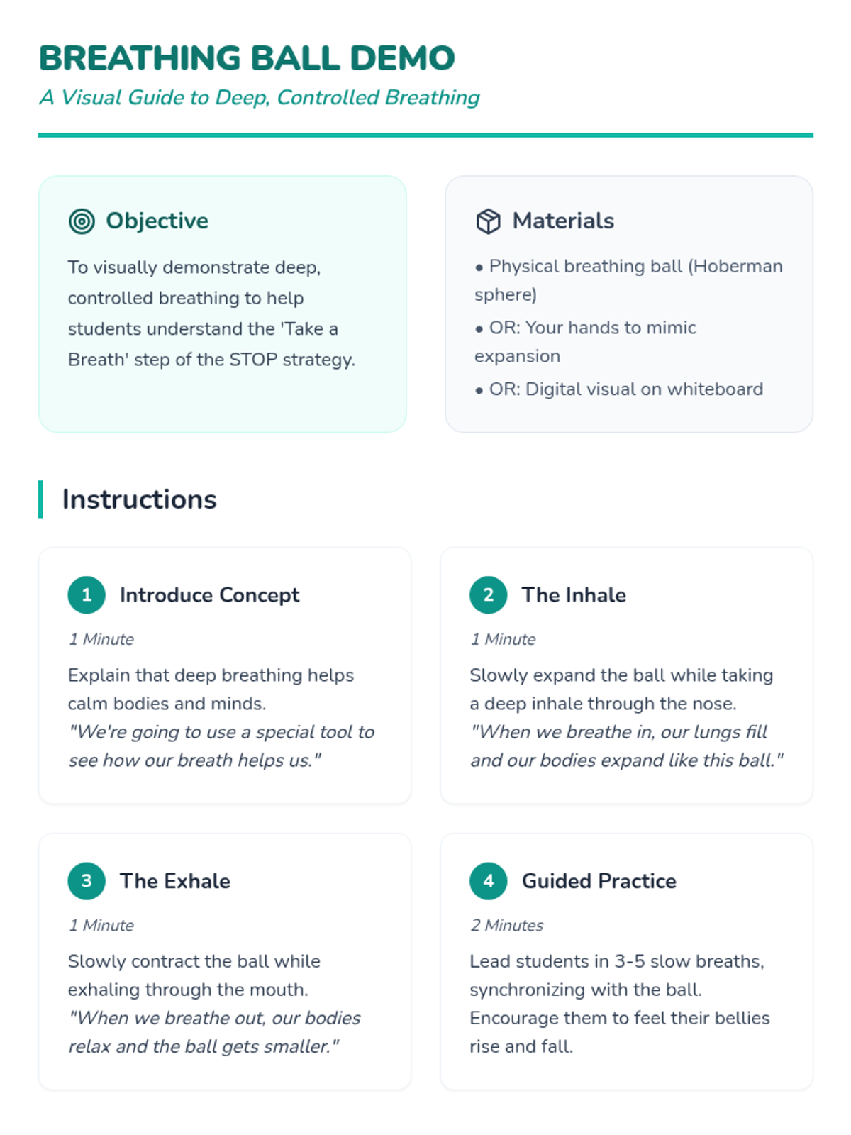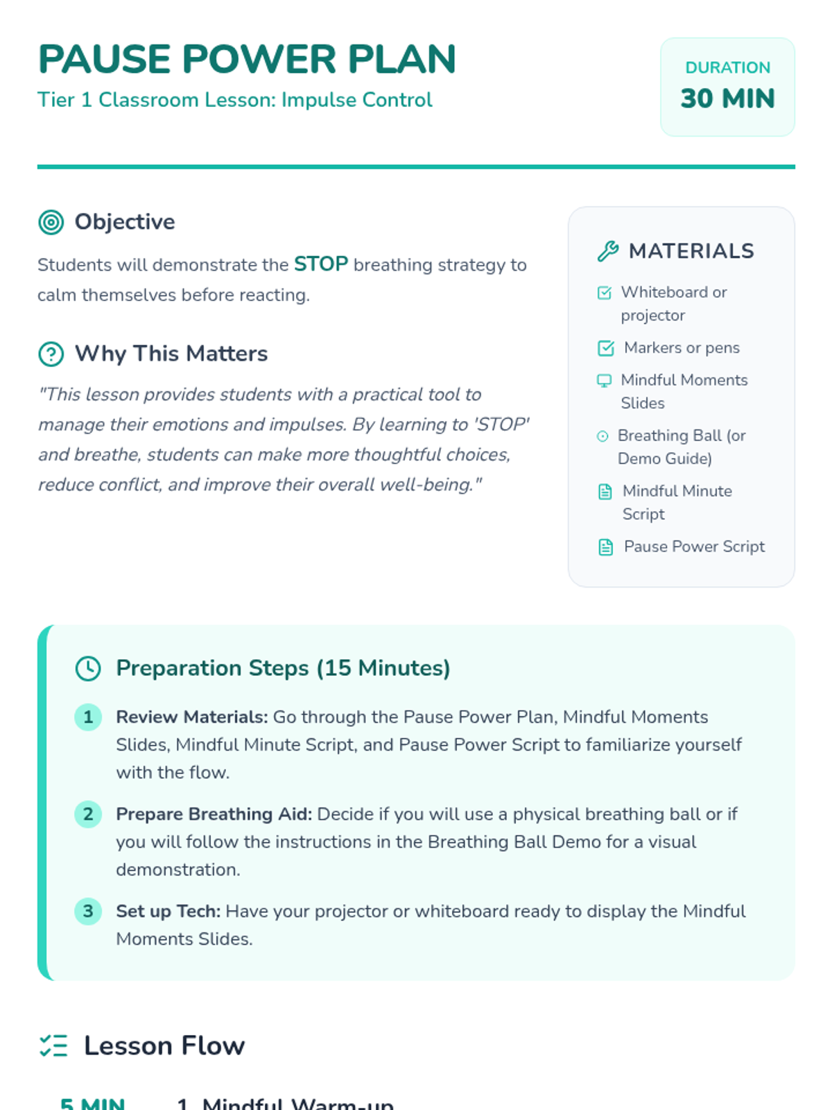 This lesson teaches 5th-grade students the 'STOP' breathing strategy to help them calm down and control their impulses before reacting. Learning this strategy empowers students to manage their emotions and make thoughtful choices, promoting a more peaceful and productive environment.