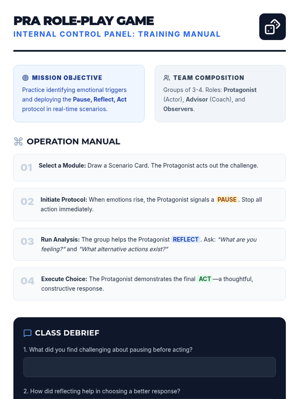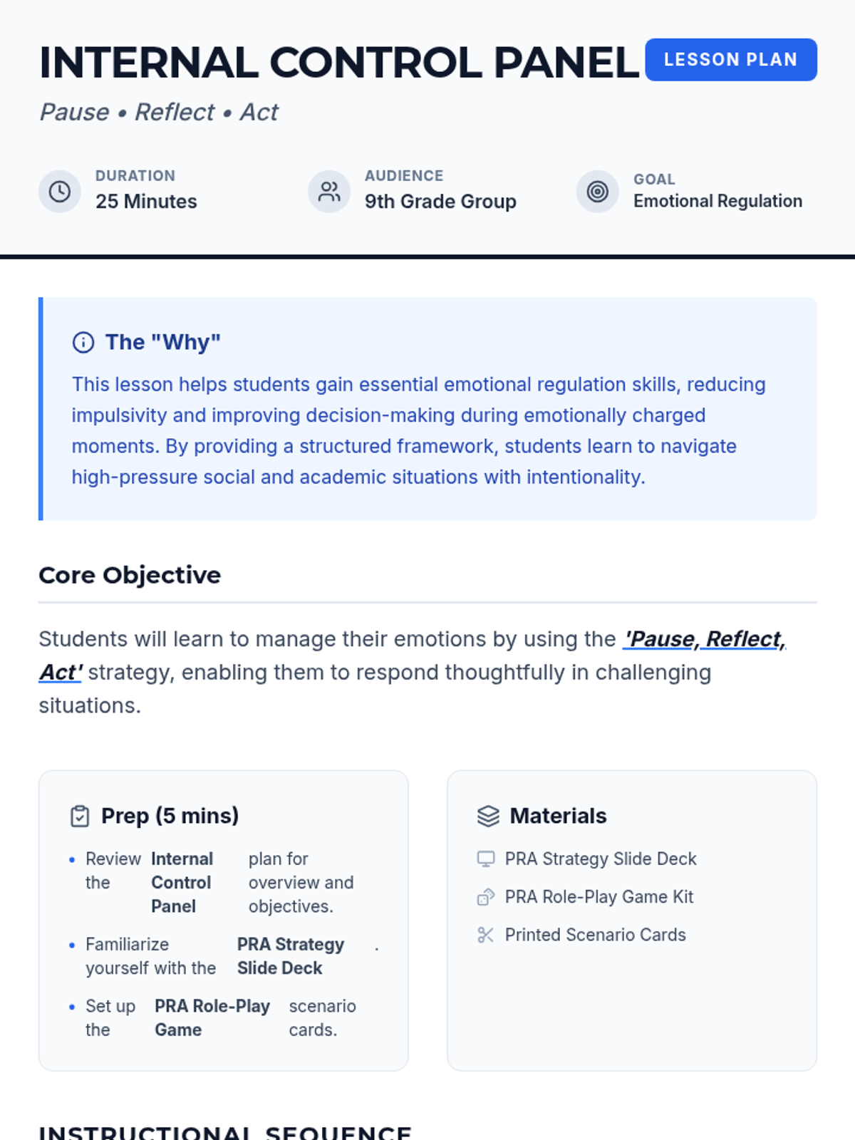 A Tier 2 small group lesson for 9th graders focusing on the 'Pause, Reflect, Act' strategy for emotional regulation and impulsive control.