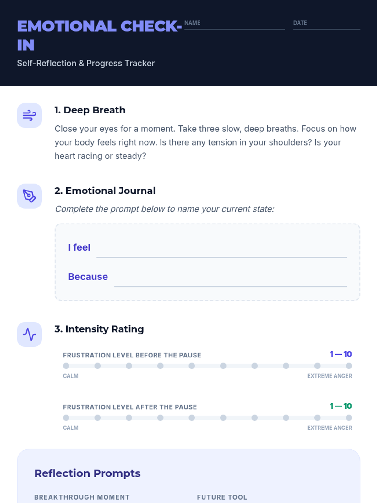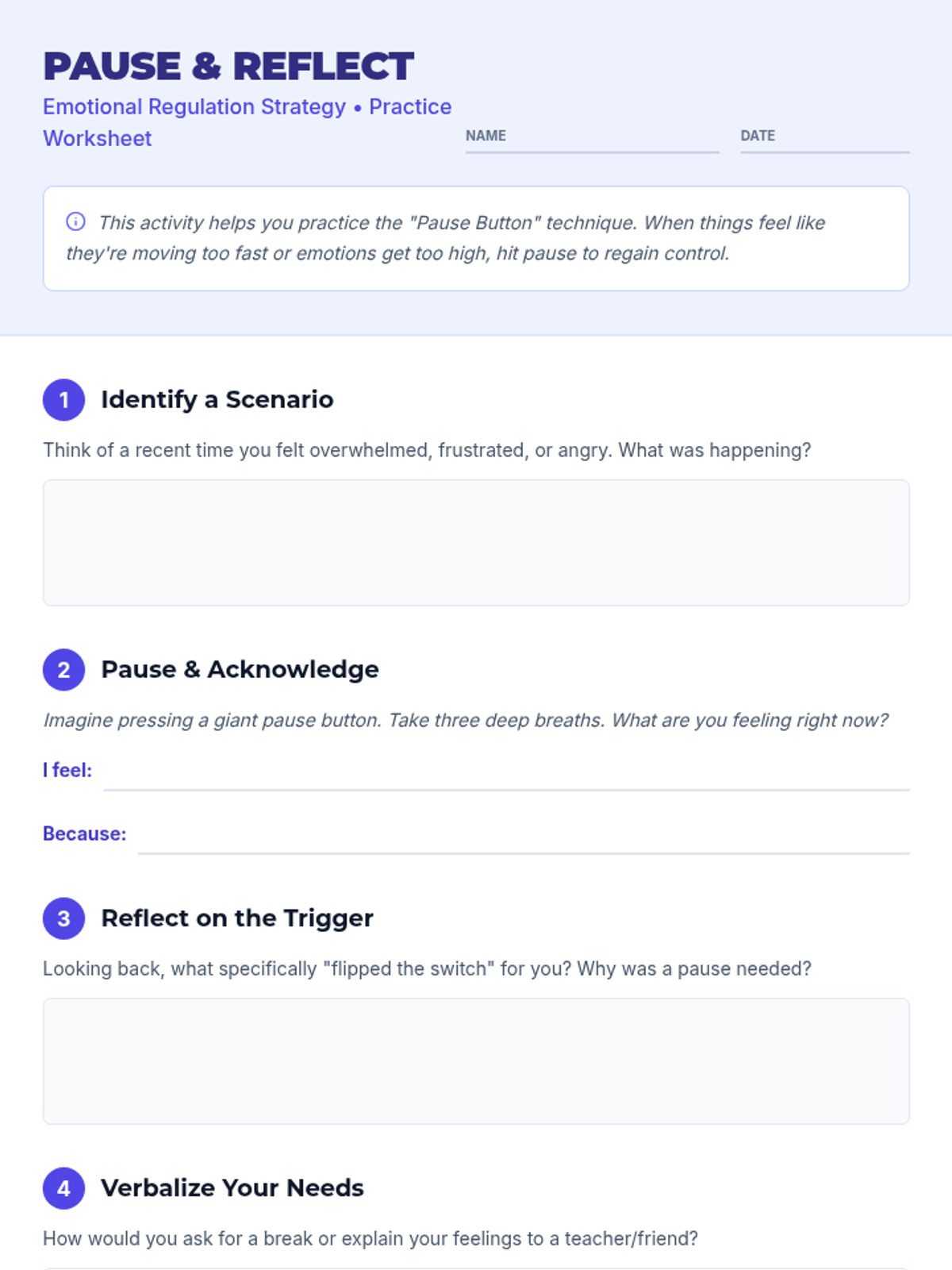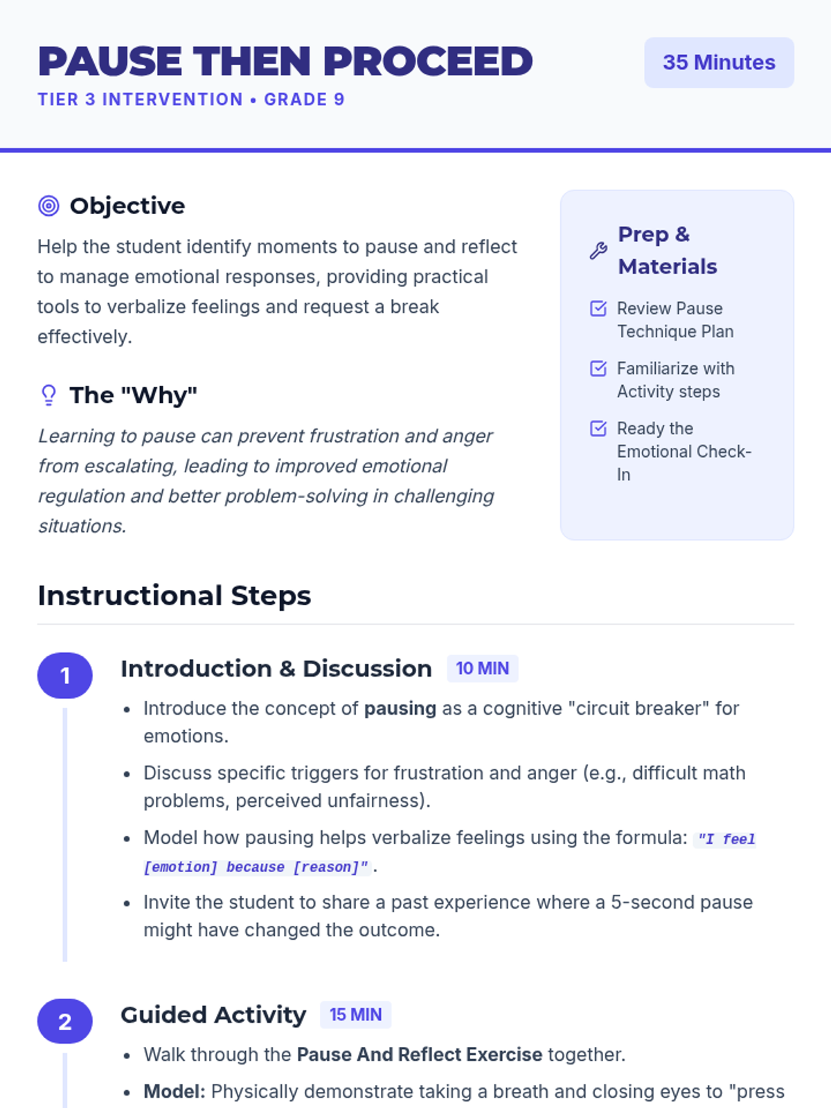 A 35-minute Tier 3 intervention for 9th-grade students to master the 'pause' technique for emotional regulation. Students learn to identify triggers, practice verbalizing needs, and use reflective strategies to prevent emotional outbursts.