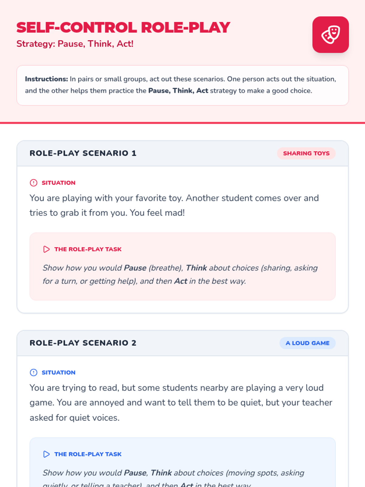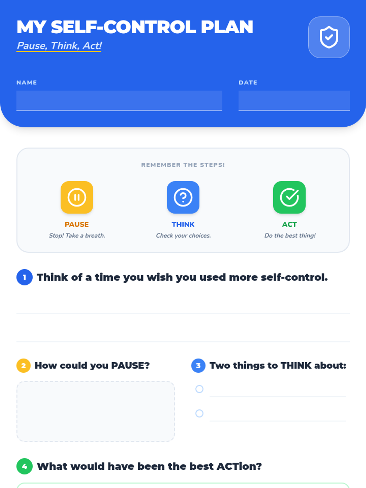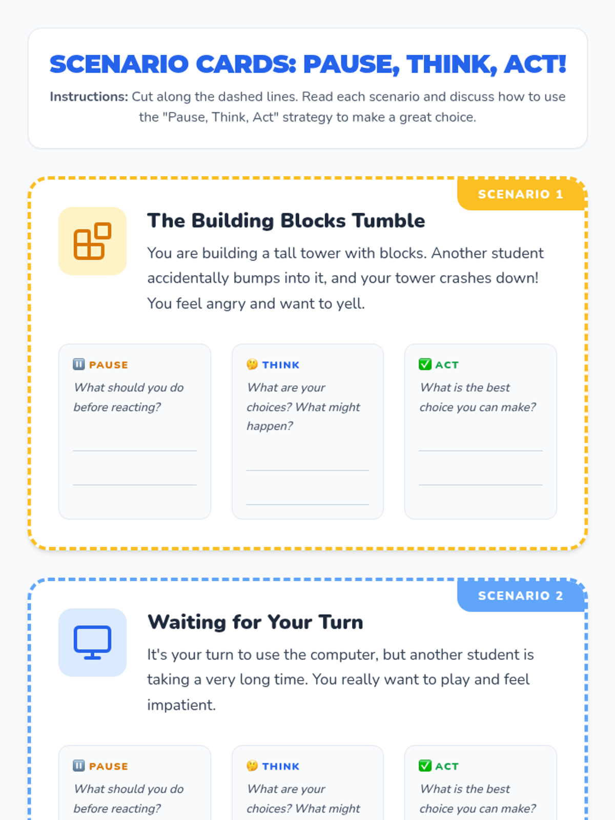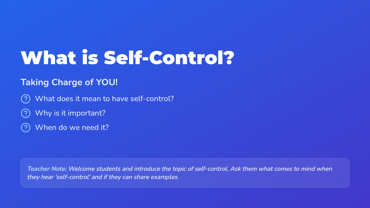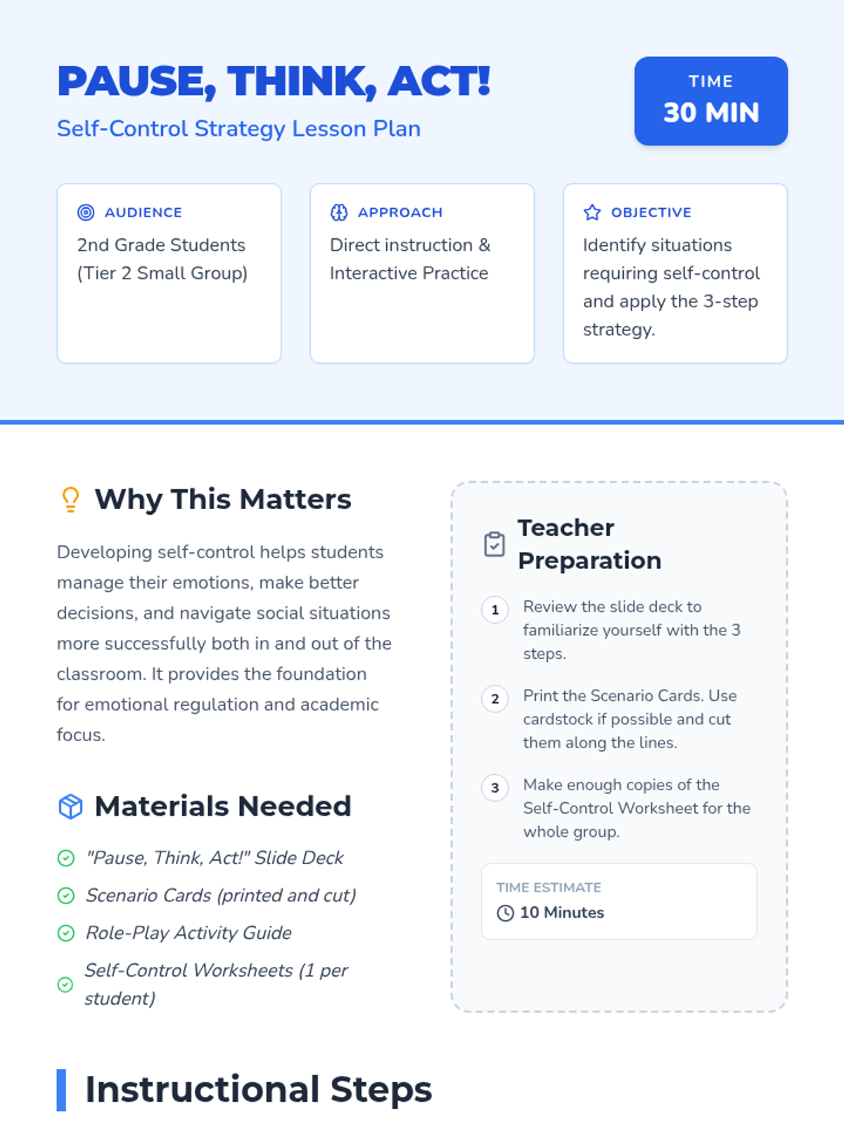A 30-minute Tier 2 small group lesson for 2nd graders to develop self-regulation skills using the 'Pause, Think, Act' strategy. Students explore self-control through discussion, slides, scenario cards, role-play, and reflective writing.