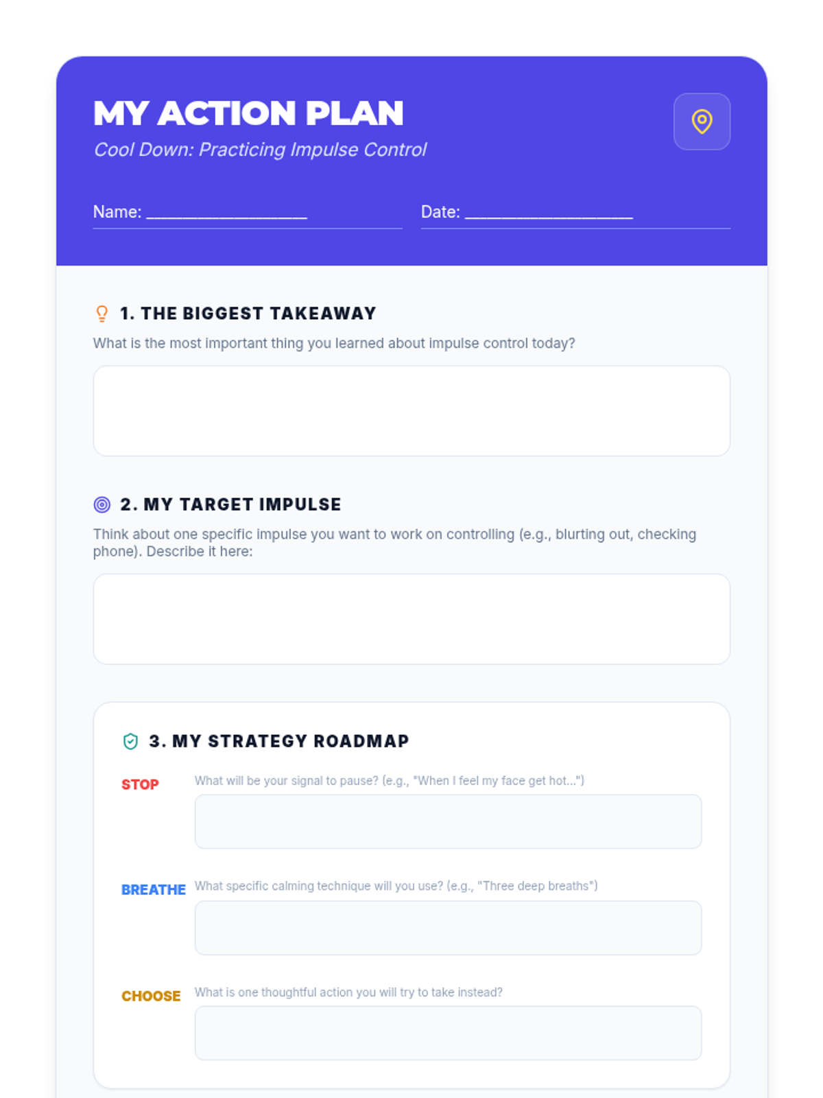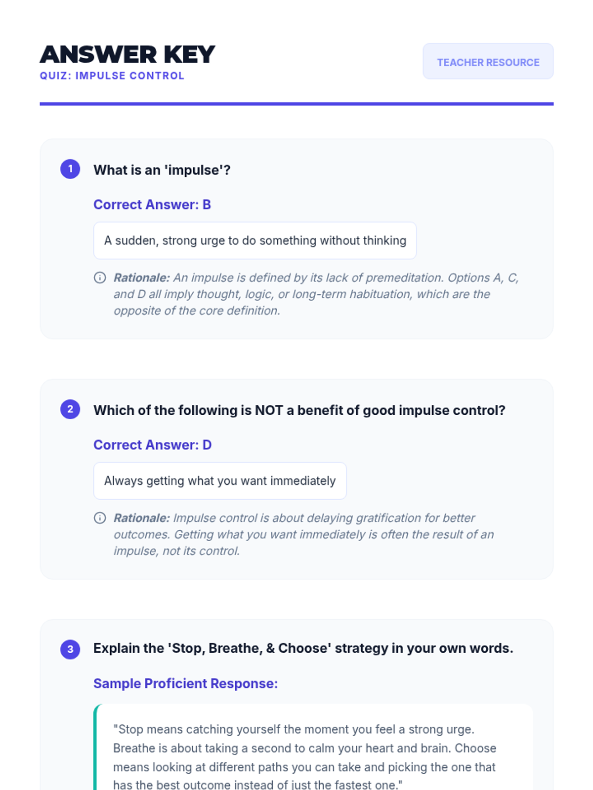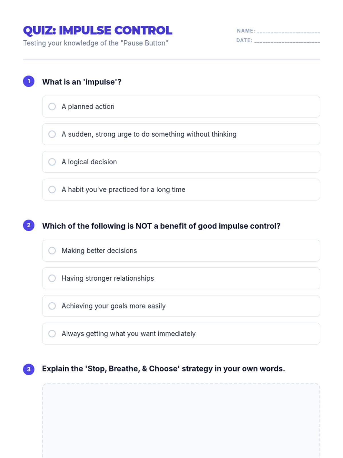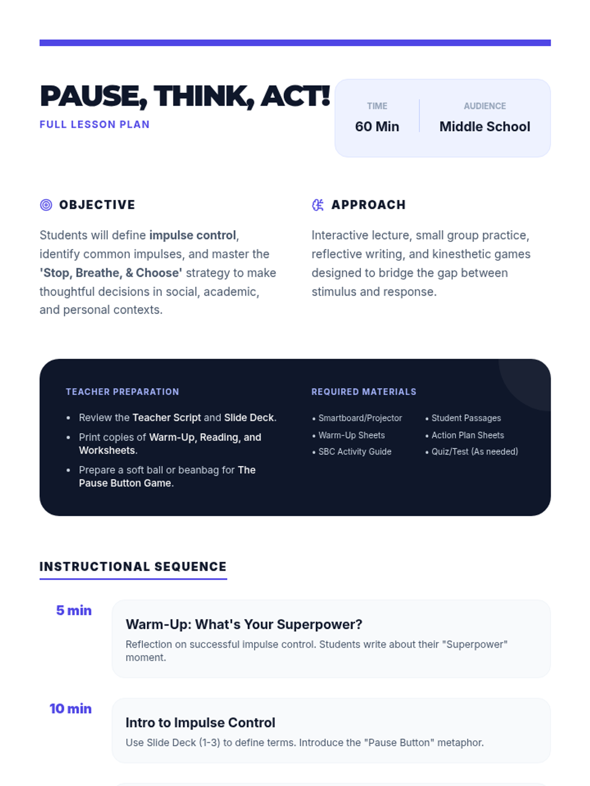 This lesson empowers middle school students with essential impulse control strategies through the 'Stop, Breathe, & Choose' method. Students explore the impact of impulsive behavior and practice techniques to respond thoughtfully in social, academic, and personal situations.