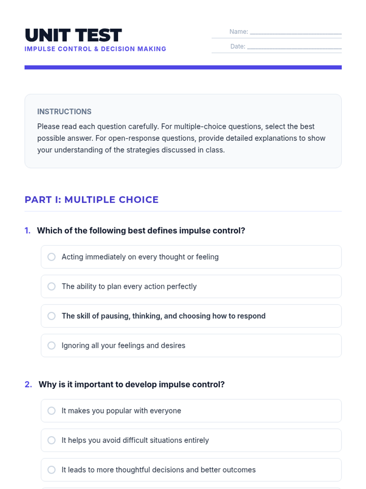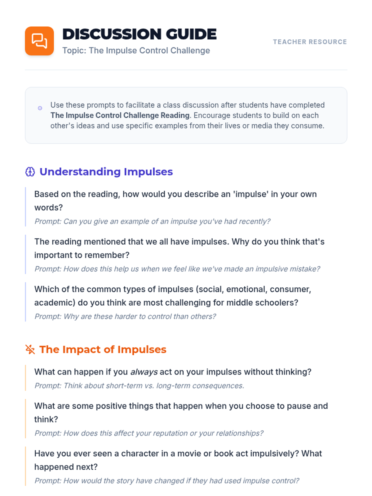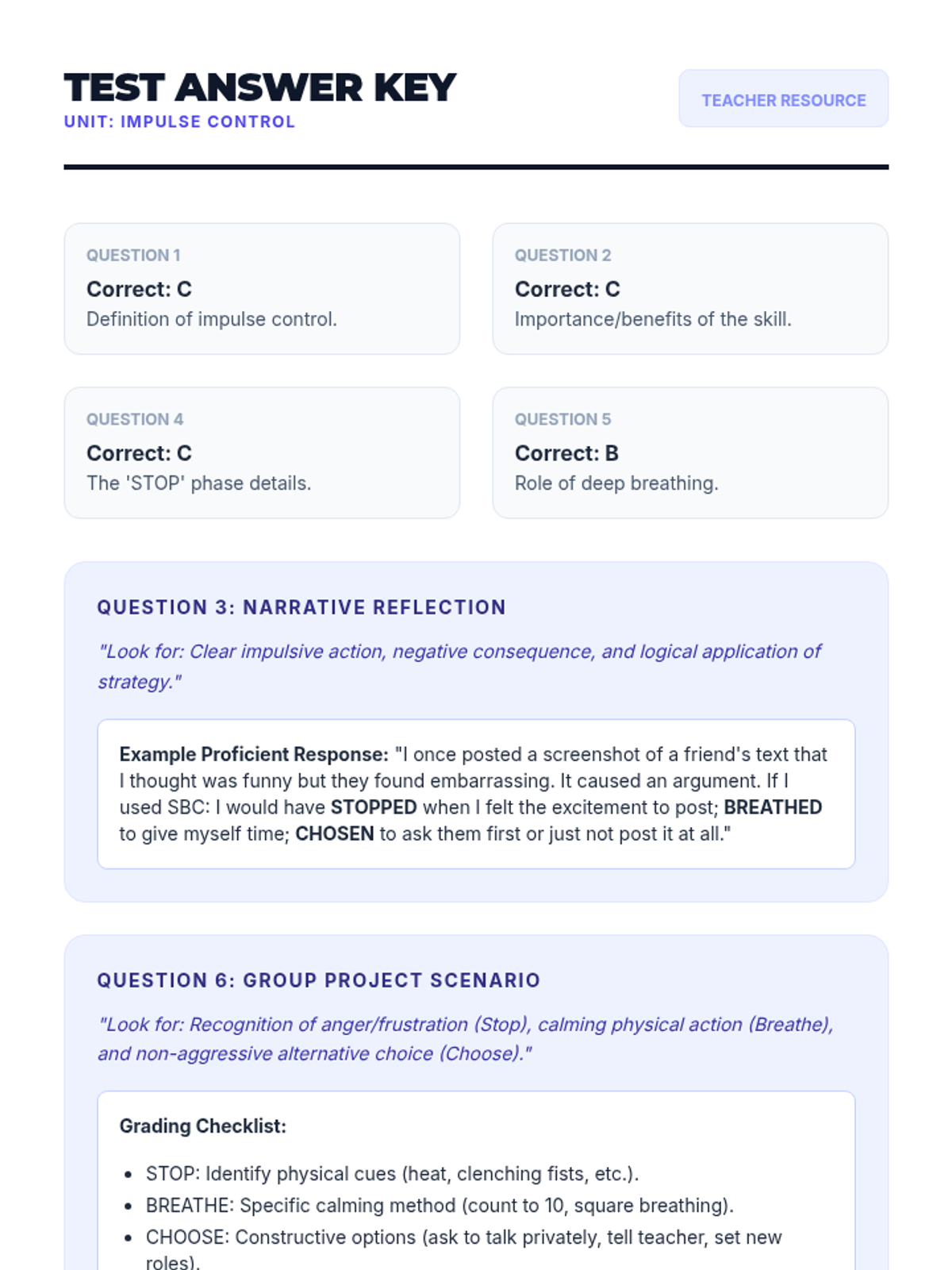 This lesson empowers middle school students with essential impulse control strategies through the 'Stop, Breathe, & Choose' method. Students explore the impact of impulsive behavior and practice techniques to respond thoughtfully in social, academic, and personal situations.