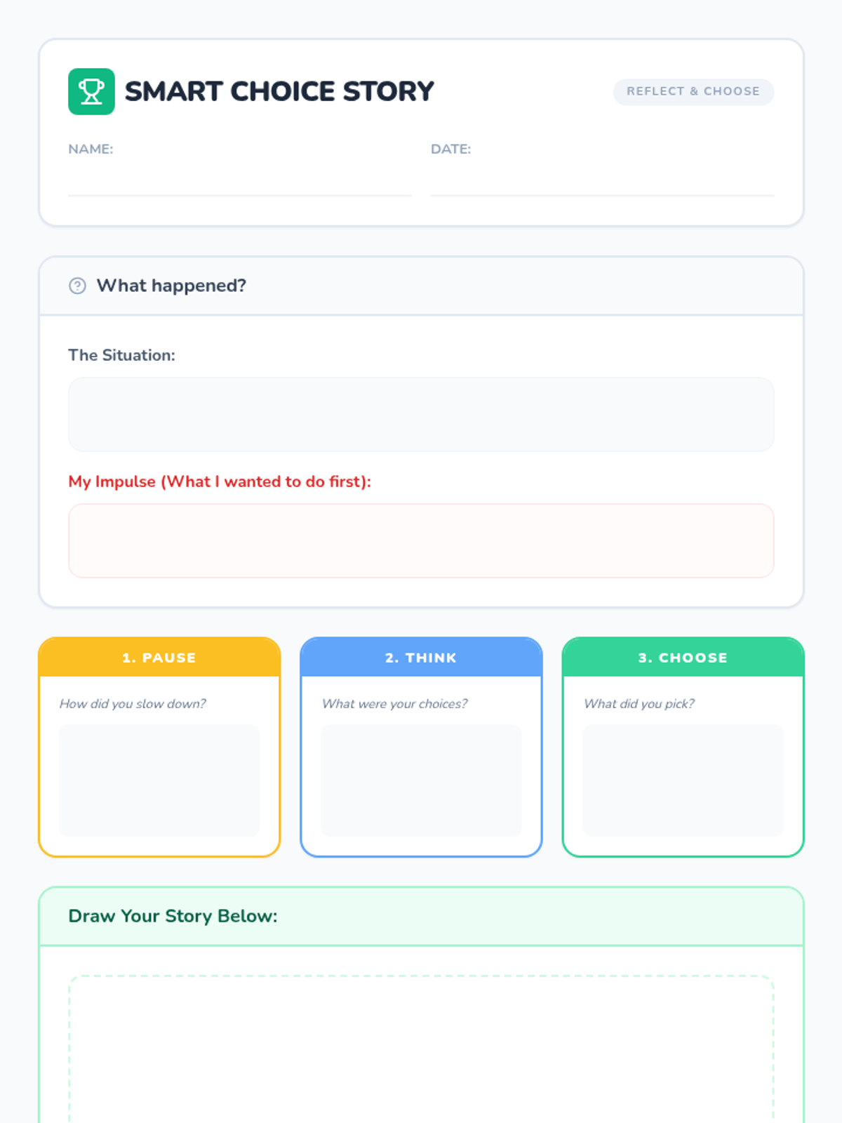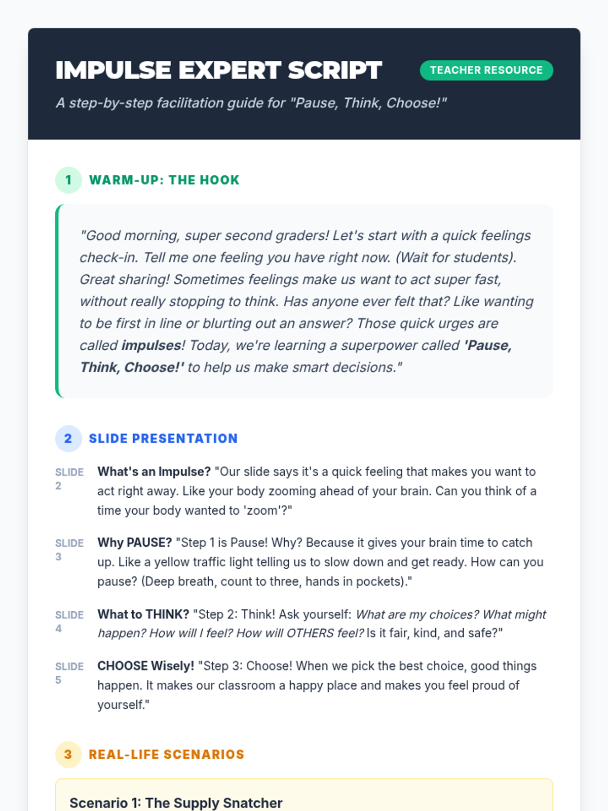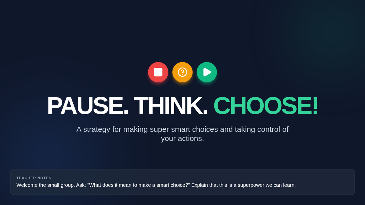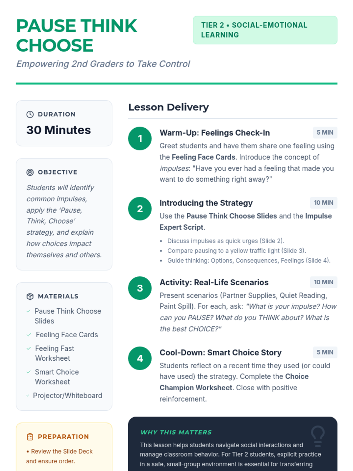A 30-minute Tier 2 small group lesson for 2nd graders to develop impulse control and thoughtful decision-making through the 'Pause, Think, Choose' strategy.