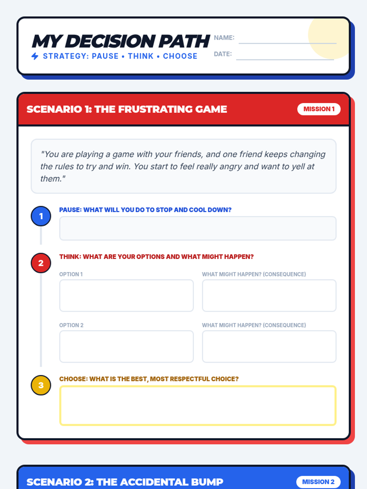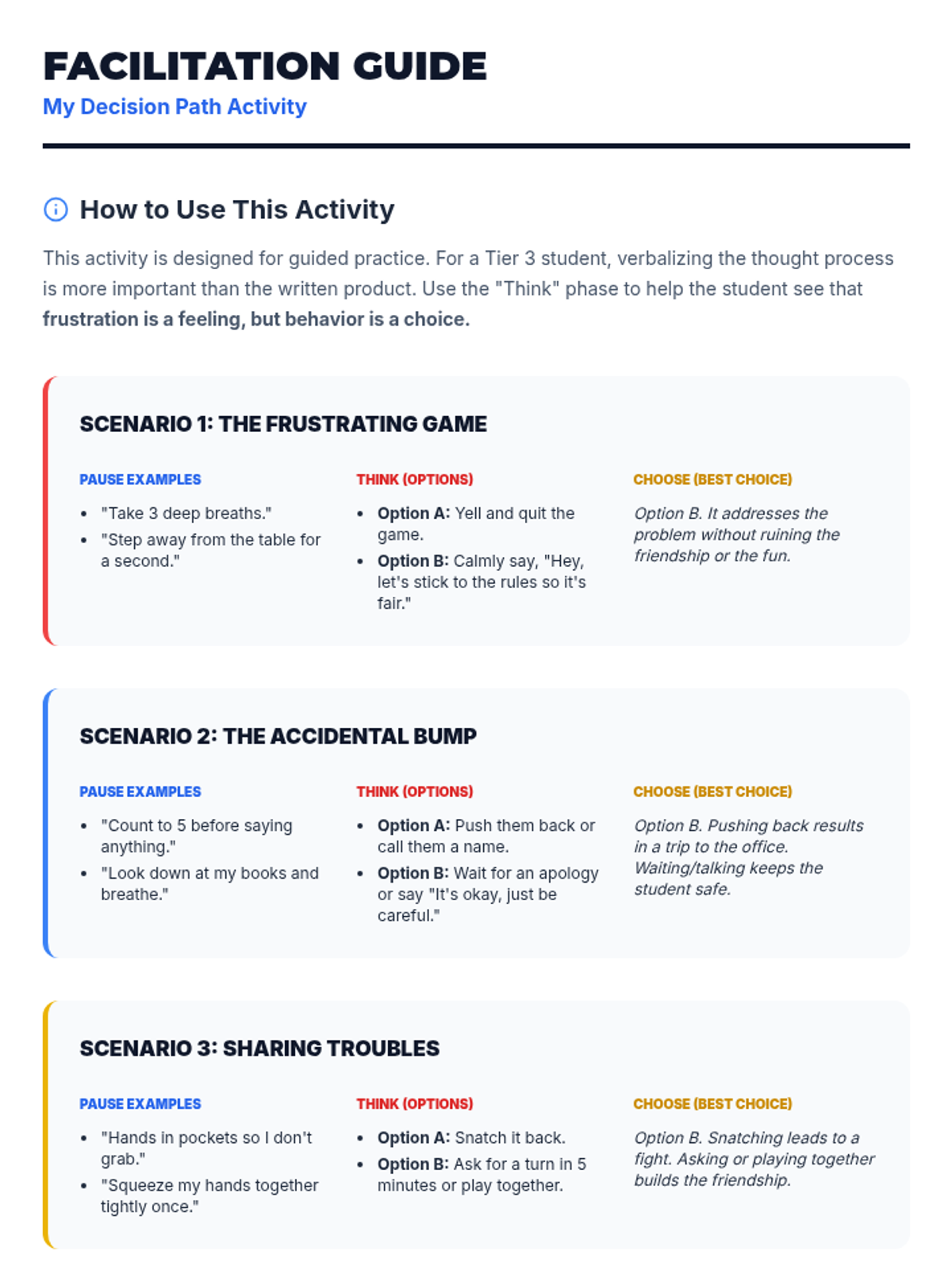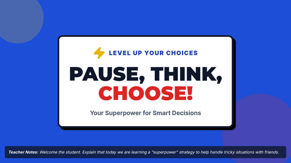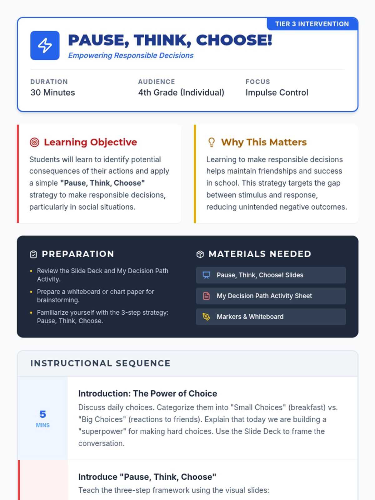 A 30-minute individual Tier 3 lesson for a 4th-grade boy focusing on the 'Pause, Think, Choose' strategy to manage impulsivity and make responsible social decisions.