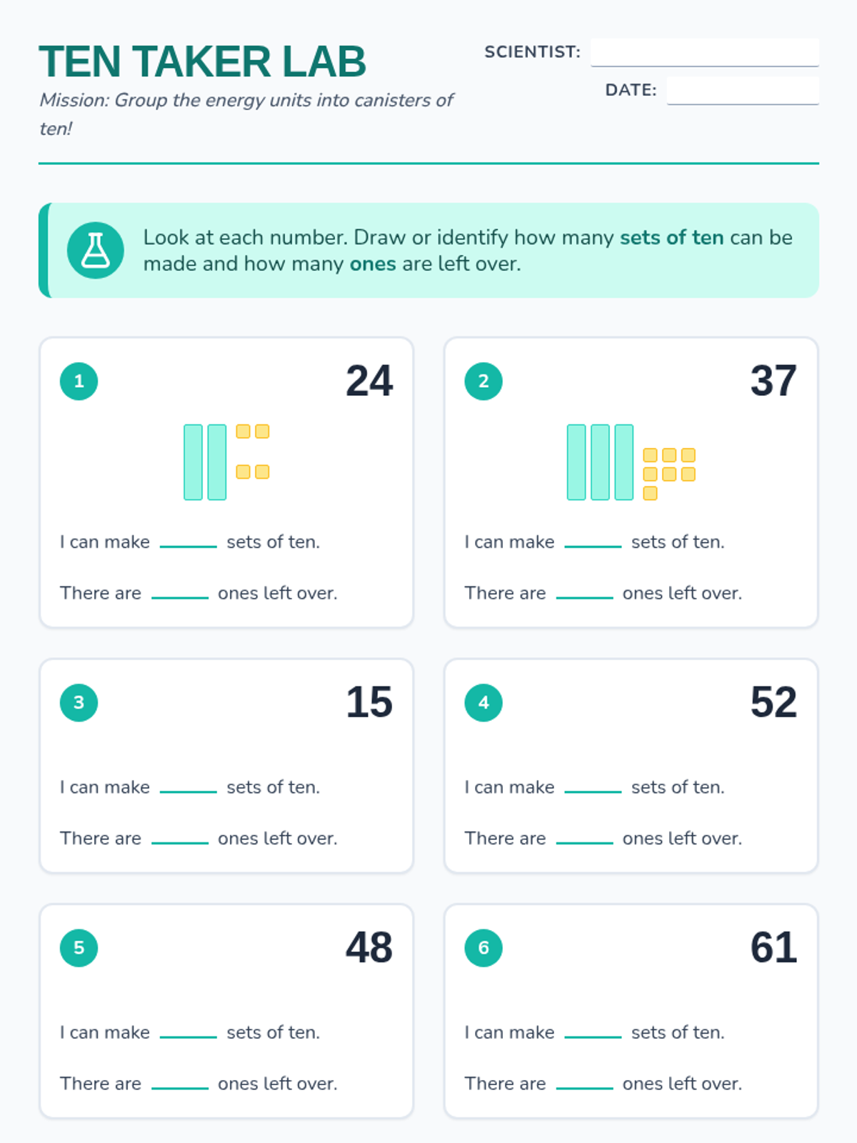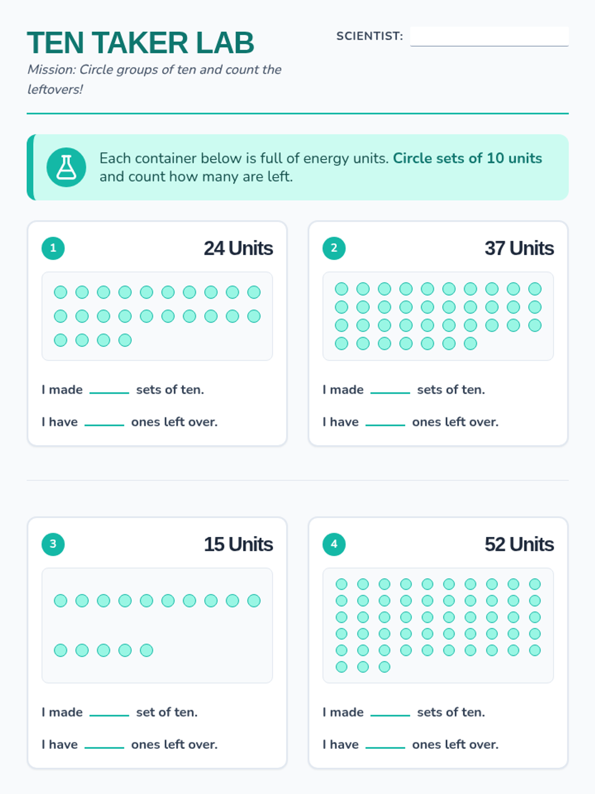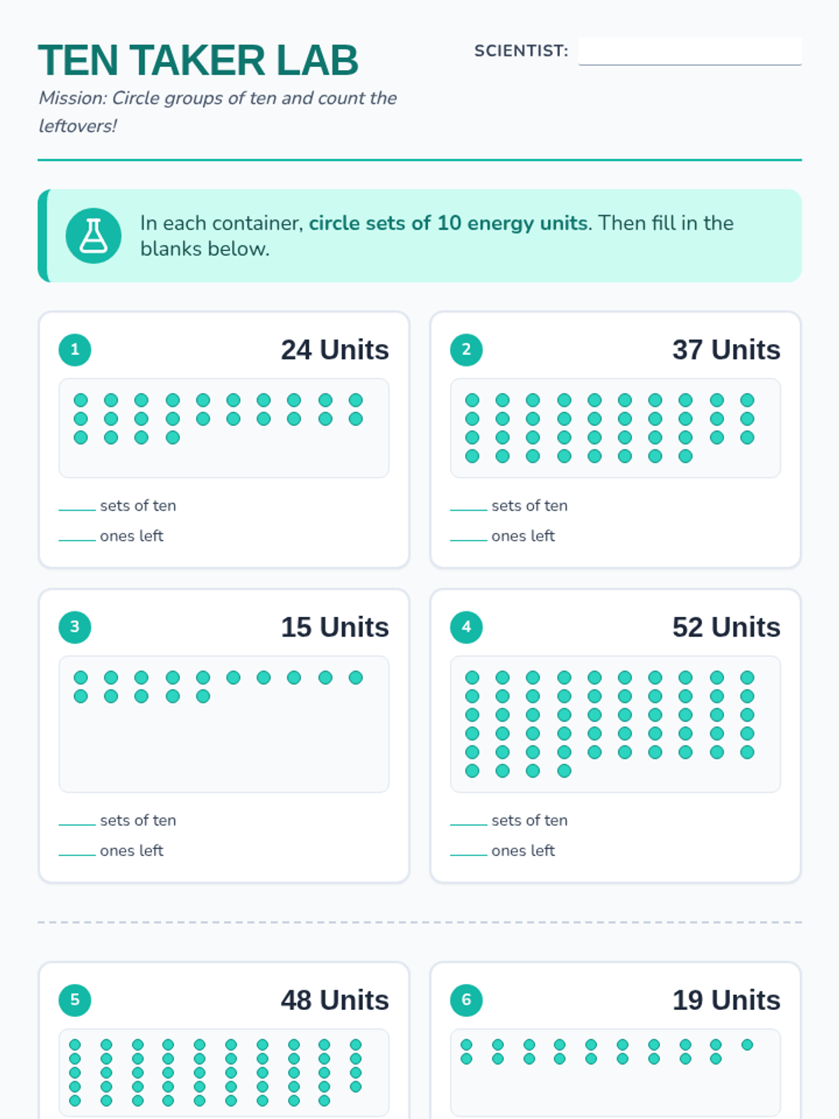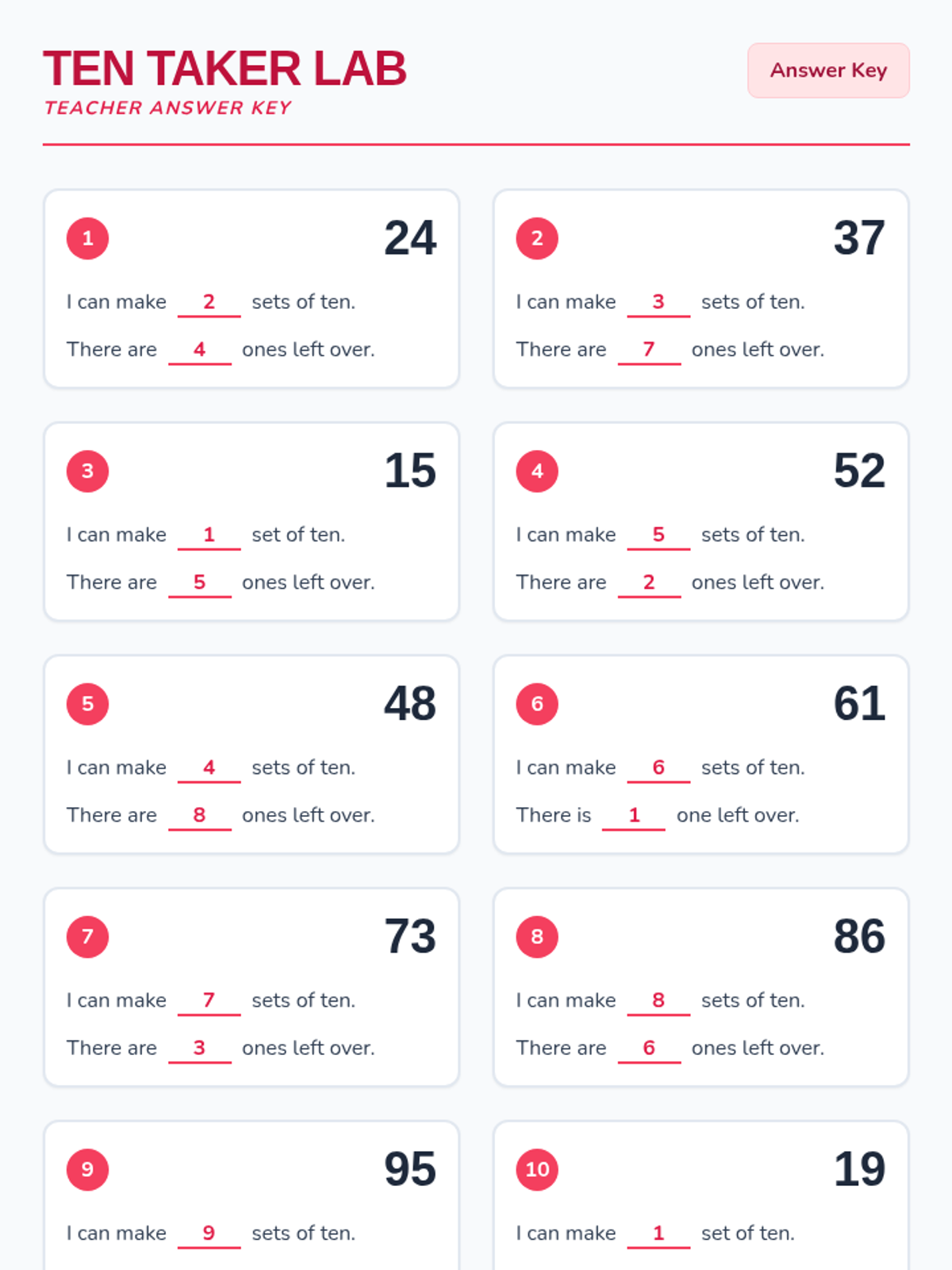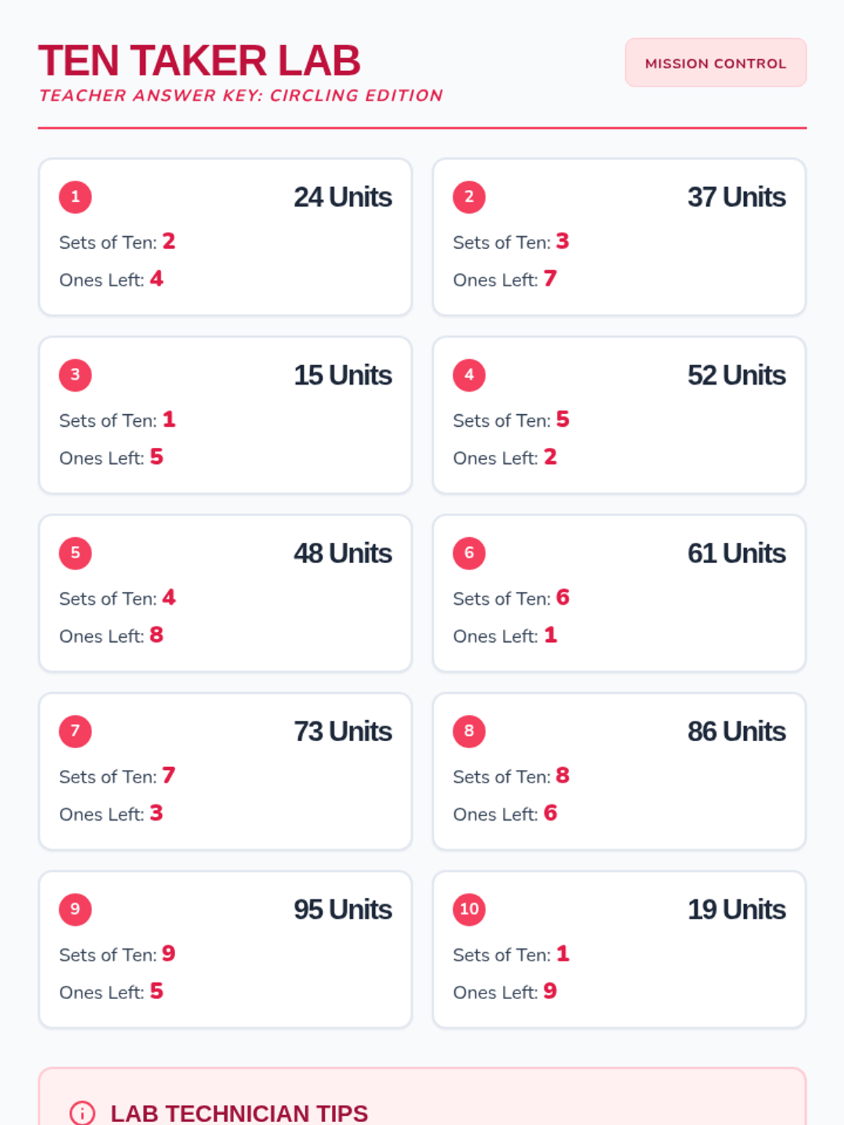 A hands-on lesson focused on place value where students group units into sets of ten and identify the remaining ones for numbers up to 99.