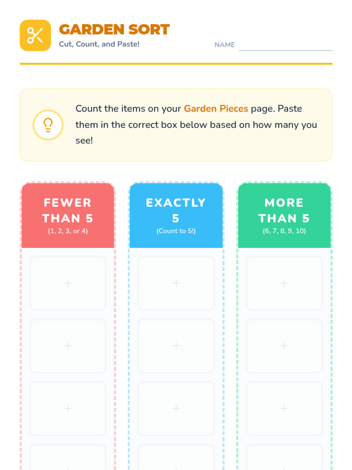 A kindergarten math lesson focusing on addition and subtraction within 10, comparing quantities, and extending patterns through a 'Garden Explorers' theme. Includes group instruction slides, independent practice worksheets, and a hands-on sorting activity.