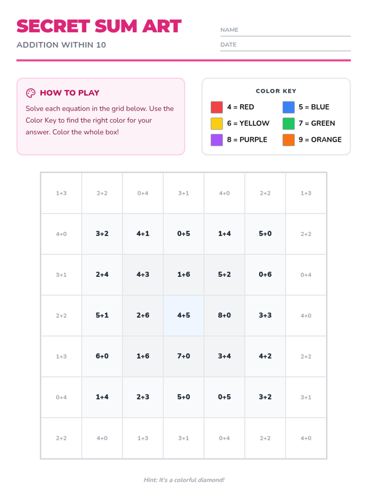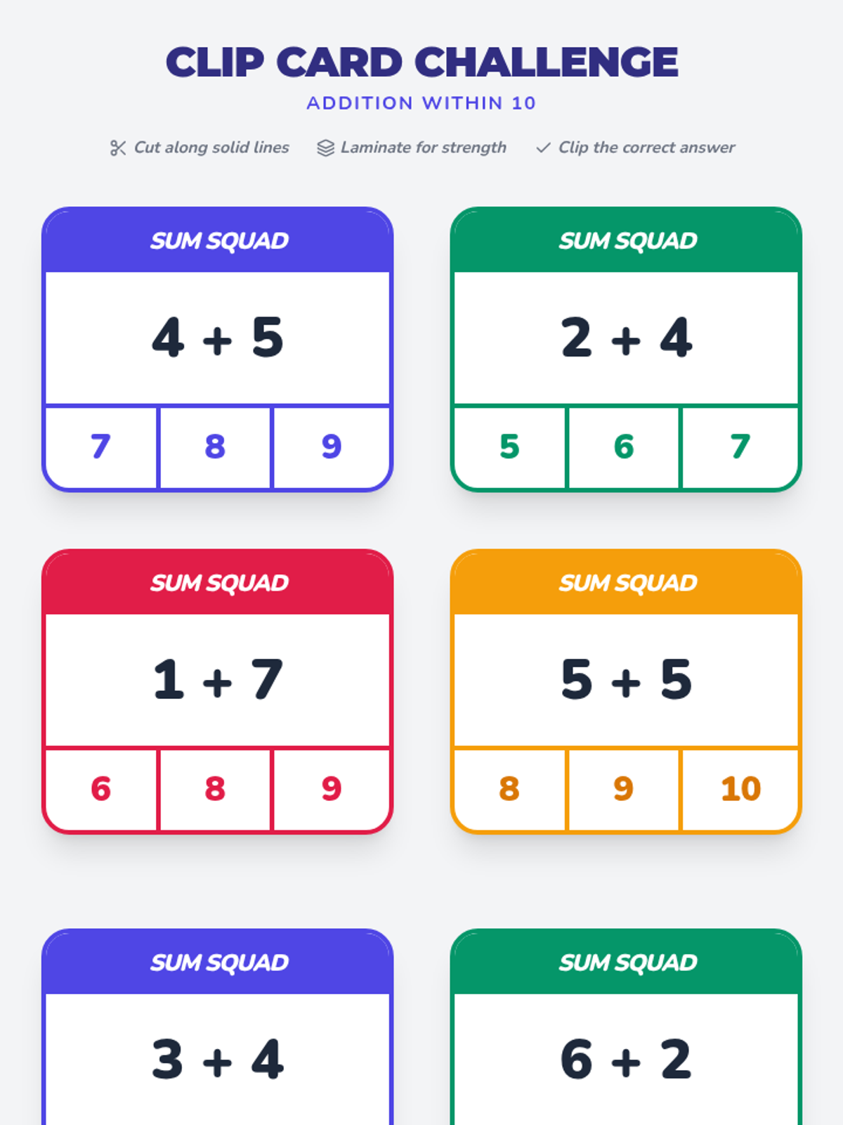 A collection of independent addition activities for sums within 10, designed for students to complete without assistance. Includes hands-on matching, artistic coloring, and interactive games.