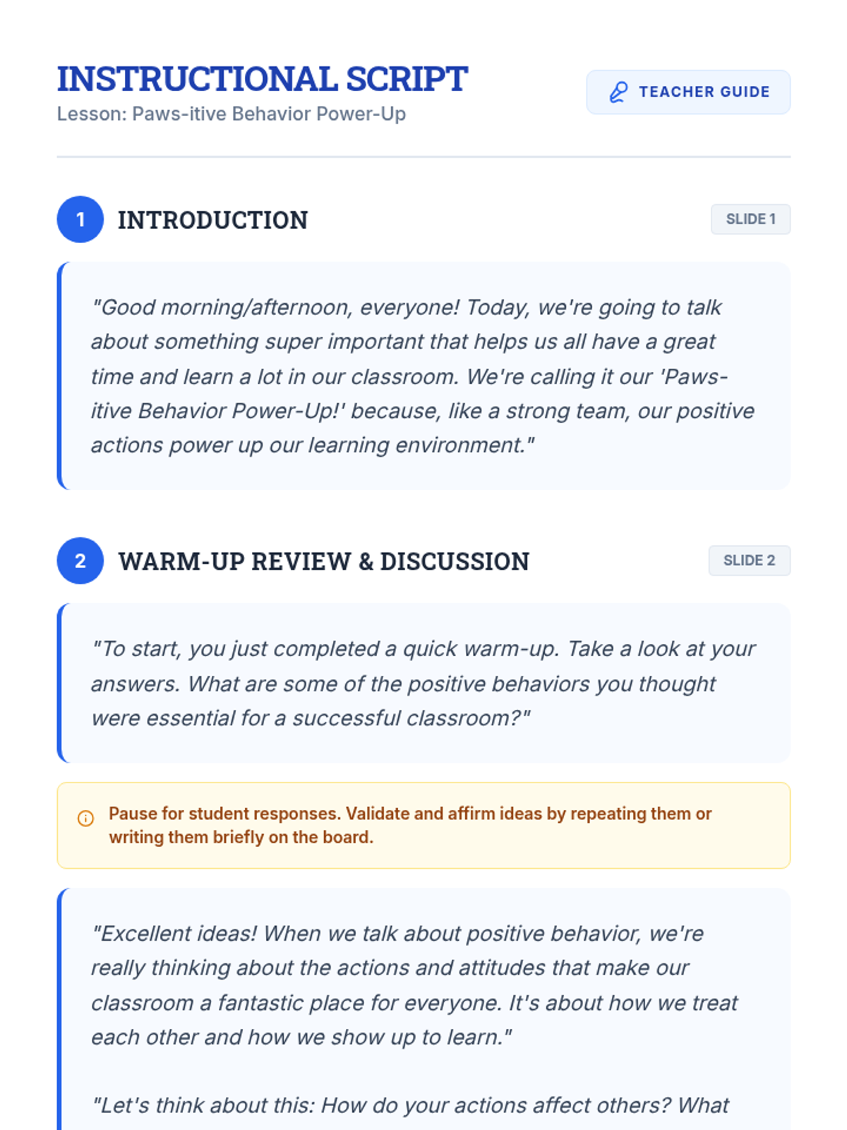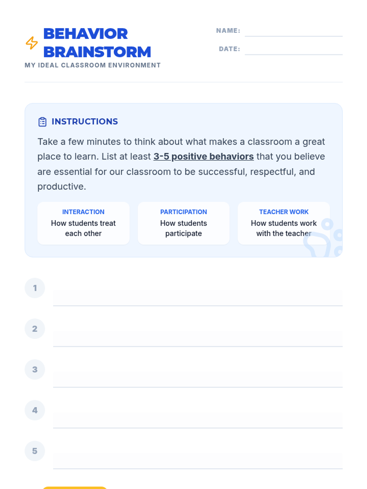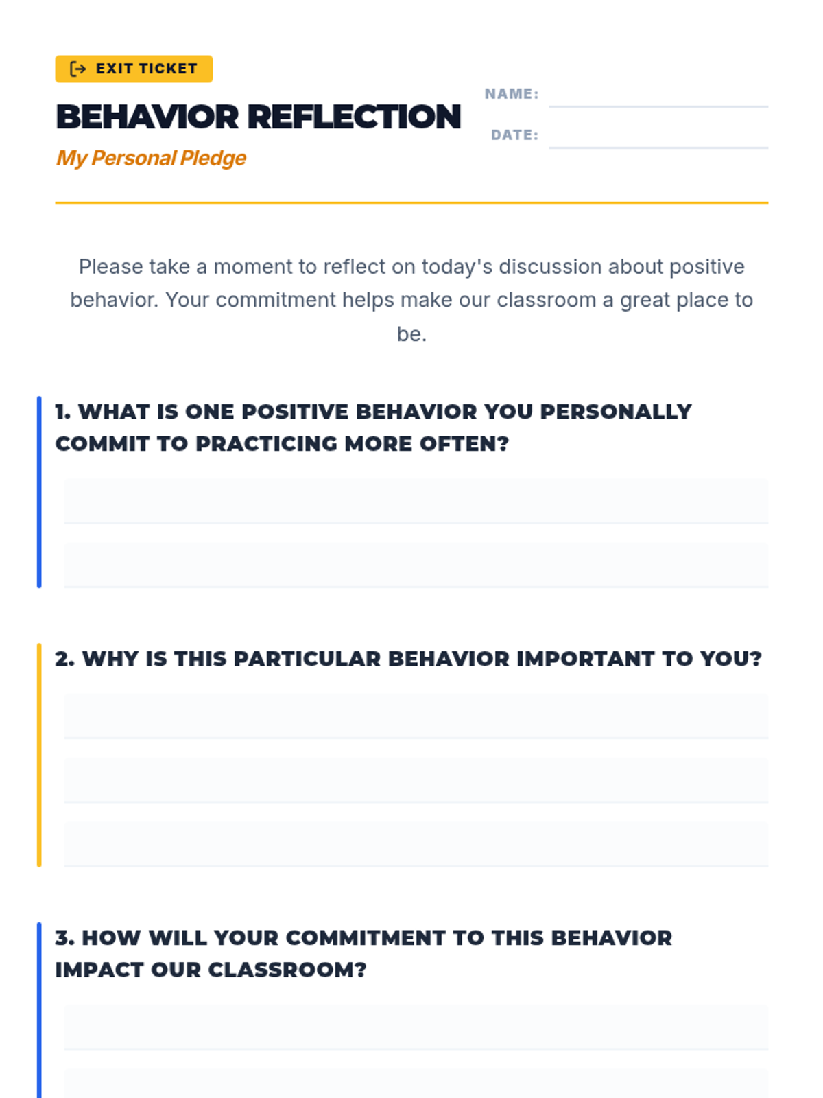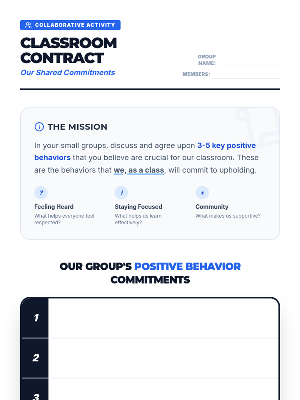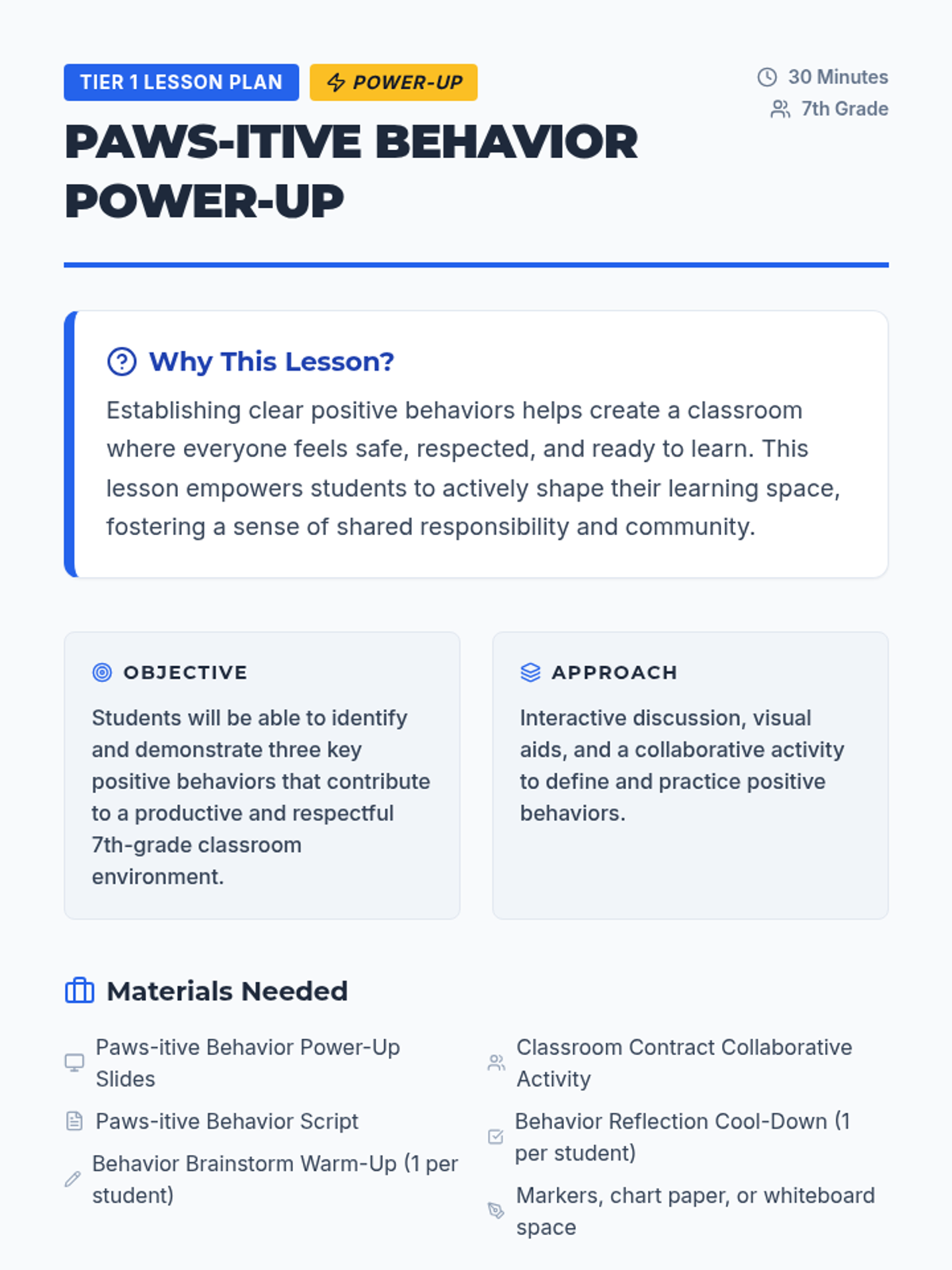 A 30-minute Tier 1 lesson for 7th graders focused on establishing and reinforcing positive classroom behaviors through collaborative contract-building and personal reflection.