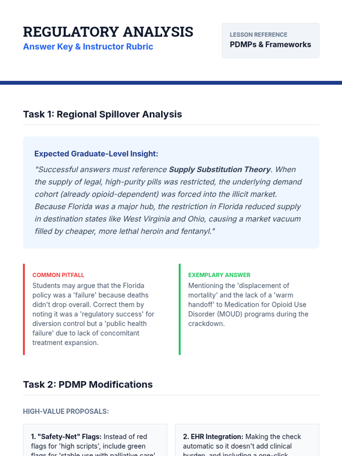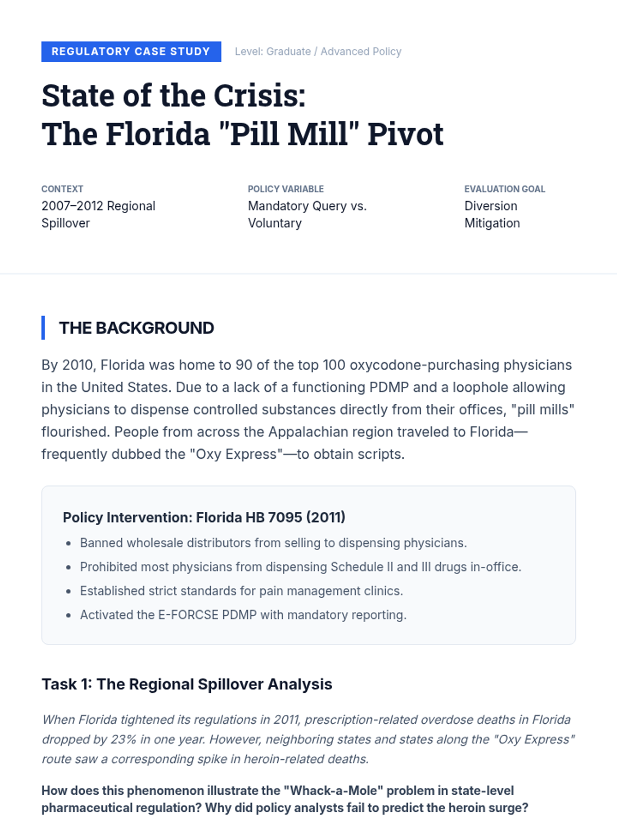 Evaluates the utility and limitations of Prescription Drug Monitoring Programs (PDMPs). Students simulate the role of policy analysts to critique state-level regulations and propose improvements to balance patient access with diversion control.