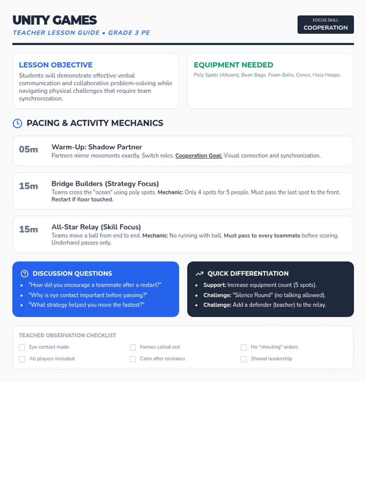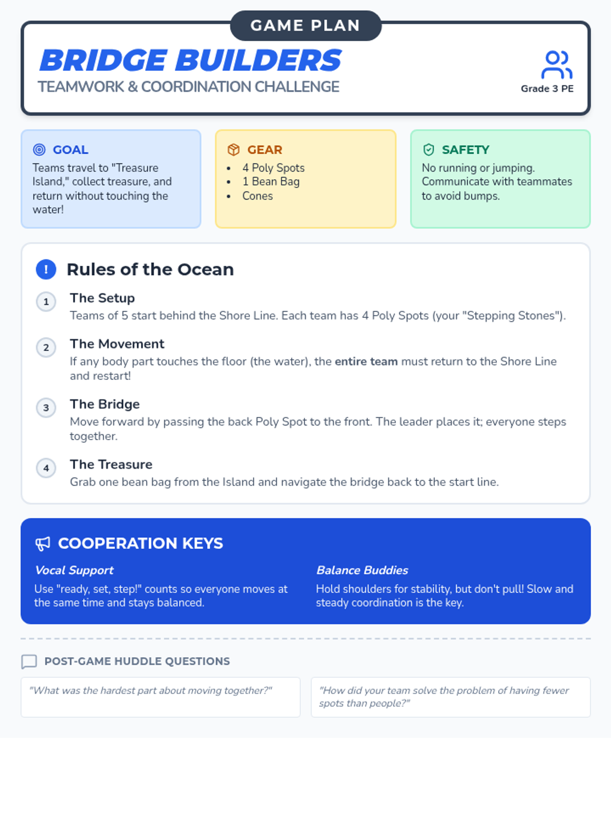 A PE lesson focused on developing teamwork and cooperative movement through a strategic 'bridge-building' challenge. Students must work together to navigate an 'ocean' using limited resources.