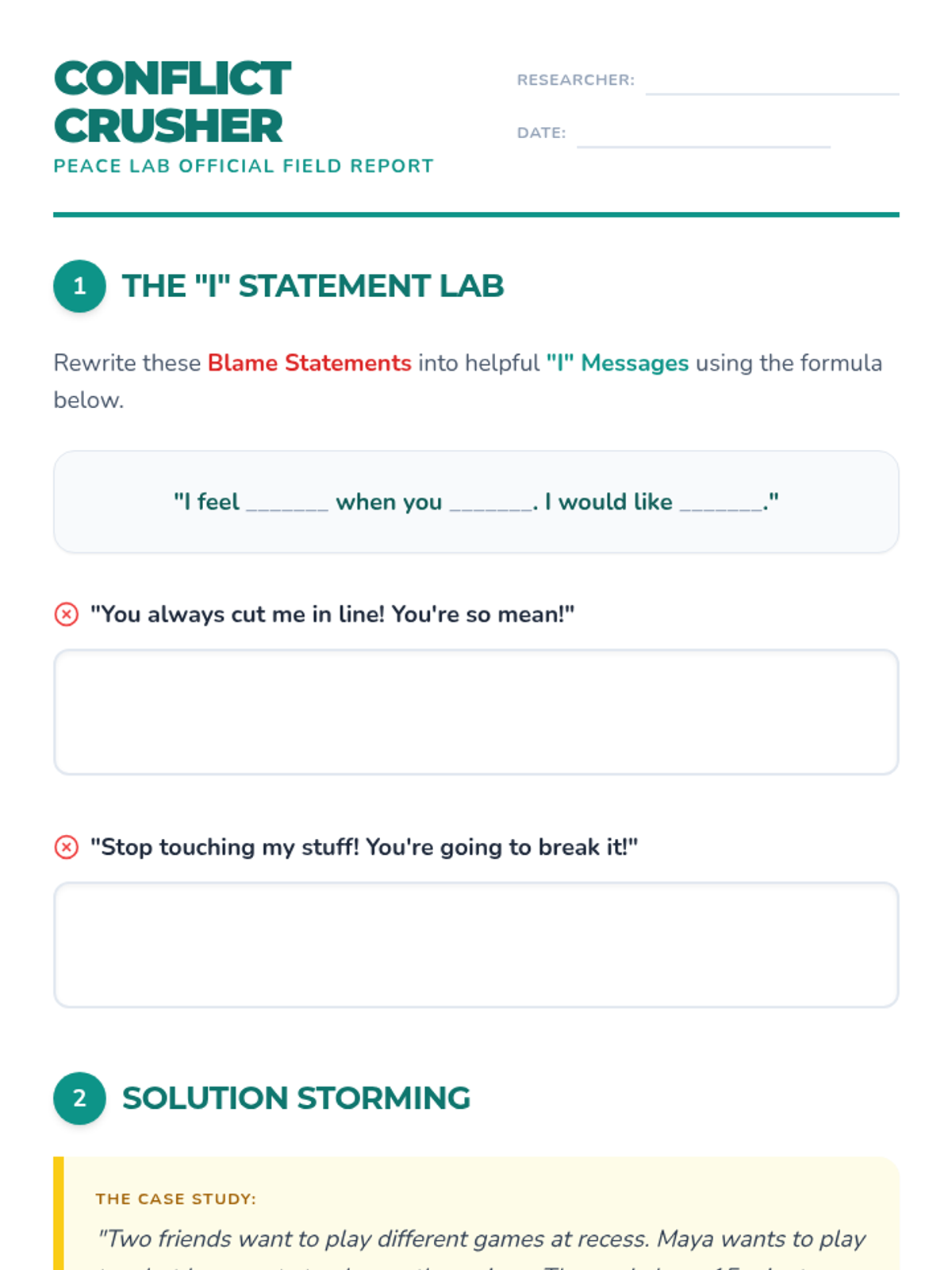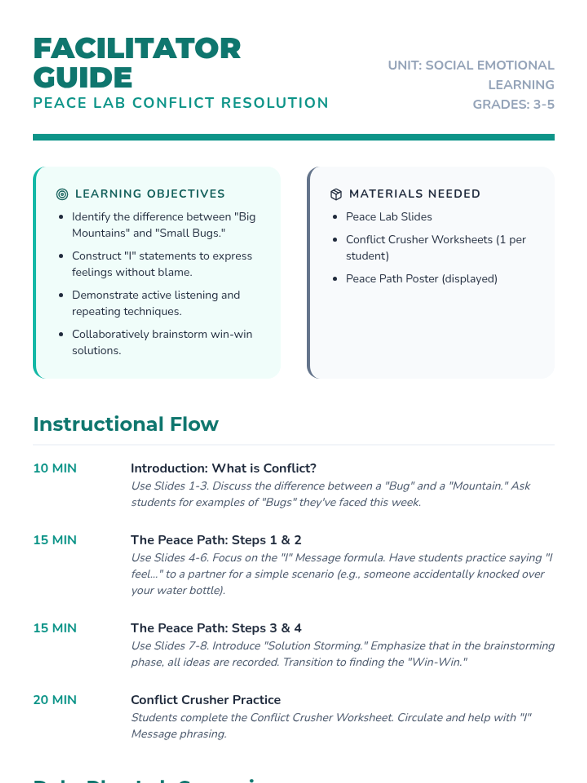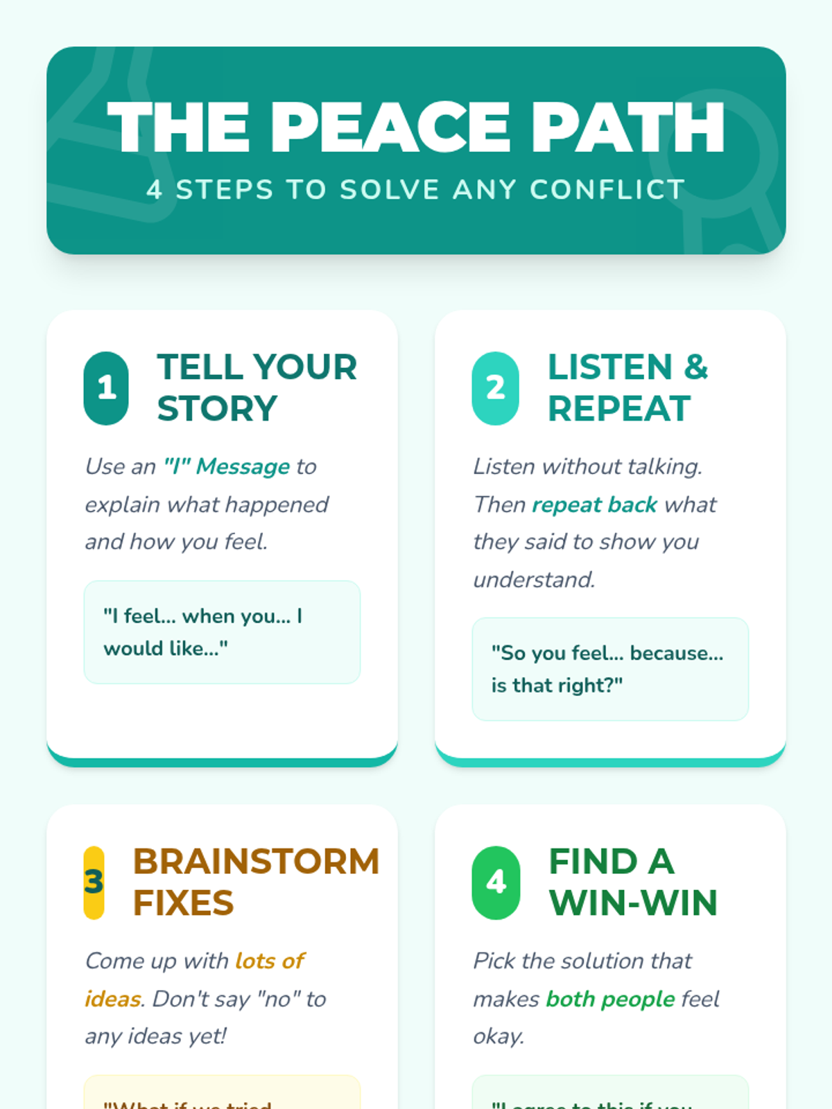 A comprehensive lesson teaching grades 3-5 students how to navigate conflicts using the 'Peace Path' framework. Students will learn 'I' statements, active listening, and collaborative brainstorming to solve peer disagreements.