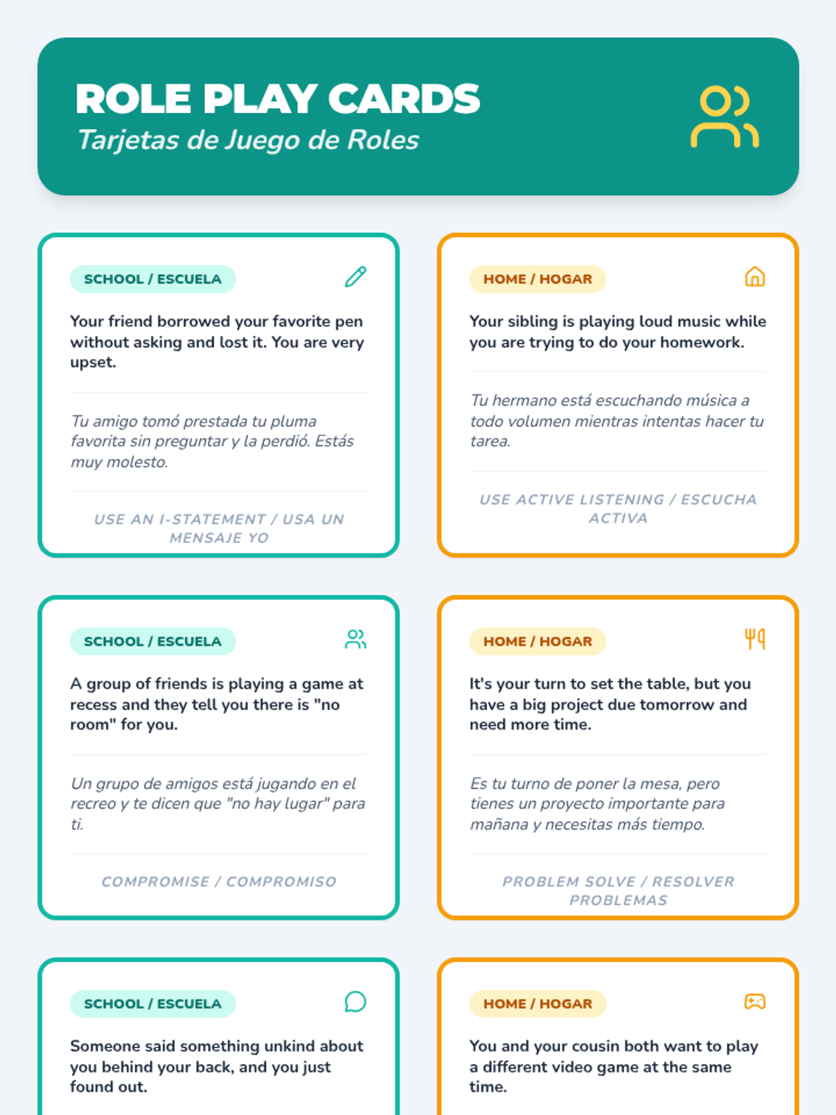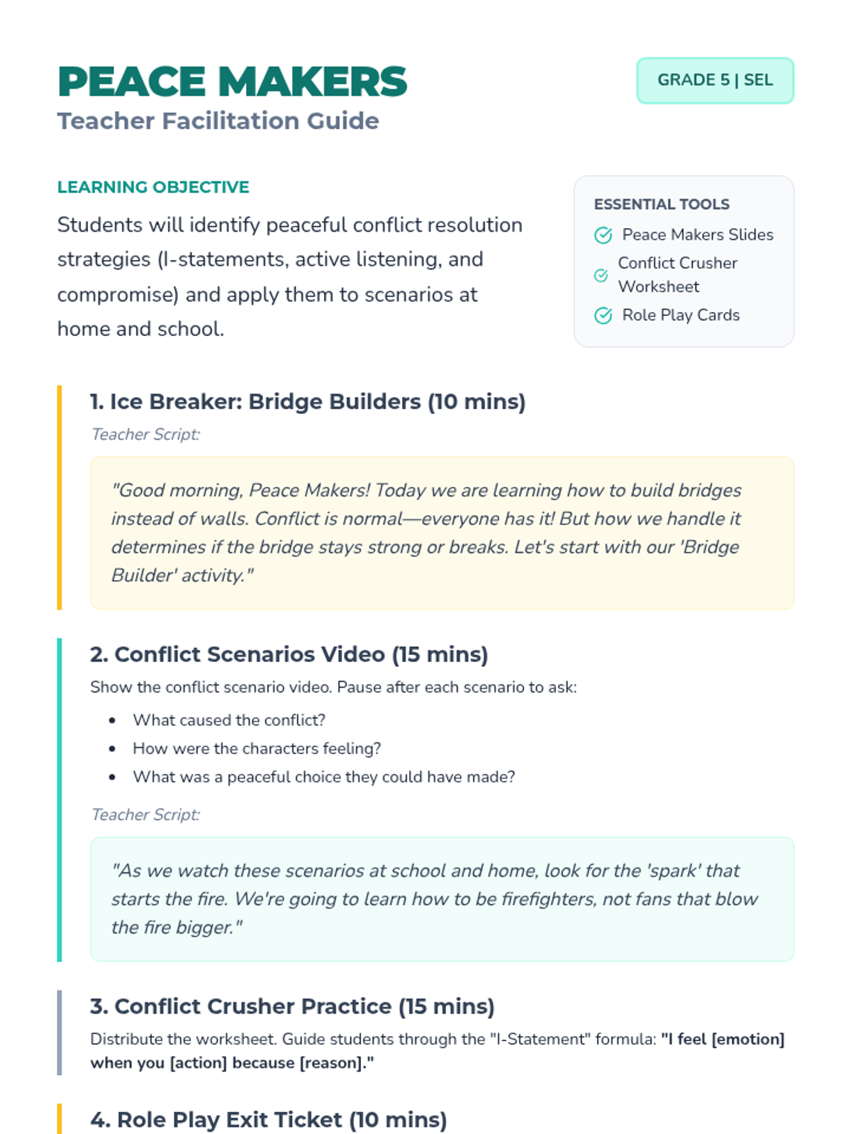 A comprehensive 5th-grade lesson on conflict resolution, focusing on peaceful strategies for school and home, available in both English and Spanish.