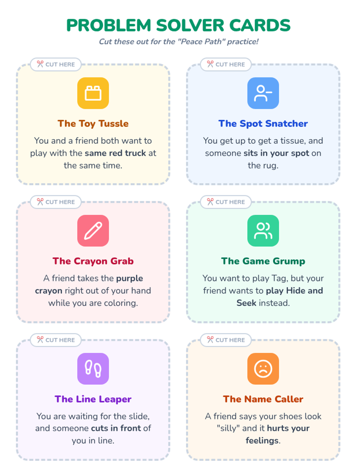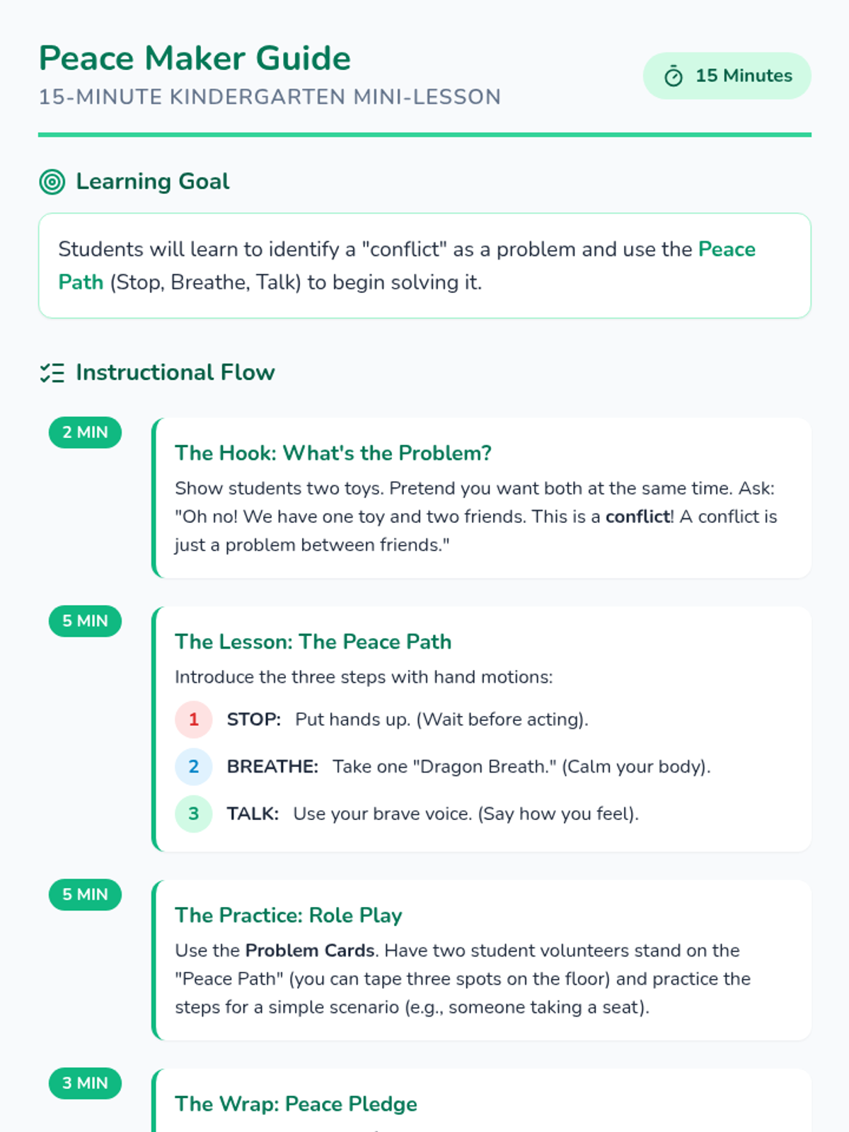 A quick, 15-minute introduction to conflict resolution for kindergarteners, focusing on identifying feelings and using a simple three-step 'Peace Path' to solve problems.