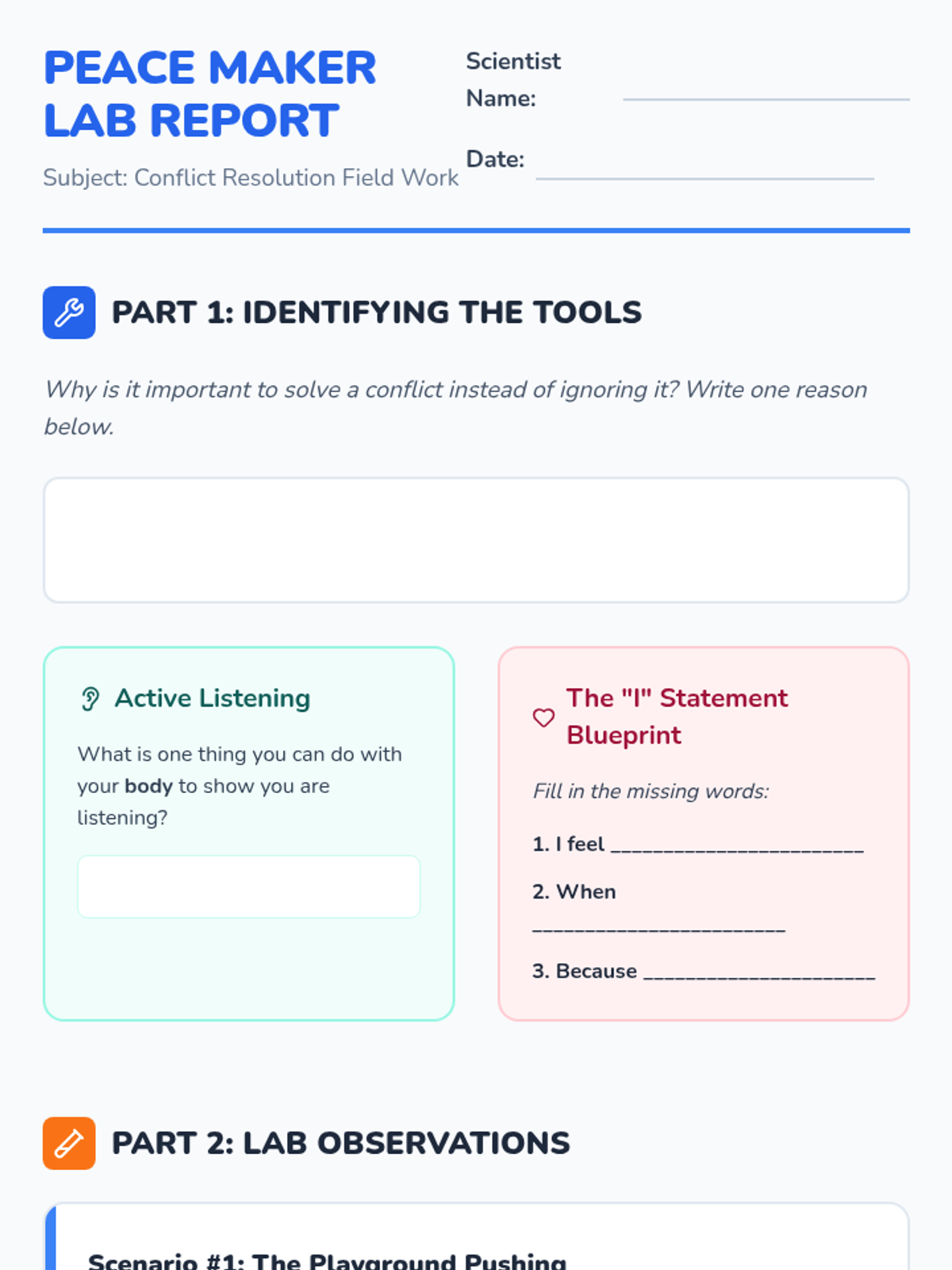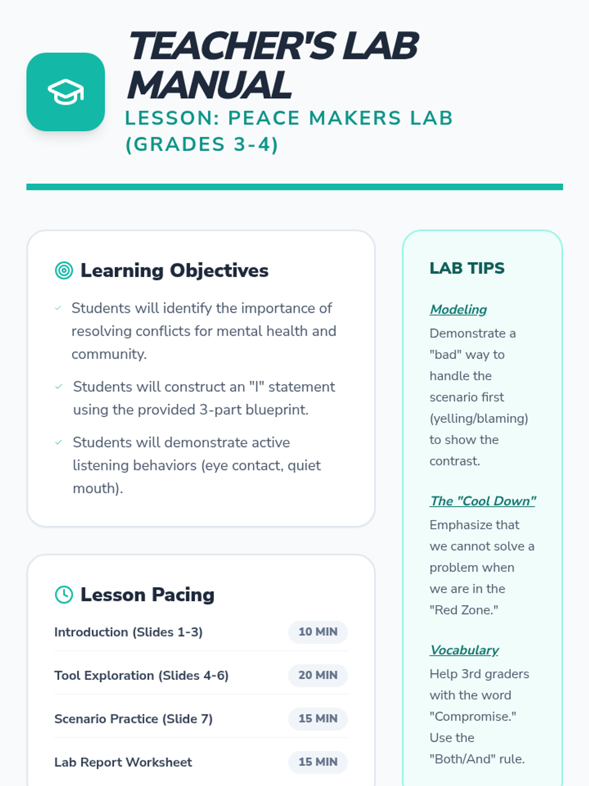 A comprehensive lesson teaching 3rd and 4th graders how to navigate disagreements using 'I' statements, active listening, and collaborative problem-solving.