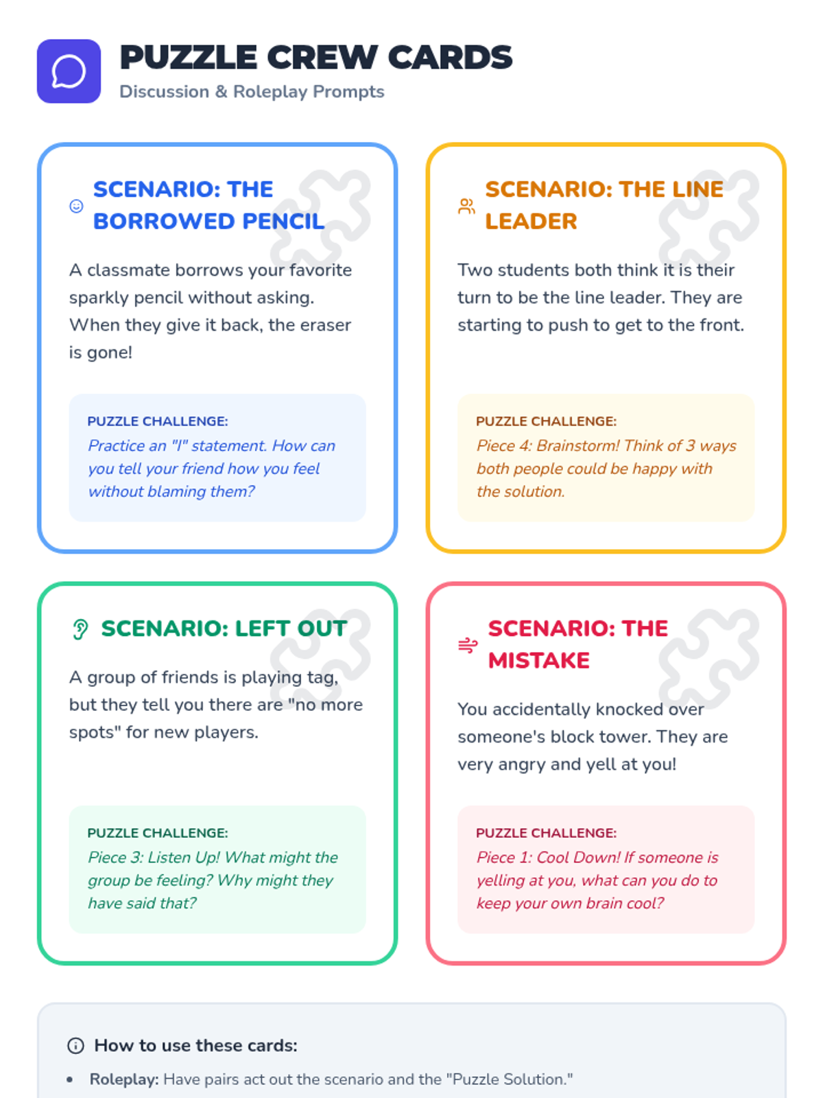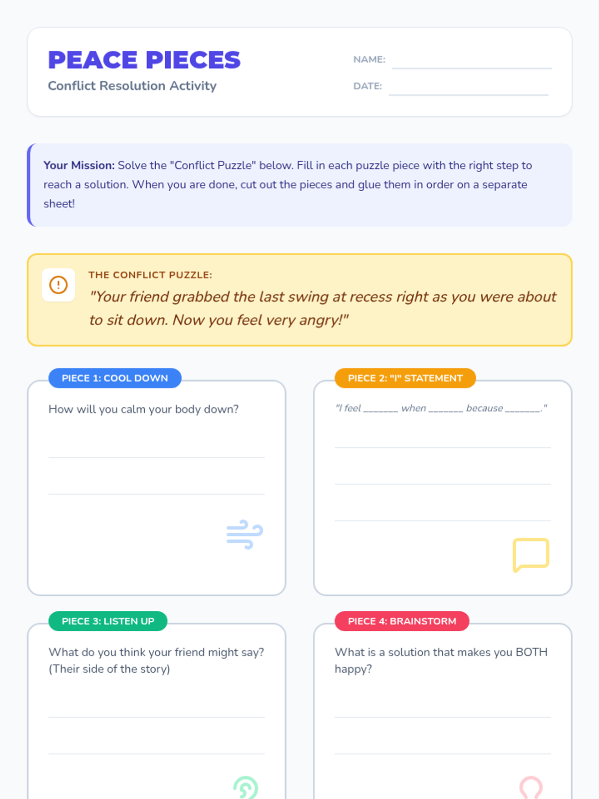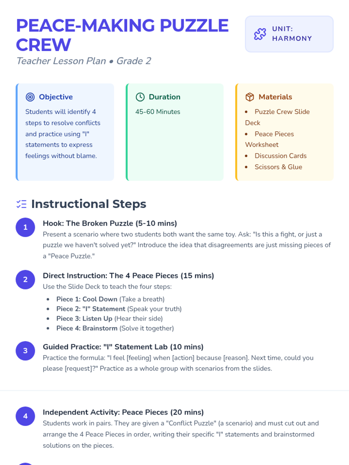 A 2nd-grade lesson that transforms conflict resolution into a collaborative 'puzzle-solving' mission. Students learn to use 'I' statements and active listening to move from blame to teamwork.