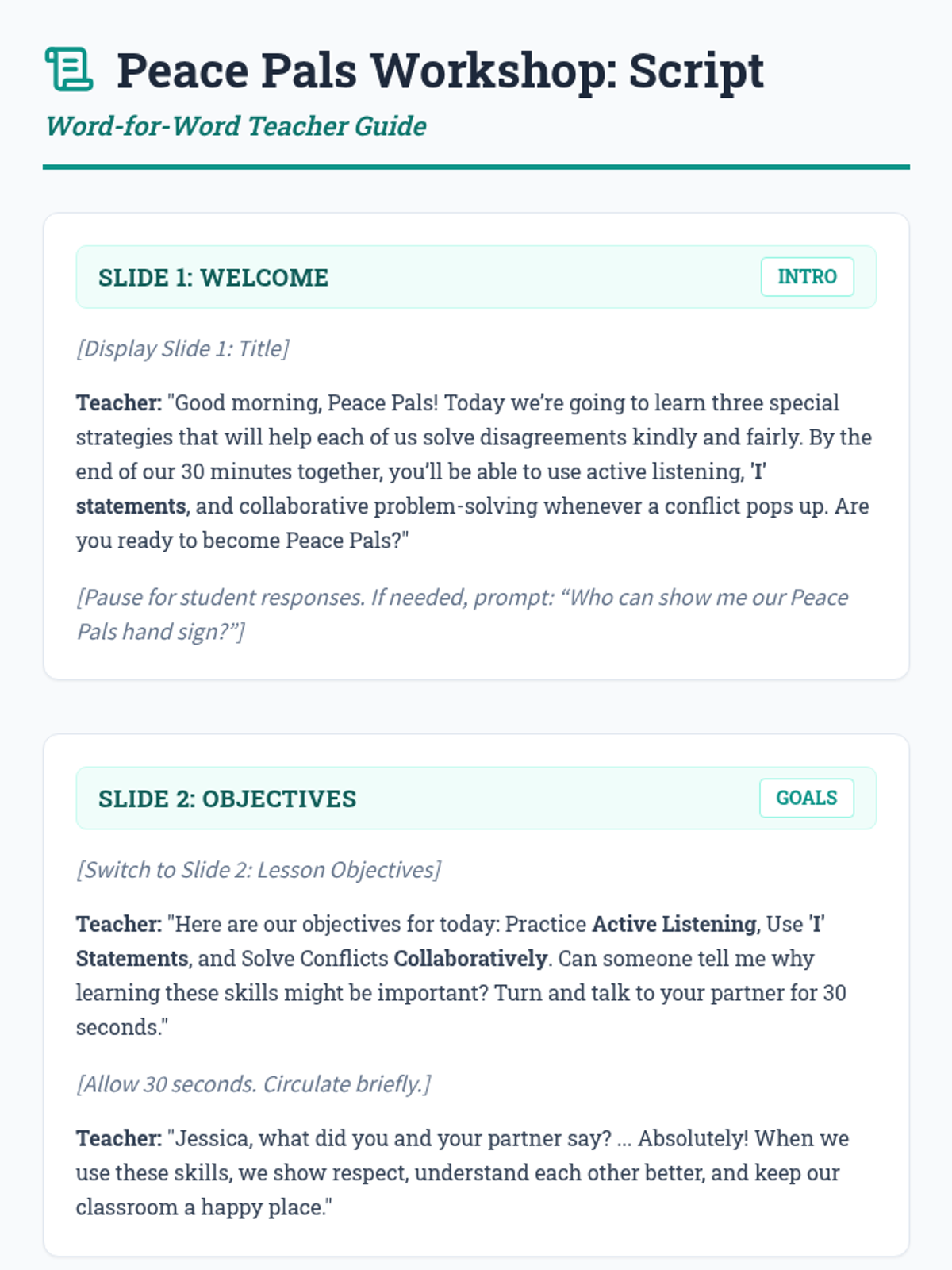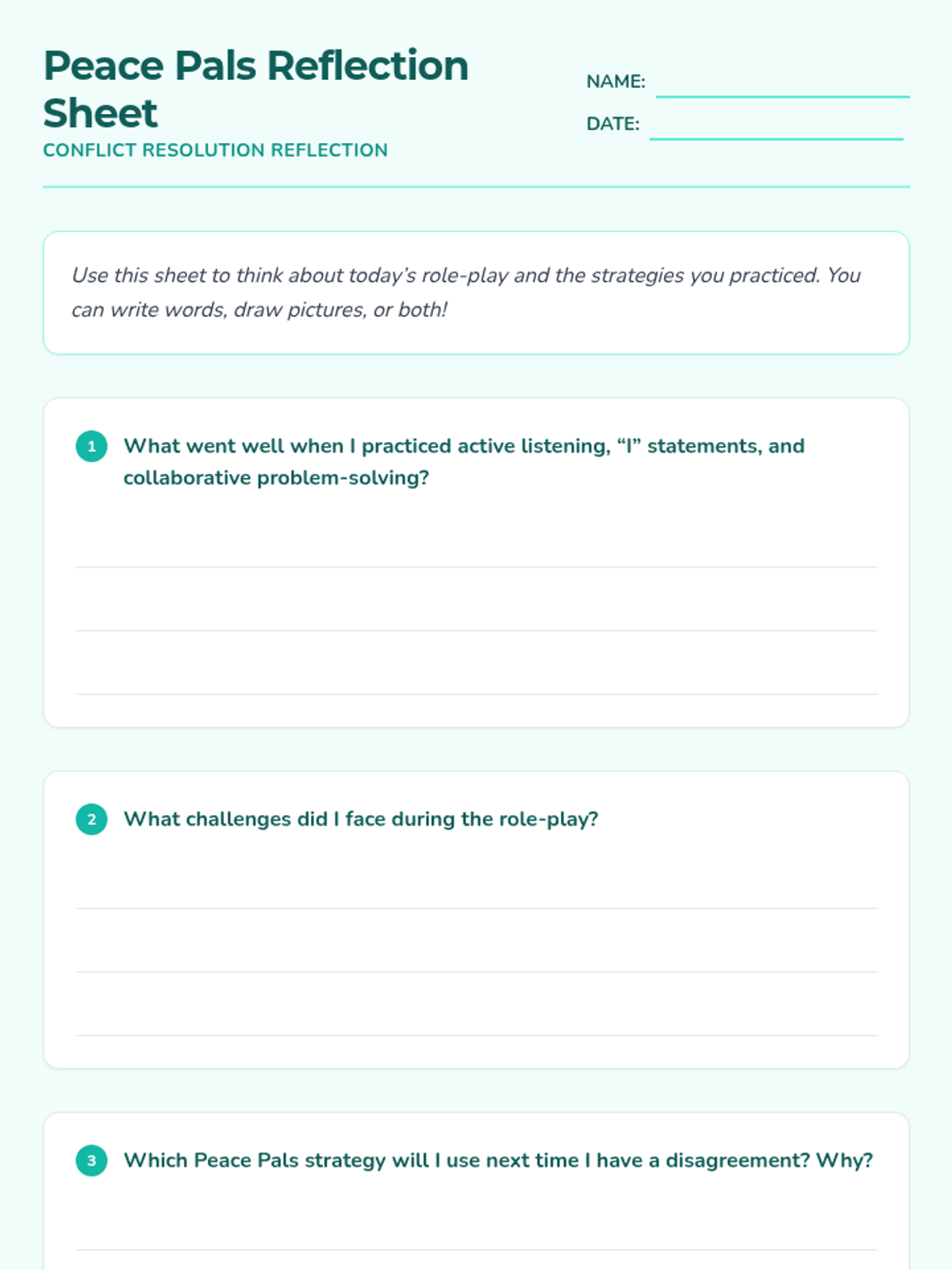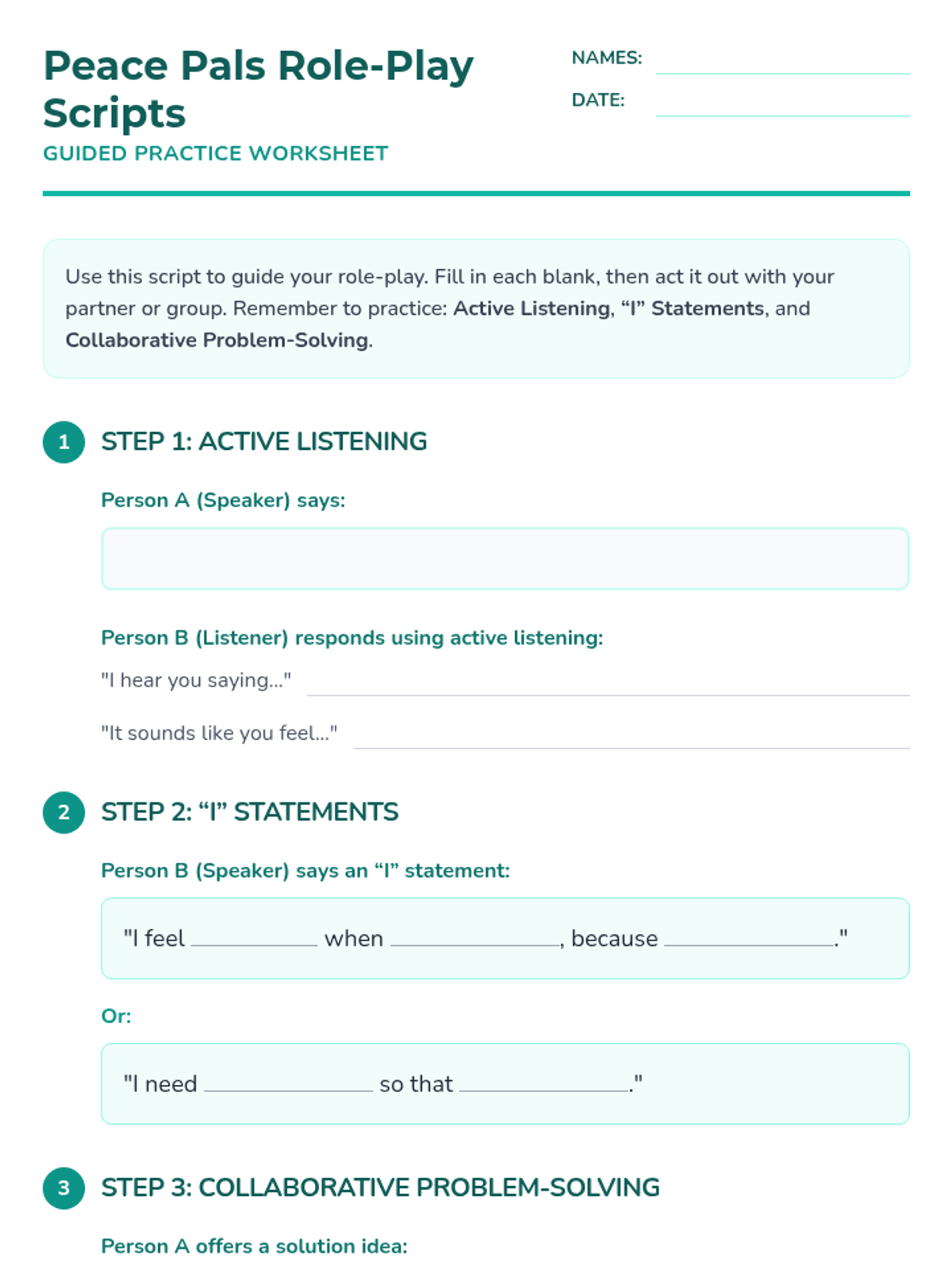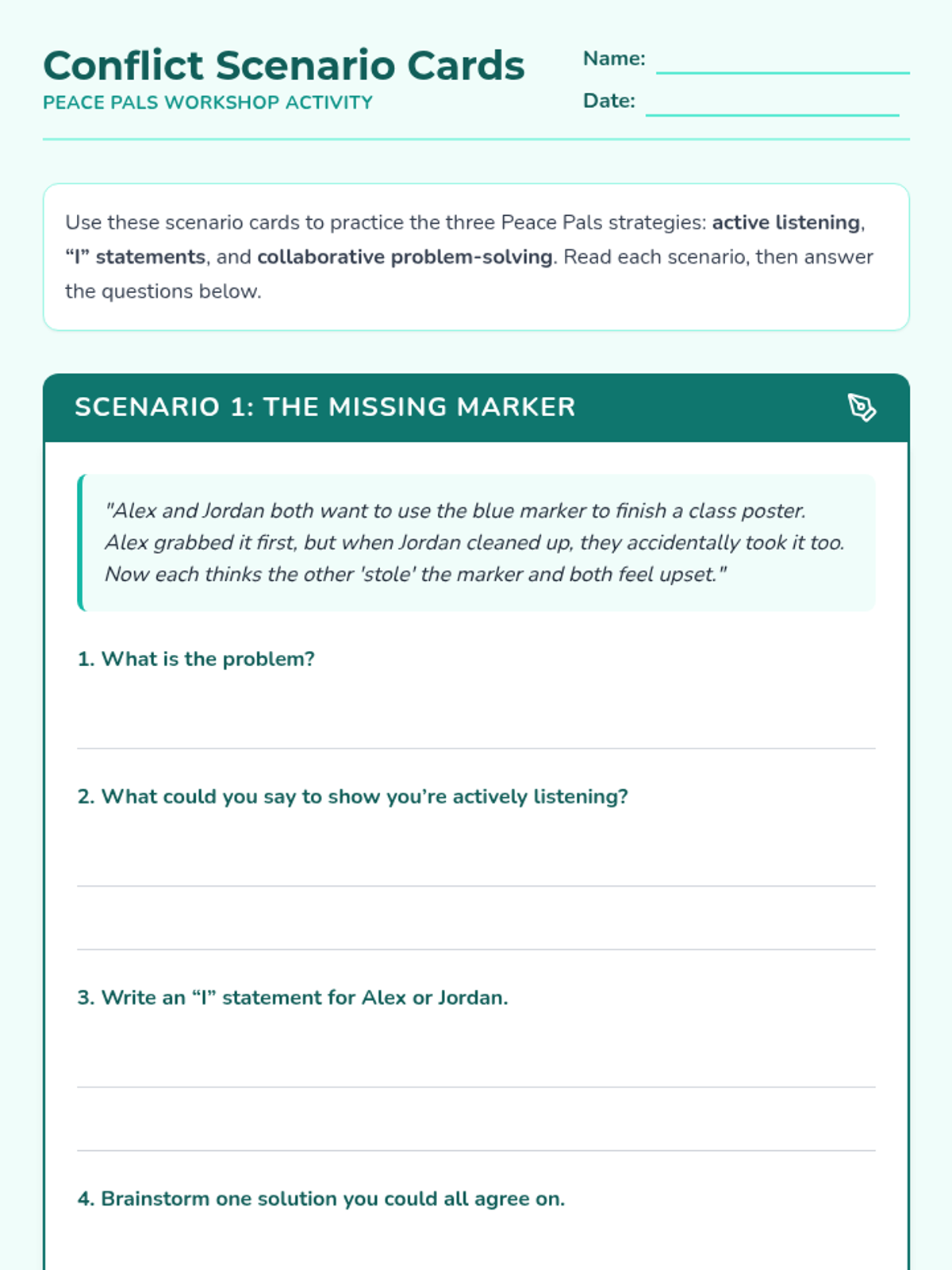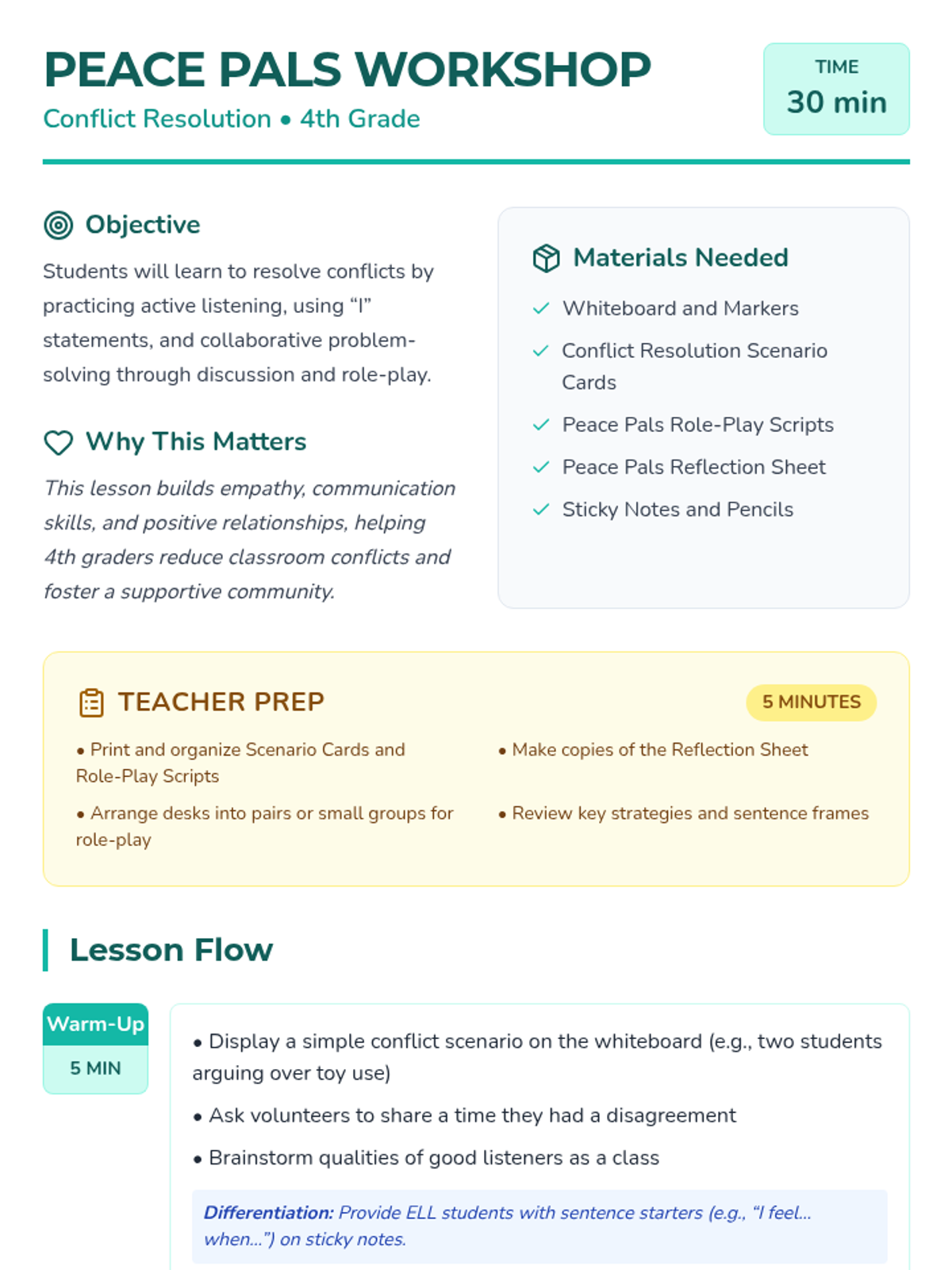 A 30-minute Tier 1 lesson for 4th graders on conflict resolution strategies, including active listening, "I" statements, and collaborative problem-solving.