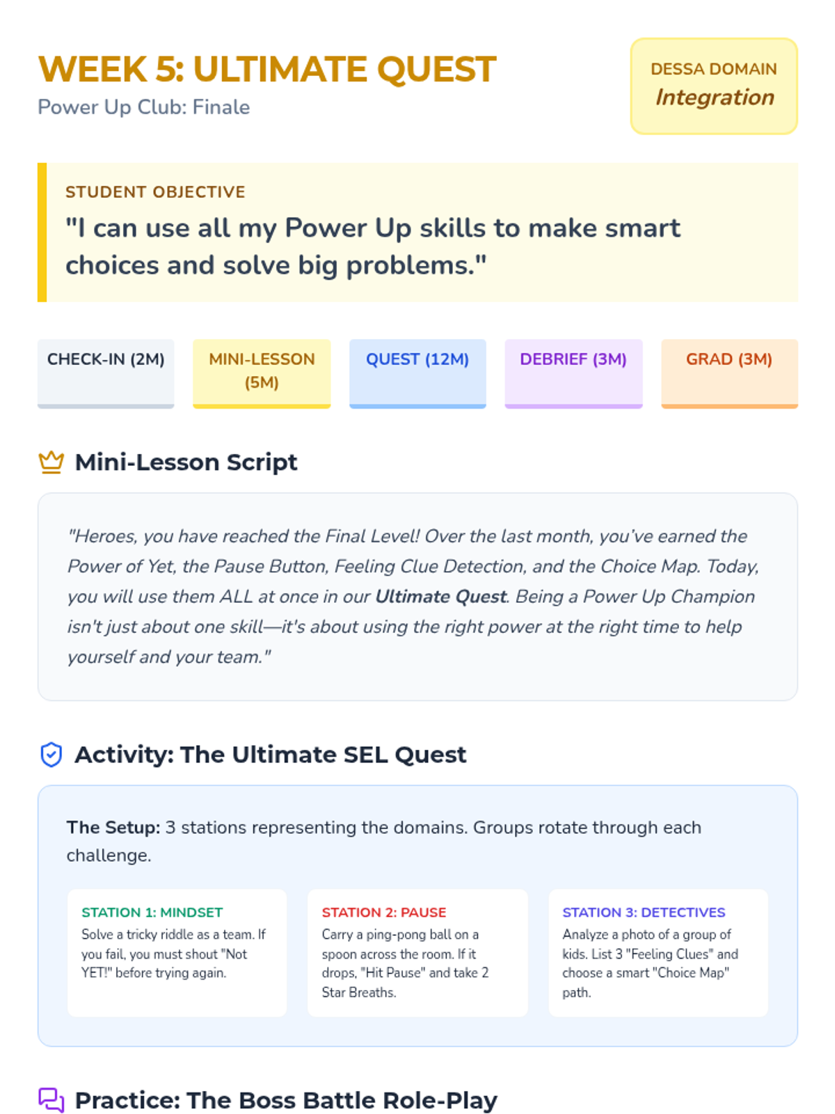 The cumulative session where students apply all learned skills to navigate complex social scenarios. Features a collaborative quest that requires teamwork and self-regulation.