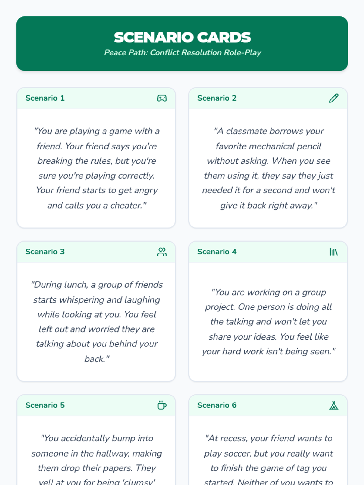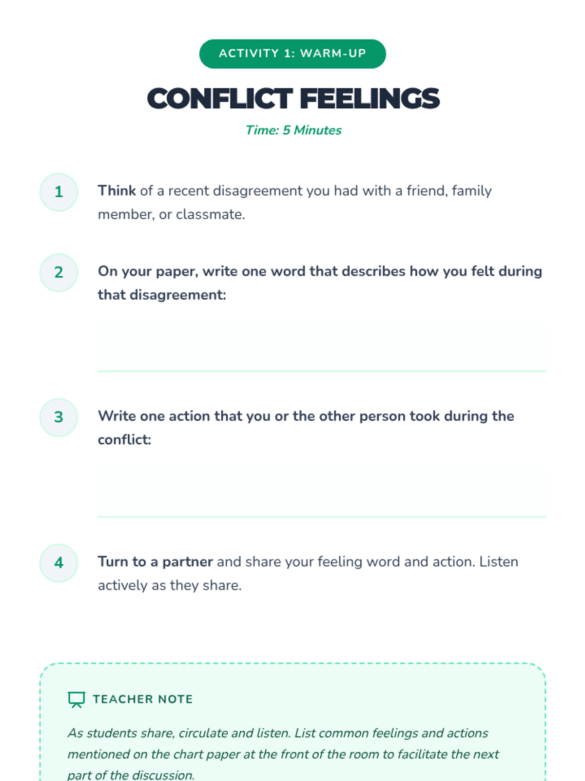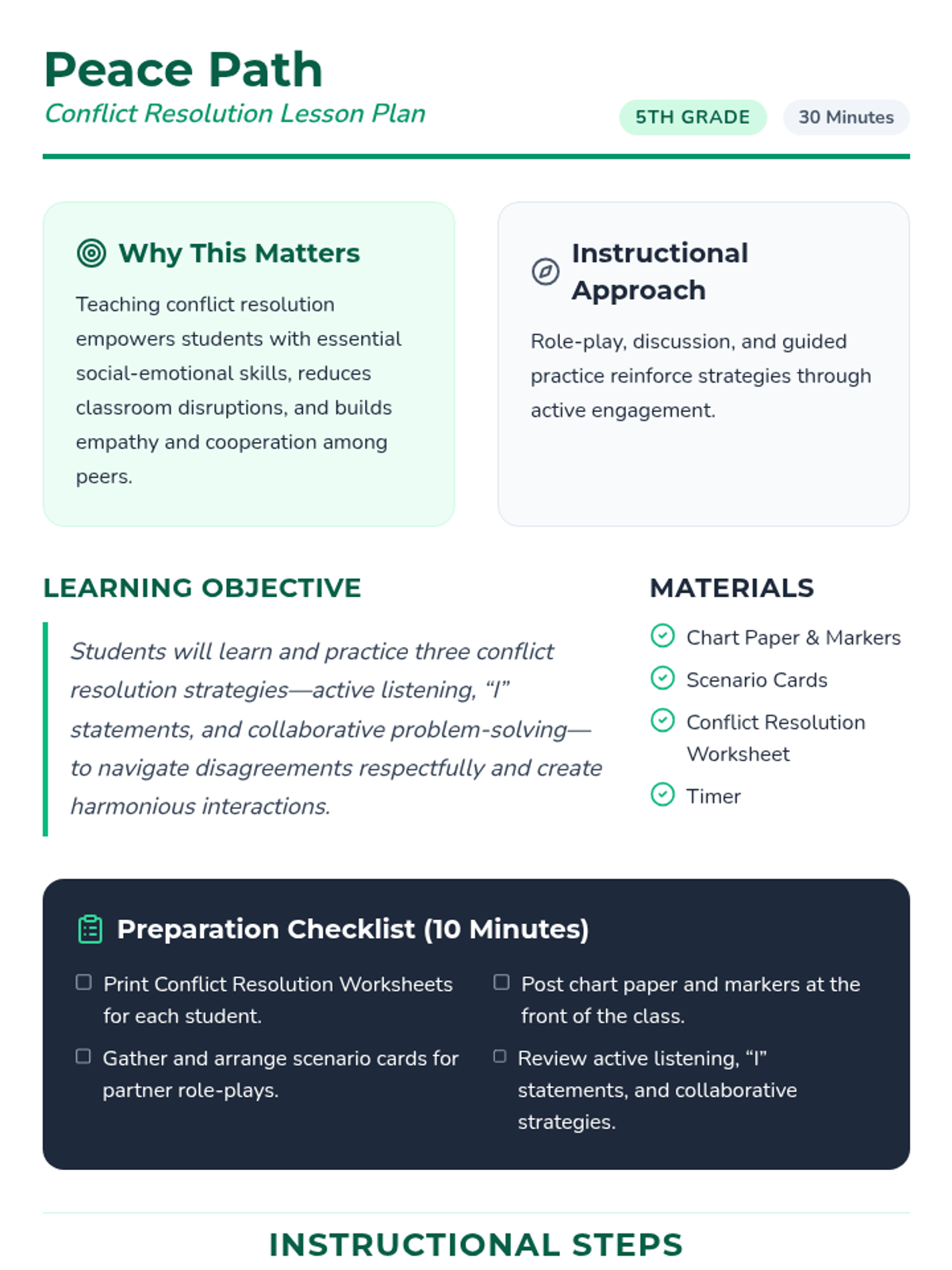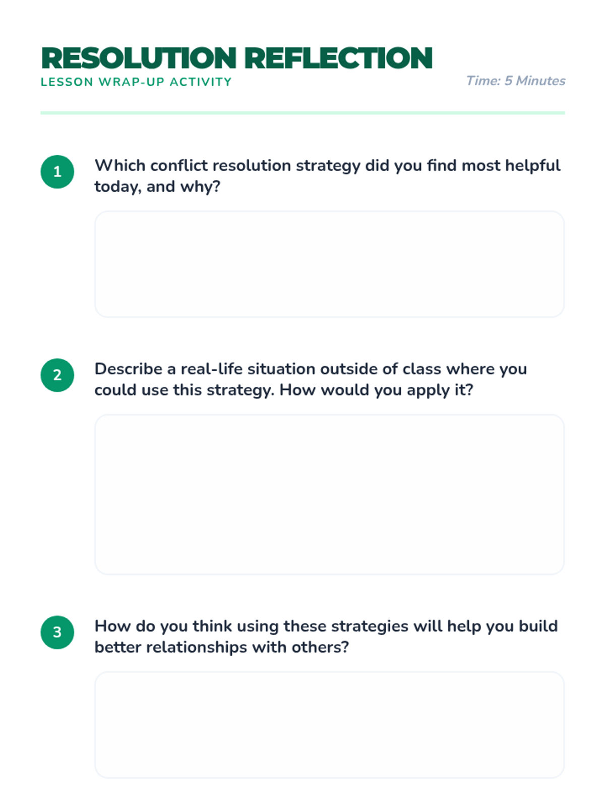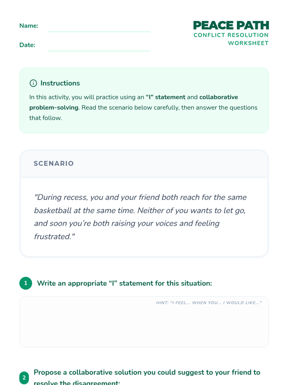 In this engaging 30-minute lesson, 5th graders will learn practical conflict resolution strategies to navigate disagreements respectfully. Students will practice active listening, “I” statements, and collaborative problem-solving—skills that foster empathy and harmony in the classroom and beyond.