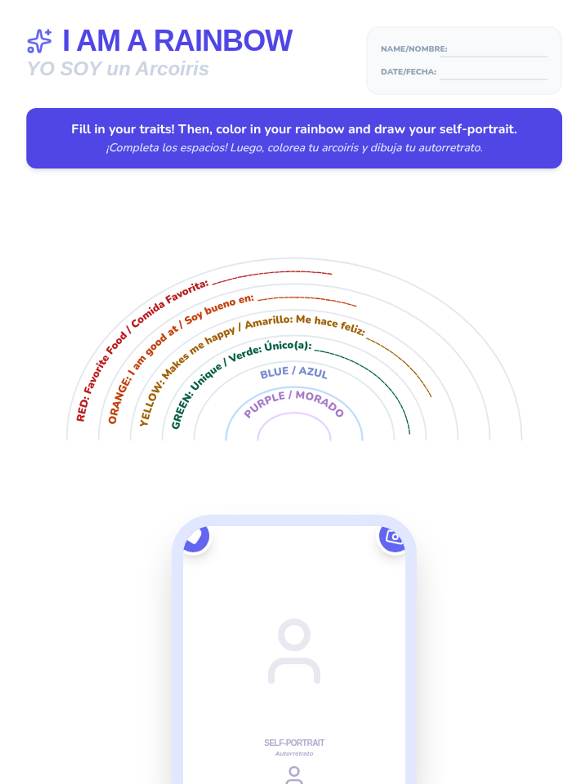 A bilingual (English/Spanish) lesson for 2nd graders exploring human diversity and self-acceptance through the book 'All People Are Beautiful'. Students celebrate their unique traits by creating a 'I am a Rainbow' self-portrait.