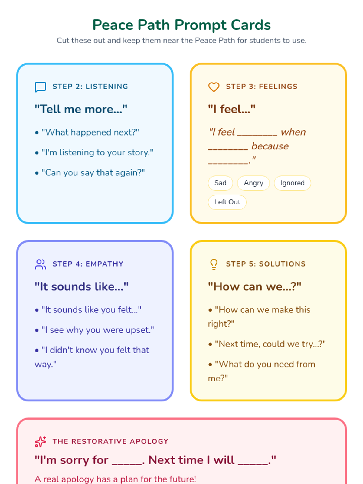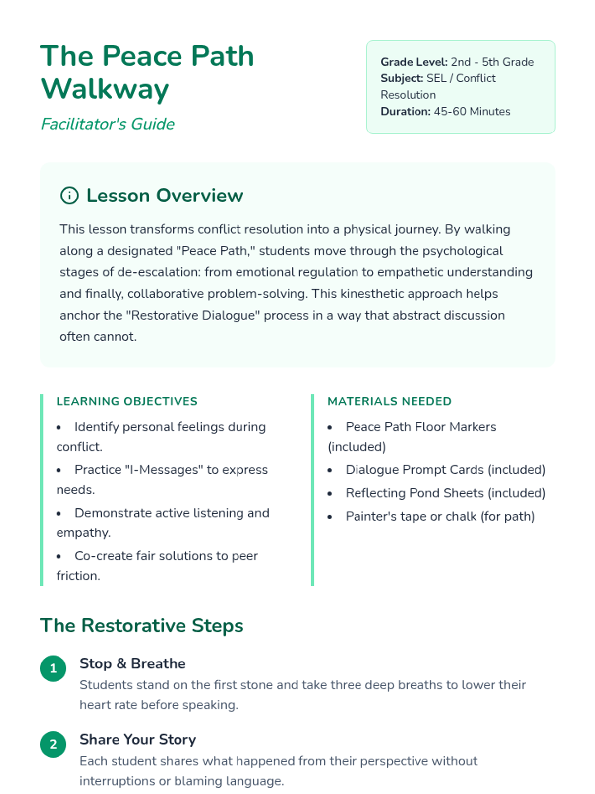 A kinesthetic conflict-resolution lesson where students walk through a physical 'Peace Path' to practice restorative dialogue and empathy. Students learn to de-escalate friction and find mutually beneficial solutions through movement and guided prompts.
