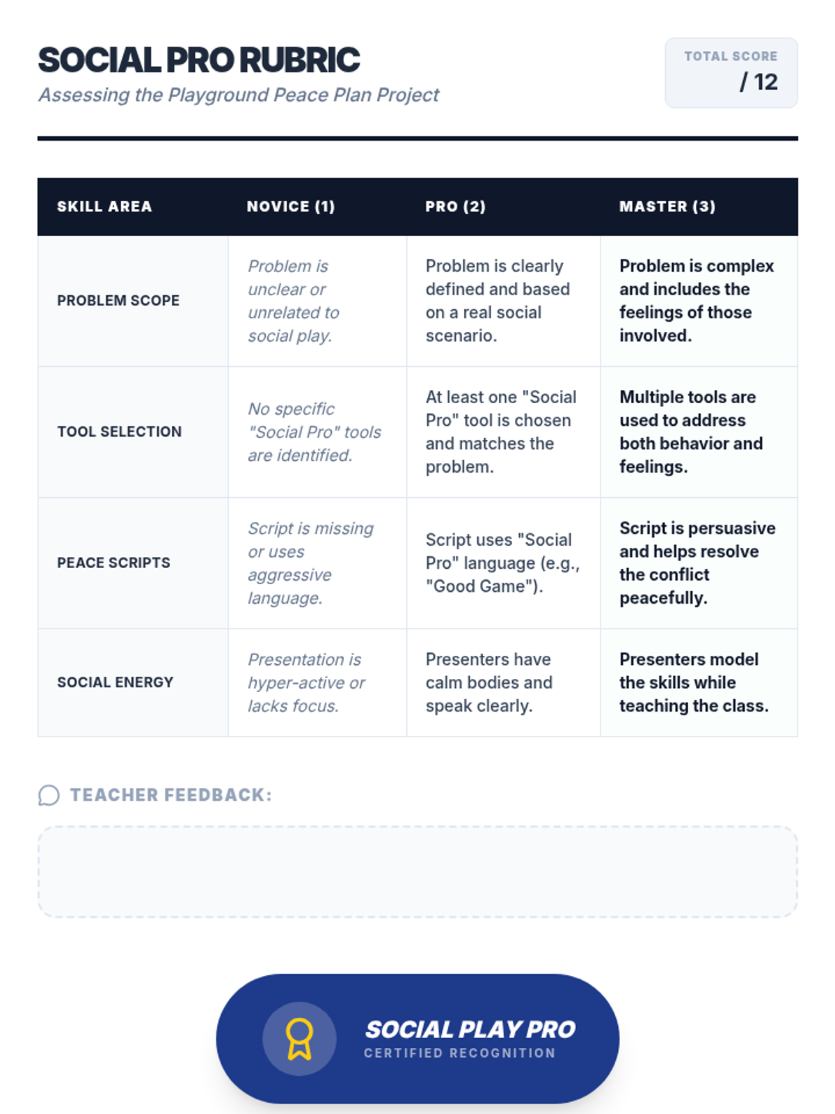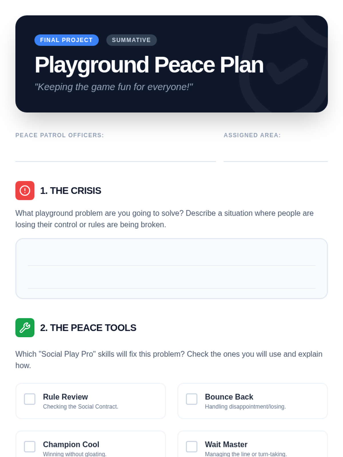 A summative project where students synthesize their learning to create a 'Playground Peace Plan' for resolving social disputes.