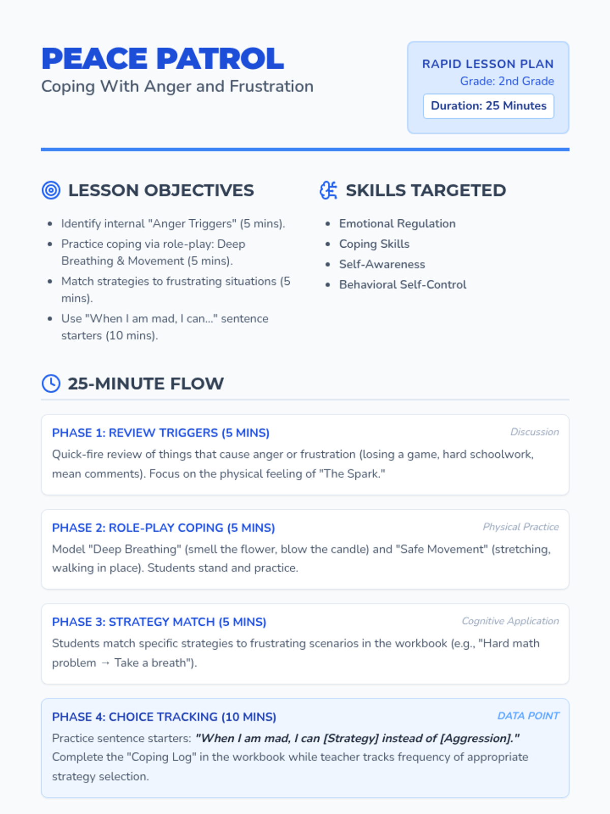 A comprehensive social-emotional learning lesson for 2nd graders focused on resolving peer conflicts and following adult directions using non-violent strategies like walking away and using assertive communication.