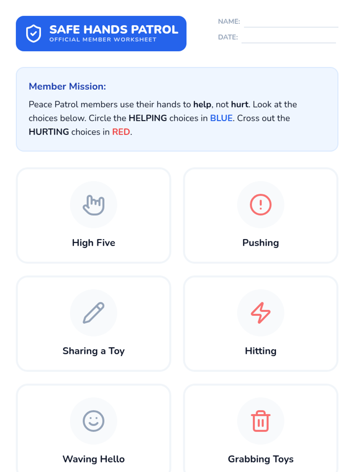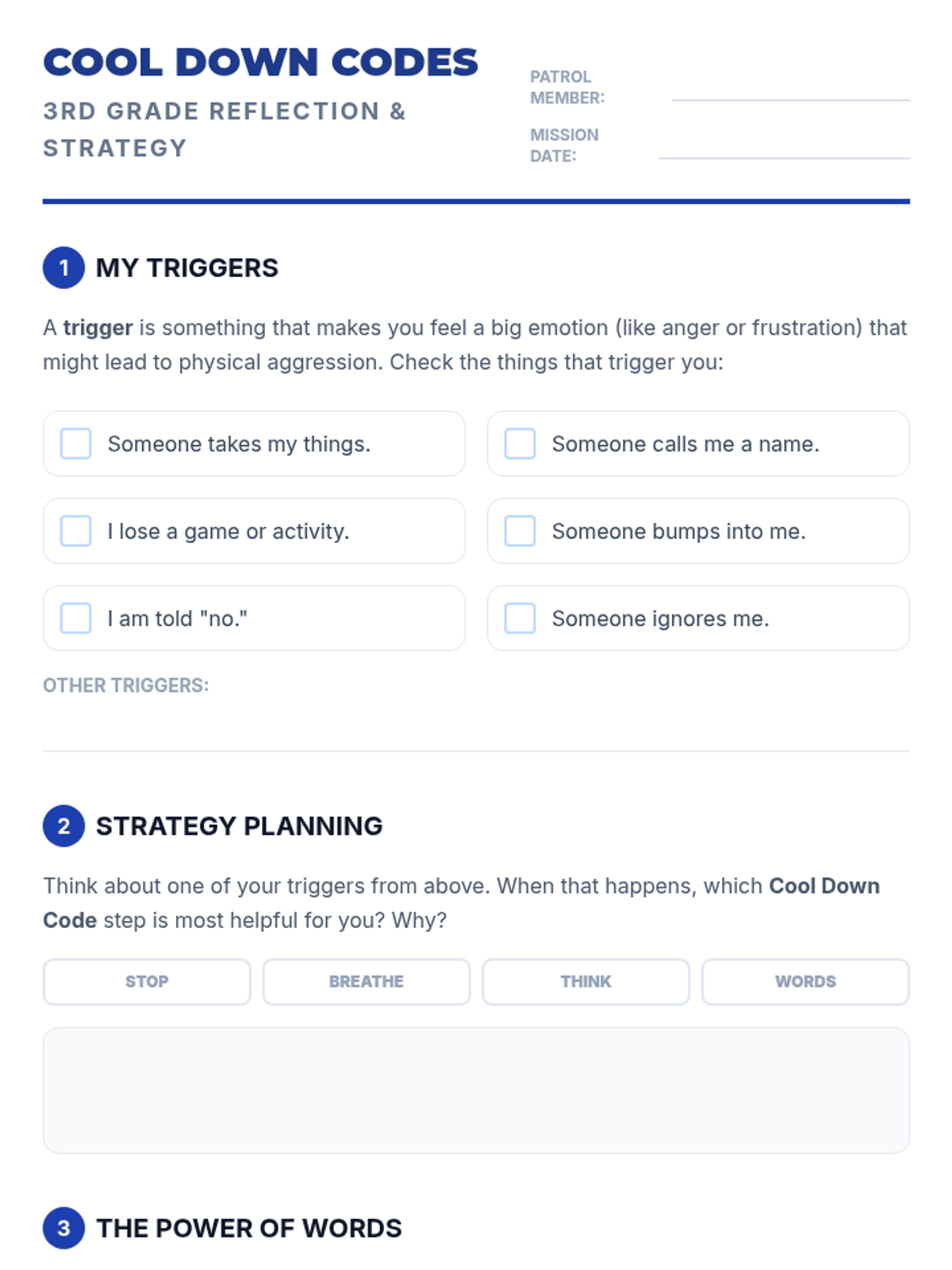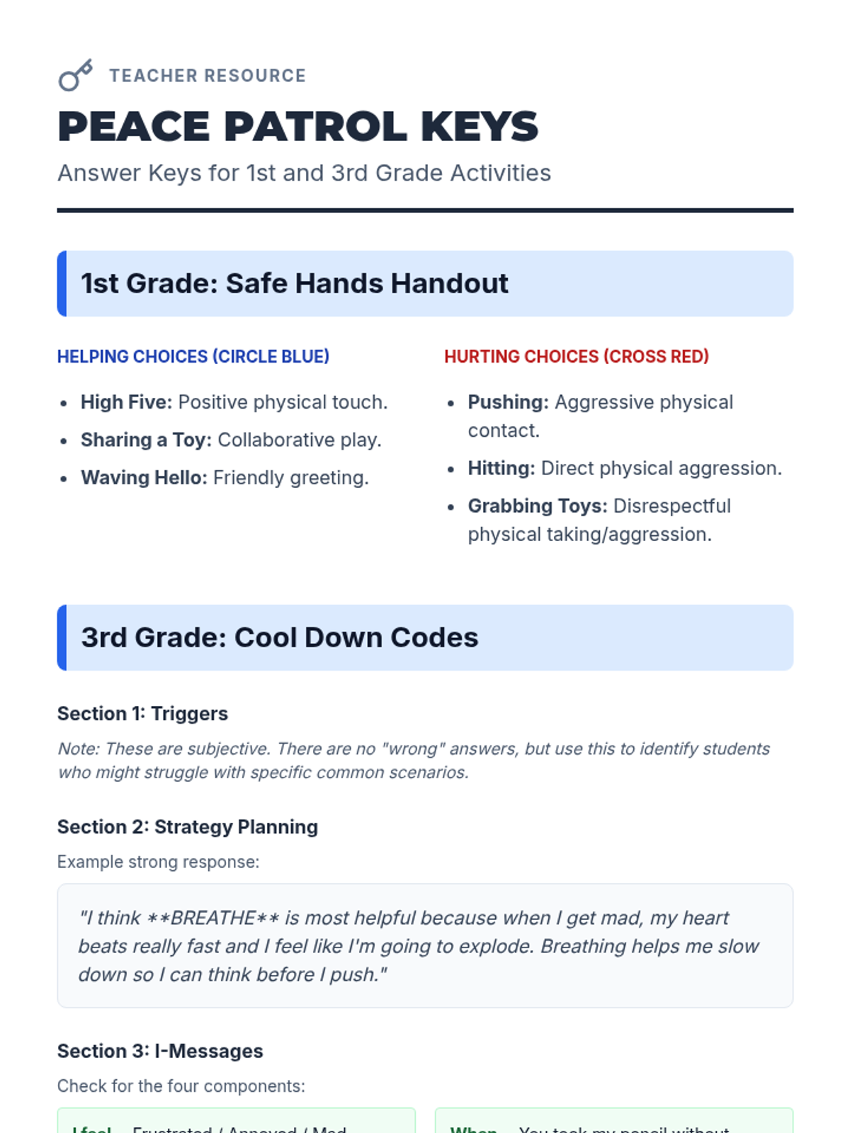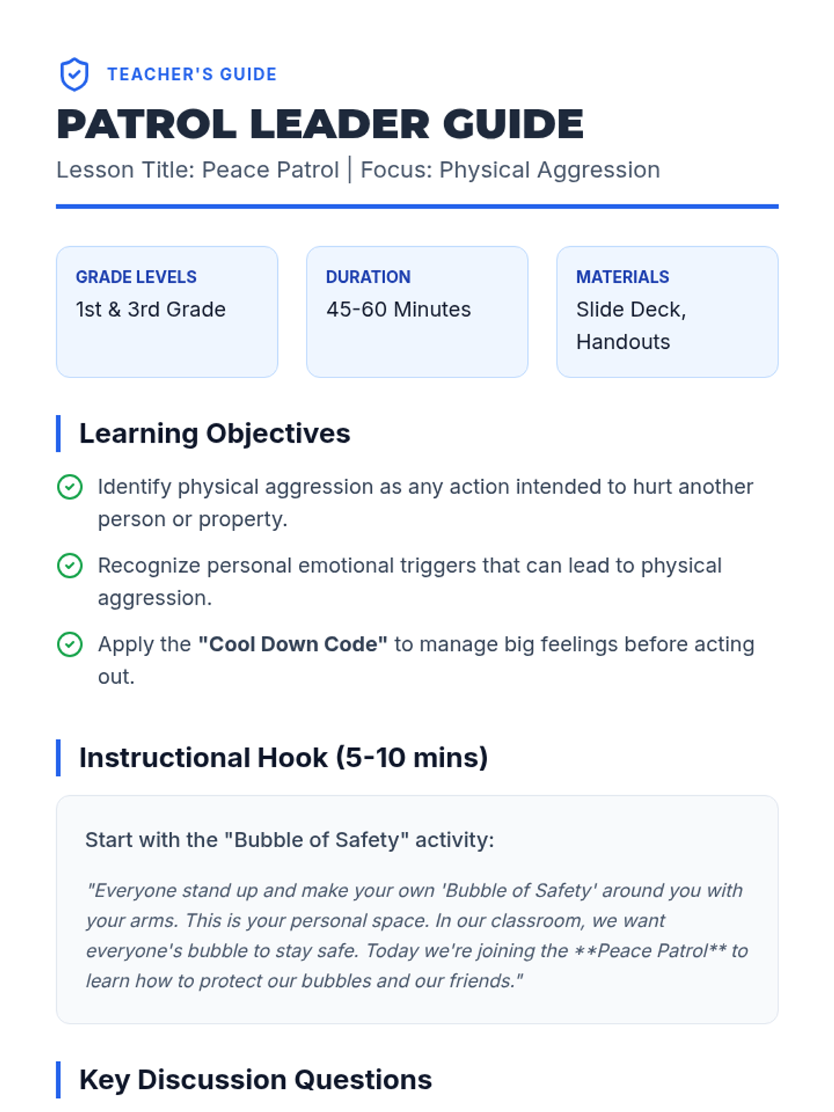 A comprehensive social-emotional learning lesson focused on identifying physical aggression, understanding triggers, and practicing self-regulation strategies. Designed for 1st and 3rd grade classrooms with differentiated activities.