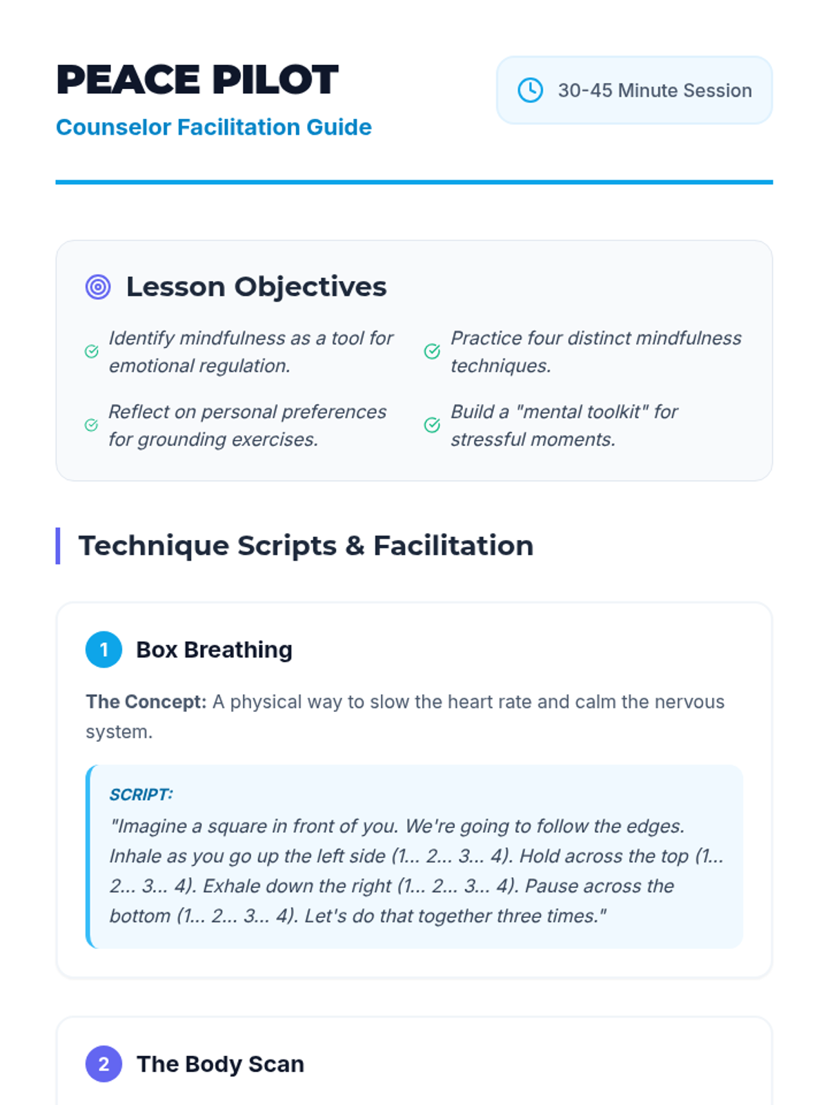 A comprehensive mindfulness lesson for school counselors to use with K-12 students in small groups, covering breathing, body scans, listening, and journaling.