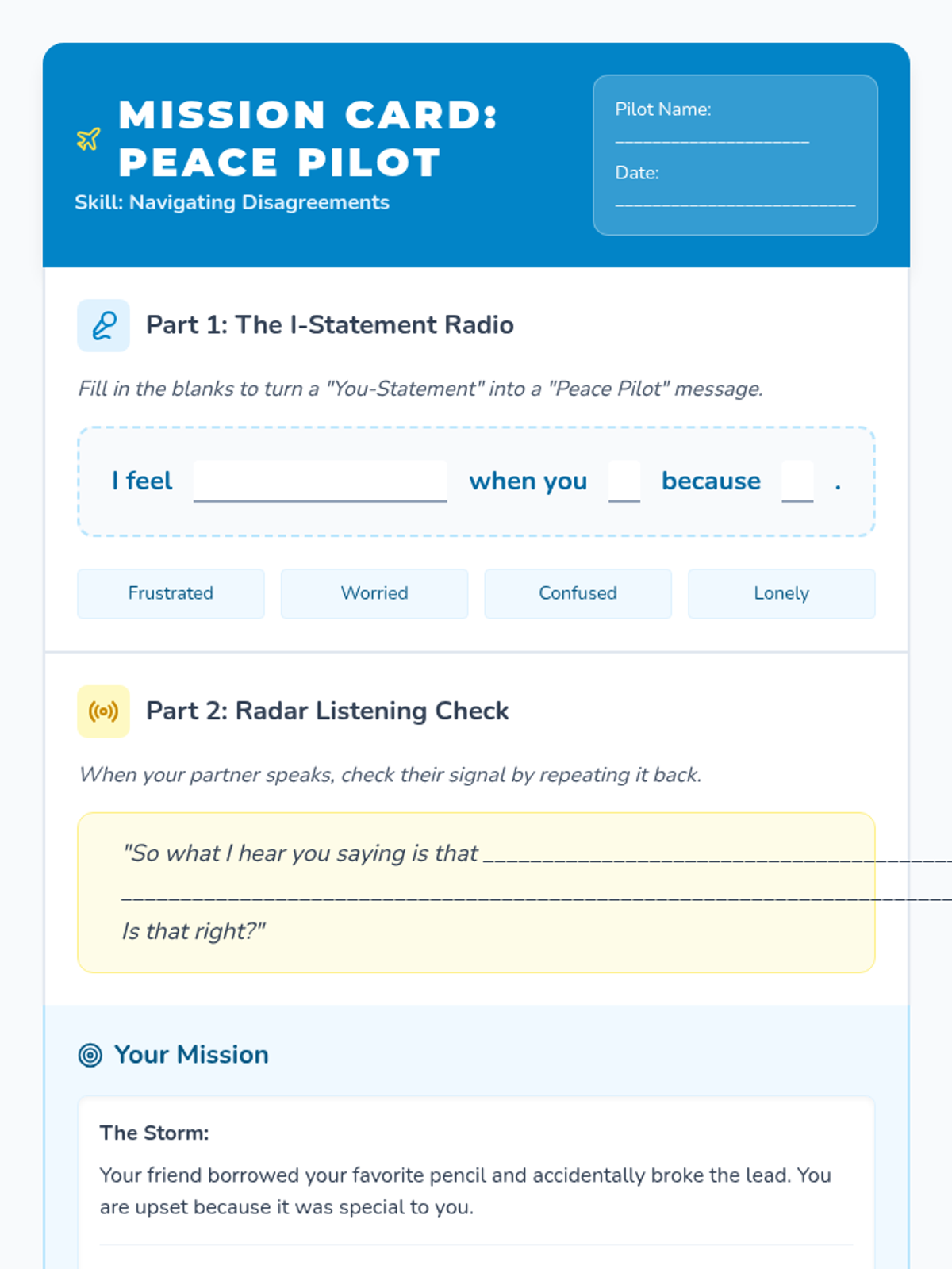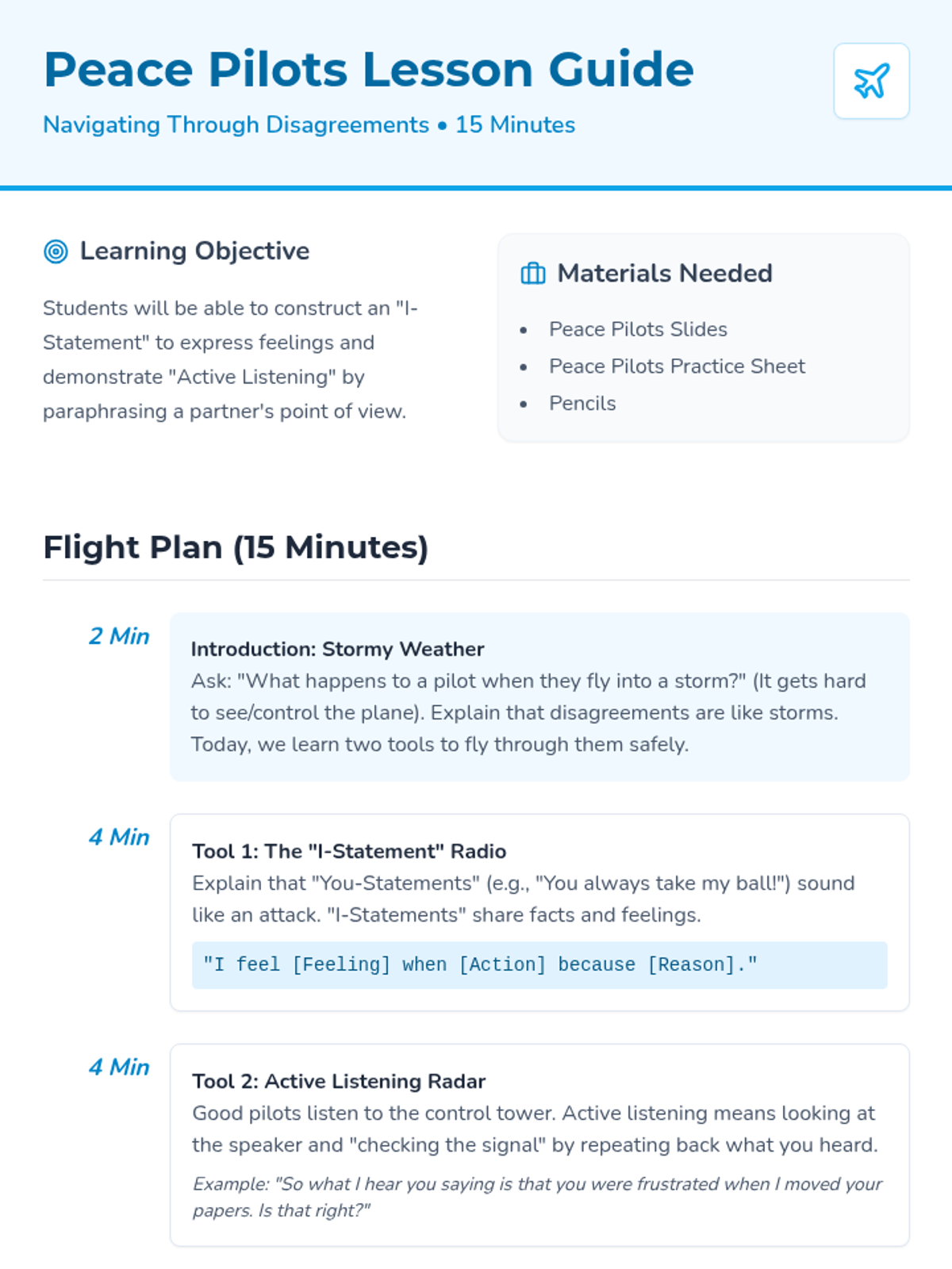 A quick, high-impact social-emotional learning lesson designed to give students two practical tools for resolving conflicts: I-Statements and Active Listening. This 15-minute session uses a 'Peace Pilot' theme to help students navigate through the 'stormy weather' of disagreements.
