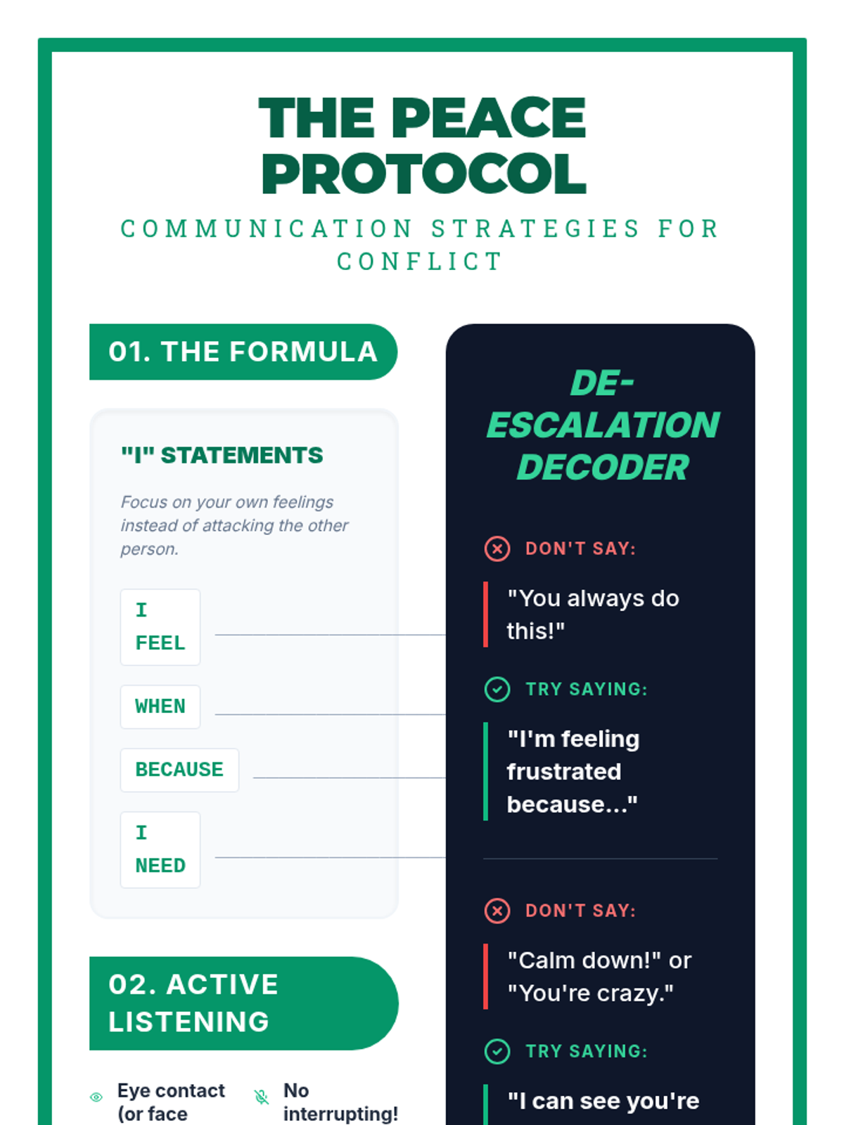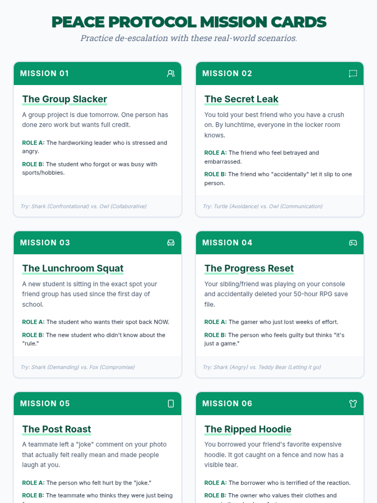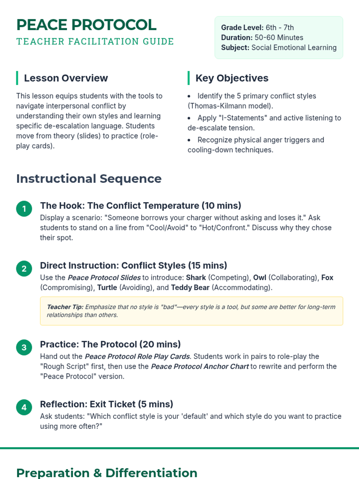 A middle school lesson focused on identifying conflict styles, managing intense emotions during disagreements, and practicing de-escalation techniques through role-play.