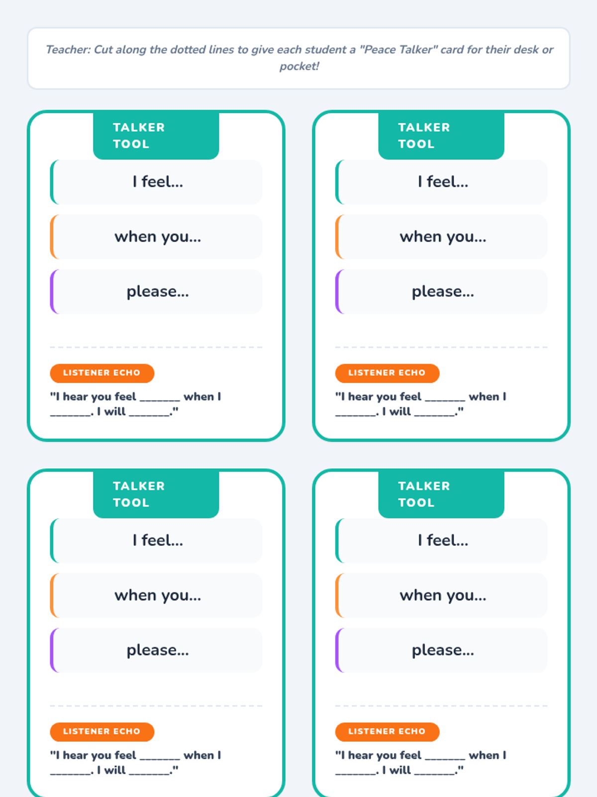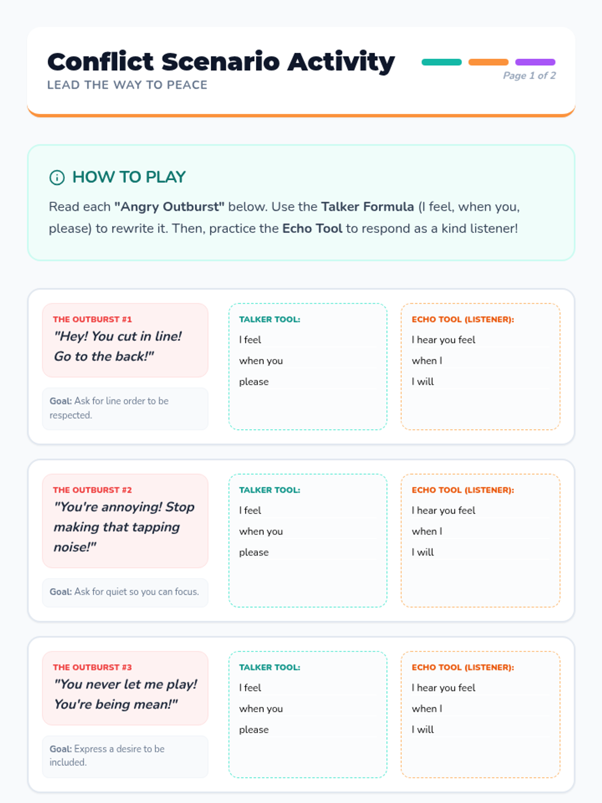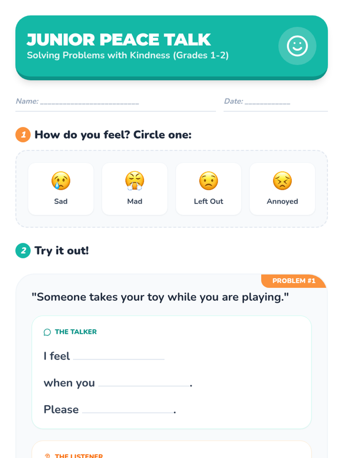 A 20-minute lesson on resolving conflicts with kindness and respect using 'I-statements' to express feelings and needs without blame.